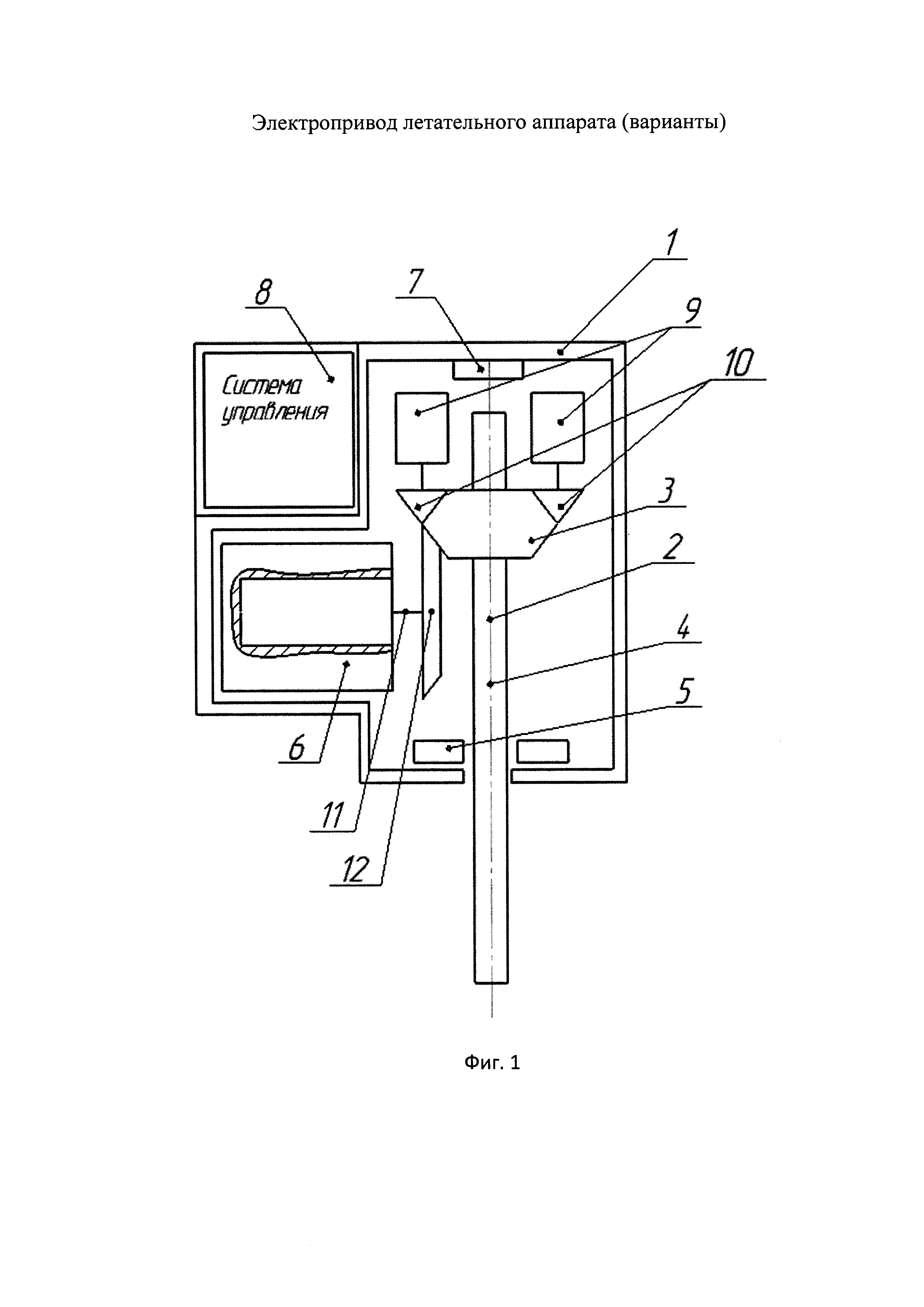 1. Электропривод для летательных аппаратов, содержащий корпус, шарико-винтовую пару, состоящую из гайки и винта, аксиальный подшипник, электродвигатель, зубчатую передачу, датчик положения ротора, демпфер, систему управления, отличающийся тем, что гайка шарико-винтовой пары выполнена в виде двухстороннего конического зубчатого колеса, демпфер выполнен в виде n-электромеханических демпферов с электромагнитным возбуждением, соединенных с гайкой шарико-винтовой передачи через зубчатые колеса, вал электродвигателя расположен перпендикулярно винту шарико-винтовой передачи и соединен с гайкой шарико-винтовой передачи также через зубчатое колесо, при этом система управления выполнена с возможностью отключения и включения электромагнитного возбуждения демпферов и пуска/останова электродвигателя, причем система управления выполнена с соблюдением условия, что при пуске двигателя электромагнитное возбуждение демпфера снижается до значения, при котором демпфер поглощает не более 0,5% энергии в системе, а при останове электродвигателя - повышается до номинального значения. 2. Электропривод для летательных аппаратов, содержащий корпус, шарико-винтовую пару, состоящую из гайки и винта, аксиальный подшипник, электродвигатель, зубчатую передачу, датчик положения ротора, демпфер, систему управления, отличающийся тем, что гайка шарико-винтовой пары выполнена в виде двухстороннего конического зубчатого колеса, электродвигатель выполнен с коническим ротором, демпфер выполнен в виде n-электромеханических демпферов с электромагнитным возбуждением, соединенных с гайкой шарико-винтовой передачи через зубчатые колеса, вал электродвигателя расположен перпендикулярно винту шарико-винтовой передачи и соединен с гайкой шарико-винтовой передачи также через зубчатое колесо, причем между зубчатым колесом электродвигателя и гайкой шарико-винтовой передачи имеется зазор, при этом система управления выполнена с возможностью отключения и включения электромагнитного возбуждения демпферов и пуска/останова электродвигателя, причем система управления выполнена с соблюдением условия, что при пуске двигателя электромагнитное возбуждение демпфера снижается до значения, при котором демпфер поглощает не более 0,5% энергии в системе, а при останове электродвигателя - повышается до номинального значения.