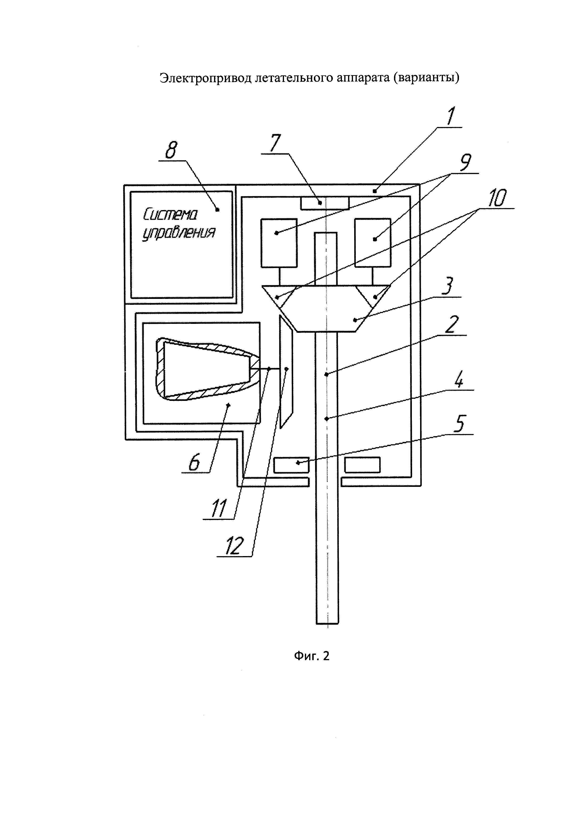Группа изобретений относится к авиакосмическим летательным аппаратам. Электропривод для летательного аппарата содержит корпус, шарико-винтовую пару, состоящую из гайки и винта, аксиальный подшипник, электродвигатель, зубчатую передачу, датчик положения ротора, демпфер и систему управления. Система управления выполнена с возможностью отключения и включения электромагнитного возбуждения демпферов и пуска/останова электродвигателя. По первому варианту гайка шарико-винтовой пары выполнена в виде двухстороннего конического зубчатого колеса. Демпфер выполнен в виде n-электромеханических демпферов с электромагнитным возбуждением, соединенных с гайкой шарико-винтовой передачи через зубчатые колеса. Вал электродвигателя расположен перпендикулярно винту шарико-винтовой передачи и соединен с гайкой шарико-винтовой передачи также через зубчатое колесо. По второму варианту: гайка шарико-винтовой пары выполнена в виде двухстороннего конического зубчатого колеса, электродвигатель выполнен с коническим ротором, демпфер выполнен в виде n-электромеханических демпферов с электромагнитным возбуждением, соединенных с гайкой шарико-винтовой передачи через зубчатые колеса. Вал электродвигателя расположен перпендикулярно винту шарико-винтовой передачи и соединен с гайкой шарико-винтовой передачи также через зубчатое колесо. Группа изобретений направлена на повышение надежности и энергоэффективности электропривода. 2 н.п. ф-лы, 2 ил.