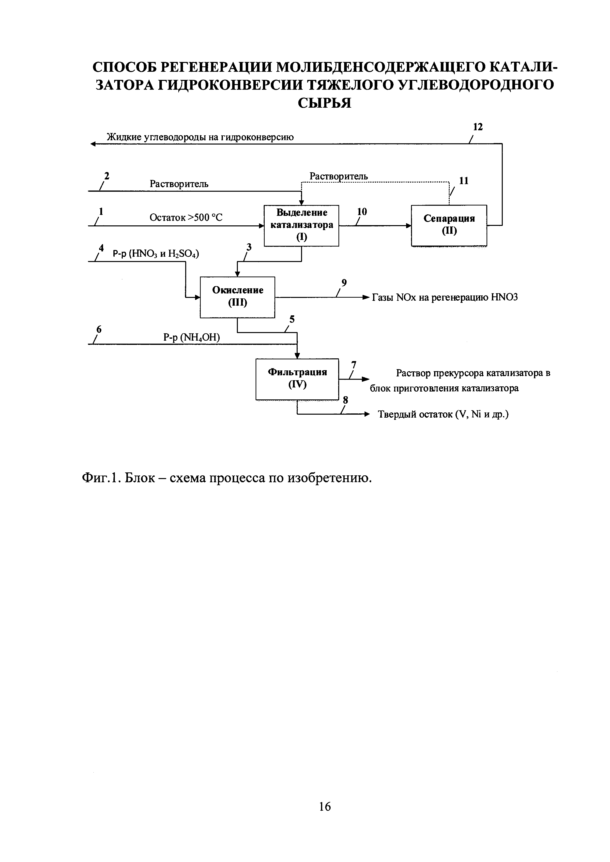 1. Способ регенерации молибденсодержащего катализатора из остатка гидроконверсии тяжелого сырья, включающий стадию выделения концентрата катализатора растворением остатка гидроконверсии, сепарацией полученного раствора на жидкий фильтрат и остаток концентрата катализатора с последующей его сушкой и стадию окисления выделенного концентрата катализатора водным раствором окислителя с выщелачиванием соединения молибдена, отличающийся тем, что в качестве остатка гидроконверсии используют остаток, выкипающий выше 500°С, который растворяют при массовом соотношении остаток гидроконверсии:растворитель 1:2-1:4, фильтрат со стадии выделения концентрата катализатора разделяют на жидкие углеводороды и растворитель, стадию окисления выделенного концентрата катализатора, включающего сульфид молибдена, проводят при температуре от 25 до 100°С, в качестве окислителя используют водный раствор смеси азотной и серной кислот, после чего суспензию катализатора нейтрализуют водным раствором аммиака до получения раствора с рН>6 и фильтруют с выделением водного раствора прекурсора катализатора и твердого остатка фильтрации суспензии, содержащего соединения ванадия и никеля. 2. Способ по п. 1, отличающийся тем, что в качестве растворителя используют толуол, или фракцию НК-120°С продукта гидроконверсии, или легкий газойль каталитического крекинга. 3. Способ по п. 1, отличающийся тем, что растворитель, выделенный после сепарации, возвращают для растворения остатка гидроконверсии. 4. Способ по п. 1, отличающийся тем, что в качестве водного раствора окислителя используют водный раствор, содержащий от 600 до 800 г/л HNO3 и от 100 до 200 г/л H2SO4. 5. Способ по п. 1 или 4, отличающийся тем, что окисление концентрата катализатора проводят от 30 до 360 минут.