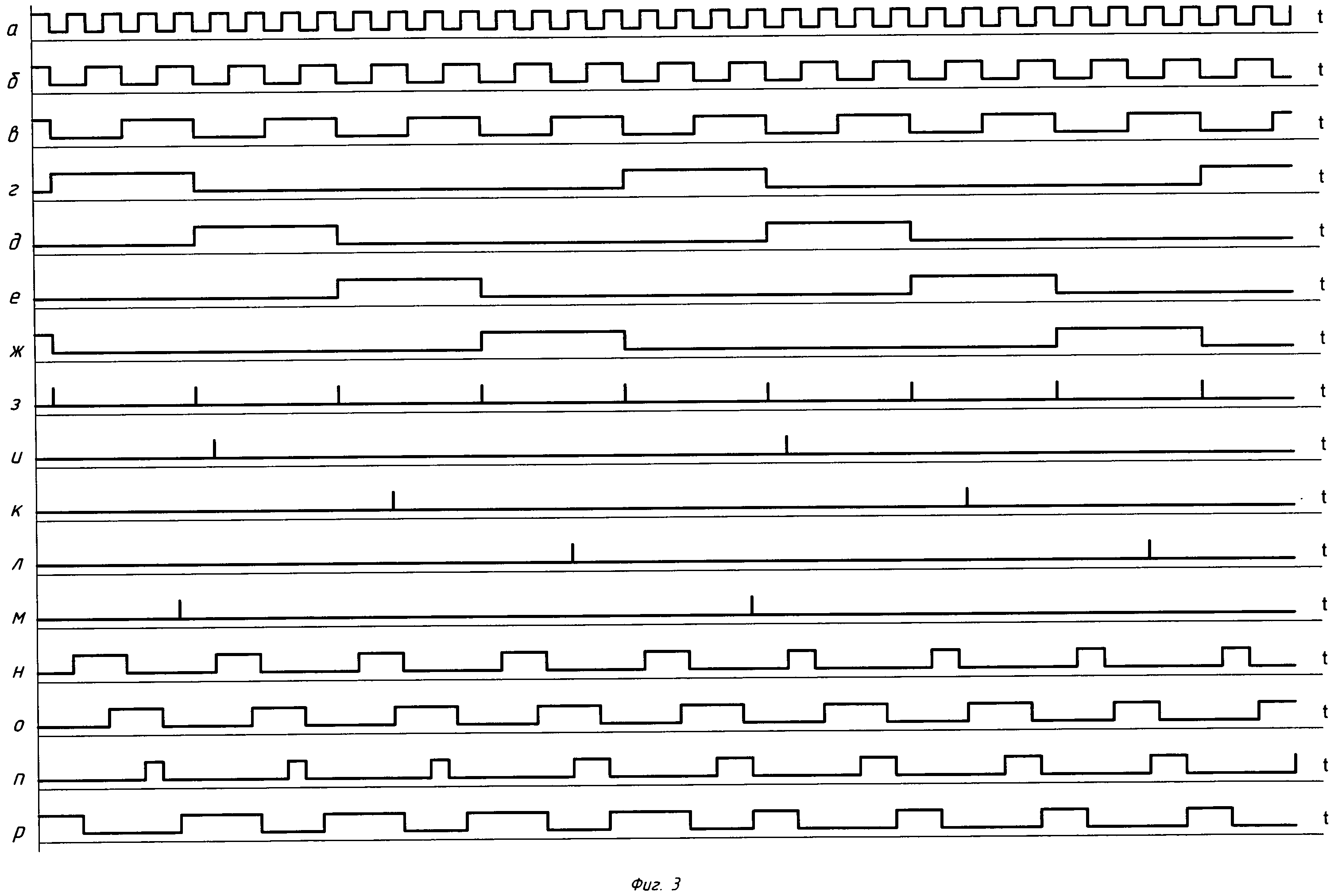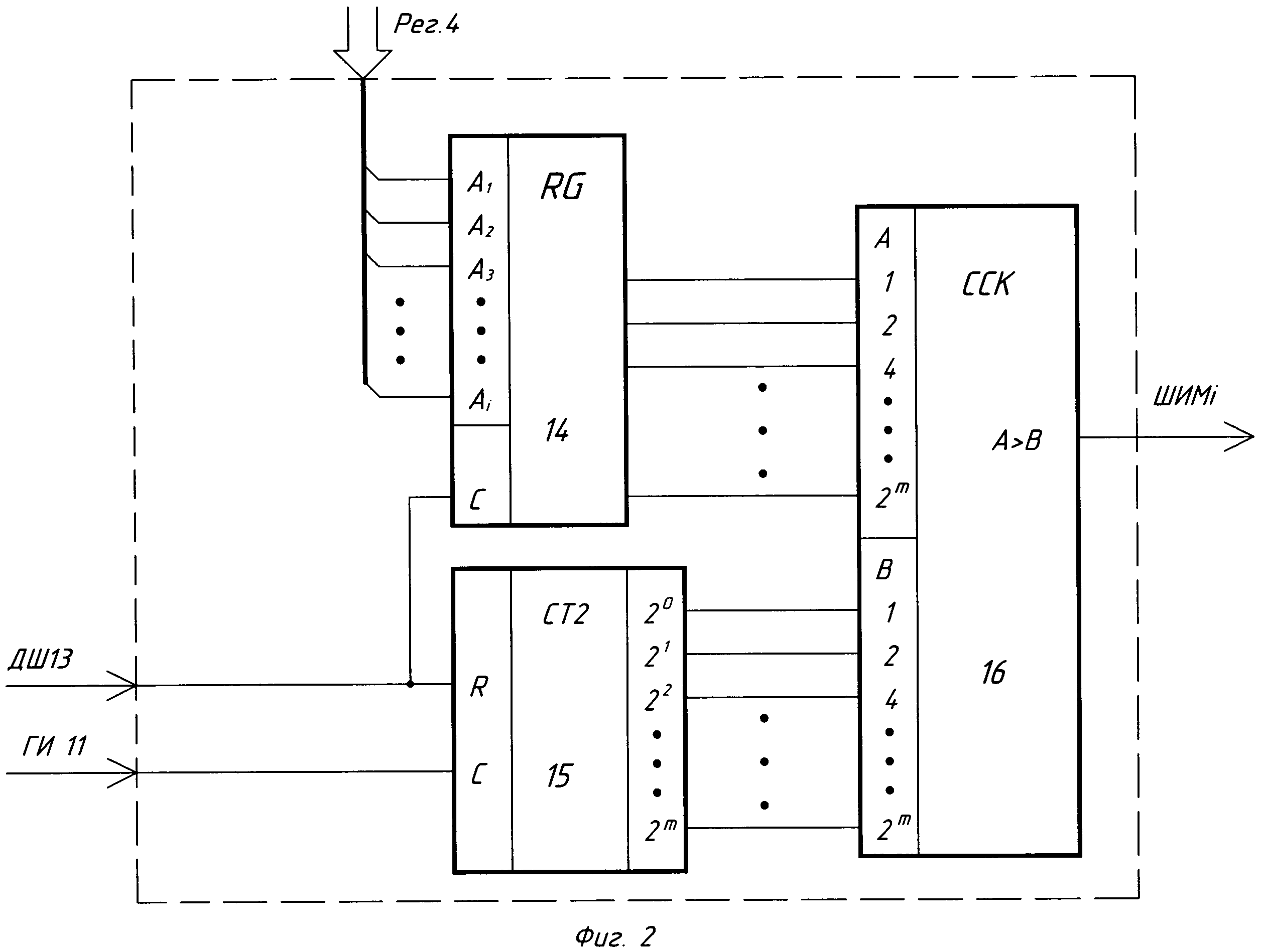 Изобретение относится к области автоматики и вычислительной техники и может быть использовано в системах автоматического управления. Известны многоканальные преобразователи кодов в ШИМ-сигналы, содержащие элементы памяти, коммутаторы, блок управления, логические элементы, формирователи весовых импульсных сигналов, сумма которых в периоде ШИМ-сигнала каждого канала пропорциональна входному коду [1]. Недостатком известных многоканальных преобразователей является их сложность и низкая помехозащищенность, вызванная суммированием помех от фронтов выходных токовых сигналов. Наиболее близким техническим решением к данному изобретению является многоканальный преобразователь напряжений, содержащий источники напряжений, подключенные через коммутатор к информационному входу аналого-цифрового преобразователя (АЦП), выходы которого подключены к информационным входам выходного устройства (например, регистра), блок управления, один выход которого подключен к управляющим входам АЦП и выходного устройства (регистра), а группа выходов - к управляющим входам коммутатора, цифровые индикаторы и цифровые регистраторы [2]. В указанном устройстве не предусмотрено последующее преобразование выходных кодов в ШИМ-сигналы. При подключении к выходам устройства известных преобразователей кодов в ШИМ-сигналы (см. например, Гитис Э.И. Преобразователи информации для электронных цифровых вычислительных устройств, М., Энергия, 1975, с.268, рис.6-9) силовые (токовые) участки формирователей ШИМ-сигналов всех каналов будут включаться одновременно, что вызовет перегрузку источников питания и суммирование импульсных помех. В предложенное устройство, содержащее источники напряжений, подключенные через коммутатор к информационному входу аналого-цифрового преобразователя (АЦП), выходы которого подключены к информационным входам регистра, блок управления, один выход которого подключен к управляющим входам АЦП и регистра, а группа выходов - к управляющим входам коммутатора, введены блок преобразователей кода в ШИМ-сигналы и формирователь сдвинутых импульсов, группа входов которого соединена с группой выходов блока управления, один выход подключен к входу блока управления, другой выход и группа выходов подключены к счетному входу и группе управляющих входов блока преобразователей кода в ШИМ-сигналы, информационные входы которого соединены с выходами регистра. Многоканальный преобразователь напряжений в ШИМ-сигналы представлен на фиг.1, один канал преобразователя кода в ШИМ-сигнал представлен на фиг.2, а временная диаграмма работы 4-канального преобразователя - на фиг.3. Многоканальный преобразователь напряжений на фиг.1 содержит источники 1 напряжений, коммутатор 2, аналого-цифровой преобразователь (АЦП) 3, регистр 4, блок 5 управления, блок 6 преобразователей кода в ШИМ-сигналы, формирователь 7 сдвинутых импульсов. Блок 5 управления содержит последовательно соединенные делитель 8 частоты, дешифратор 9 и формирователь 10. Выход формирователя 10 и группа выходов дешифратора 9 являются одним выходом и группой выходов блока 5 управления. Формирователь 7 содержит последовательно соединенные генератор 11 импульсов, делитель 12 частоты и дешифратор 13, выходы которого являются группой выходов формирователя 7. Выход генератора 11 подключен к одному входу деши