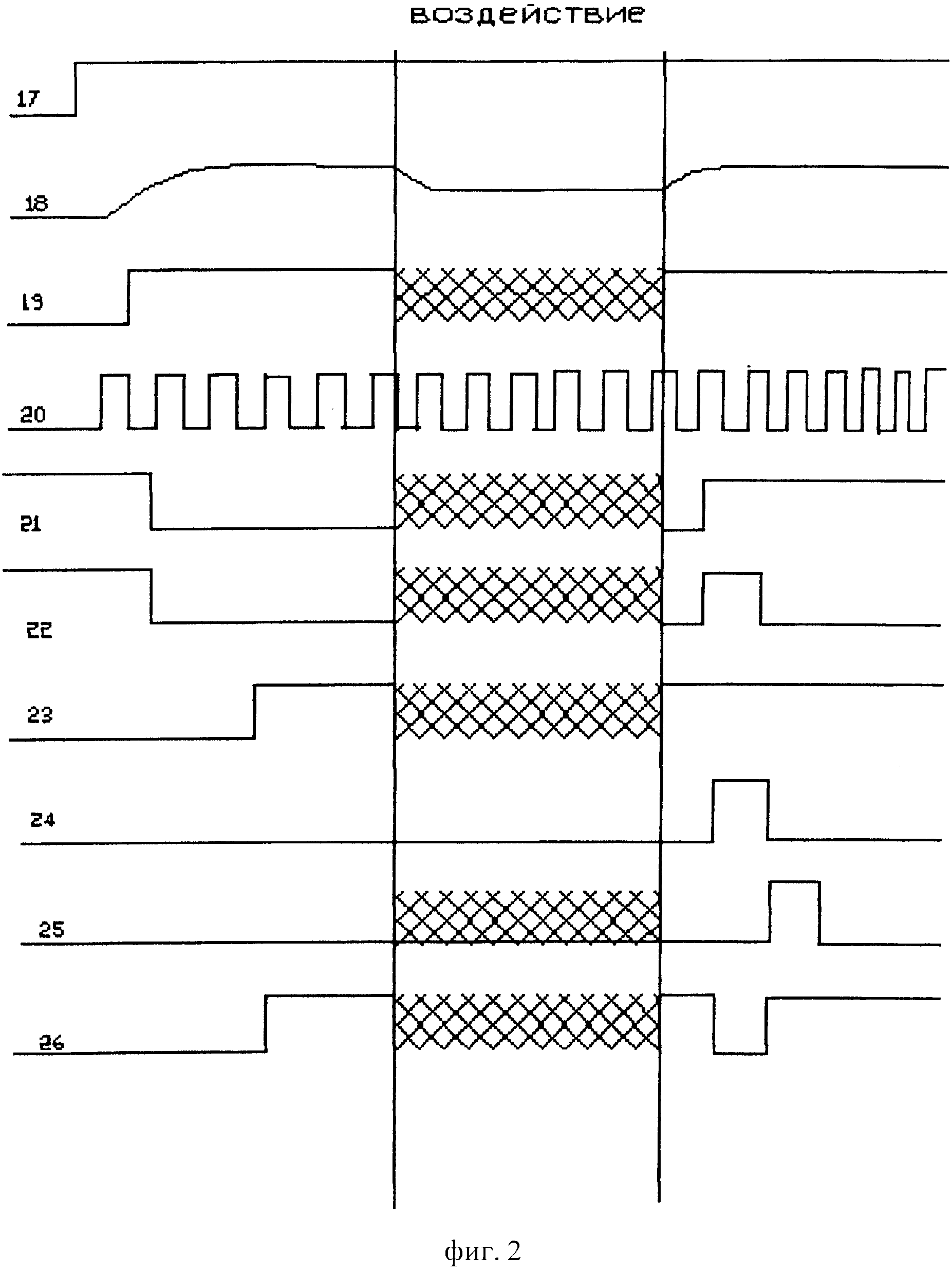 Устройство относится к автоматике и вычислительной технике и может быть использовано в цифровых вычислительных машинах, запоминающих устройствах, устройствах, содержащих элементы памяти для установки их в исходное состояние после включения напряжения питания и работающих после воздействия ионизирующего излучения. Известен формирователь установочного импульса (а.с. H03K 5/01 №1248039), содержащий два триггера, каждый из которых D-типа, прямой выход первого из которых соединен с D-входом второго триггера, инверсный выход - с его D-входом, R-вход - с R-входом второго триггера, инверсный выход которого соединен с первым входом элемента И-НЕ, второй вход которого соединен с шиной тактовых импульсов, выход - с C-входом второго триггера, выходную шину, конденсатор и два резистора, первые выводы которых соединены с шиной источника питания, а второй вывод первого резистора соединен с S-входами первого и второго триггеров, R-вход первого из которых соединен со вторым выводом второго резистора и с первой обкладкой конденсатора, вторая обкладка которого соединена с общей шиной, причем прямой выход первого триггера соединен с выходной шиной, C-вход - с выходом элемента И-НЕ. Однако, после ионизирующего излучения триггеры могут установиться в произвольное состояние, а напряжение па обкладках конденсатора в результате утечек может уменьшиться (напряжение на обкладках конденсатора типа К10-17, К10-47 может достигнуть 50% напряжения питания, т.е. конденсатор может разрядиться). В данном случае при установке триггеров в единичное состояние элемент И-НЕ будет закрыт и тактовые импульсы не будут поступать на синхровходы триггеров. В результате этого на выходе устройства будет постоянный сброс. В этом случае, после окончания воздействия необходима установка элементов в исходное состояние. Из известных, наиболее близким к предлагаемому является устройство формирования установочного импульса (а.с. H03K 21/38 №1328936), содержащее конденсатор, первый вывод которого соединен с общей шиной, а второй подключен к входу порогового элемента и через первый резистор соединен с шиной источника питания, D-триггер, два резистора и четыре ключа, выход порогового элемента соединен с С-входом триггера, а вход подключен к выходу первого ключа и управляющему входу второго ключа, входы первого, второго и третьего ключей соединены с общей шиной, выход четвертого ключа соединен с S-входом триггера и через второй резистор подключен к общей шине, управляющие входы первого, третьего и четвертого ключей соединены с прямым выходом триггера, D-вход которого соединен с шиной источника питания, а R-вход подключен к выходам второго и третьего ключей и через третий резистор к шине источника питания, причем вход четвертого ключа соединен с шиной источника питания. В данном устройстве после ионизирующего излучения триггер может установиться в произвольное состояние, а конденсатор частично разрядиться. Так, например, при установке триггера в единичное состояние открываются ключи 7, 9, 10. На S-входе триггера устанавливается единичное состояние, а на R-входе - нулевое, конденсатор разряжен и состояние устройства не изменяется. Для данного устройства, так же как и предыдущего, необходима установка элементов в исходное состояние, т.е. после ионизирующего излучения на выходе устройства должен формиро