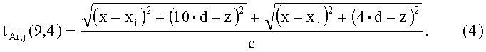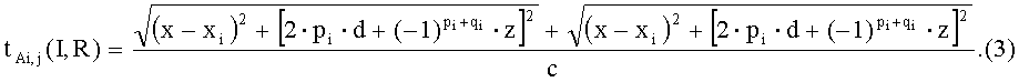 tAi,j(I, R) - время задержки фрагмента ui,j реализации, содержащего сигнал, прошедший по траектории с общим количеством (I+R) отражений от обеих границ объекта контроля;