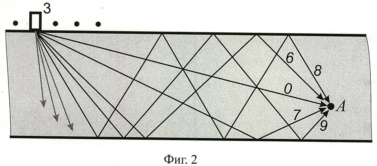 Использование: для ультразвуковой диагностики плоских металлоконструкций. Сущность: заключается в том, что выполняют излучение в объект контроля и прием из него ультразвуковых сигналов с помощью антенной решетки, фиксацию реализации ультразвуковых колебаний, принятых каждым элементом решетки при излучении ультразвукового сигнала независимо каждым ее элементом, и поточечное построение изображения внутренней структуры объекта путем выбора изо всех принятых реализаций тех фрагментов, времена задержки которых равны временам распространения ультразвуковых сигналов от излучающего элемента решетки к каждой визуализируемой точке объекта и от нее к приемному элементу, суммирования этих выбранных фрагментов для каждой точки изображения и записи результата суммирования, при этом, учитывая известную толщину объекта контроля, в результирующую сумму выбранных фрагментов реализаций для каждой точки изображения дополнительно включают выборки фрагментов, времена задержек которых равны временам распространения ультразвуковых сигналов, переотраженных от донной и внешней поверхностей объекта контроля на траекториях от излучающего элемента решетки к данной визуализируемой точке объекта и от нее к приемному элементу. Технический результат: повышение чувствительности к малым отражателям, а также повышение разрешающей способности. 2 н.п. и 1 з.п. ф-лы, 3 ил.