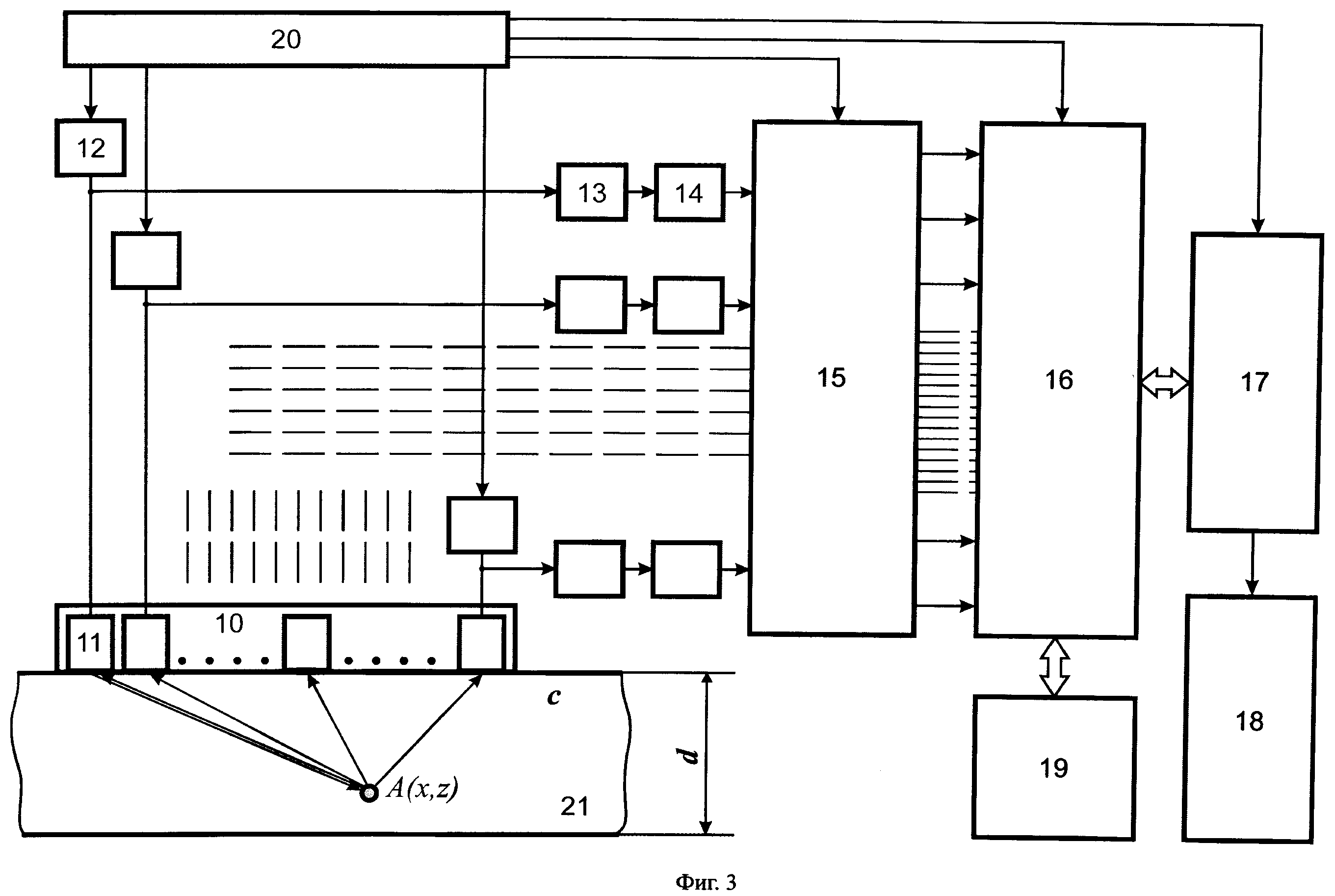 1. Способ ультразвуковой томографии, включающий в себя излучение в объект контроля и прием из него ультразвуковых сигналов с помощью антенной решетки, фиксацию реализации ультразвуковых колебаний, принятых каждым элементом решетки при излучении ультразвукового сигнала независимо каждым ее элементом, и поточечное построение изображения внутренней структуры объекта путем выбора изо всех принятых реализаций тех фрагментов, времена задержки которых равны временам распространения ультразвуковых сигналов от излучающего элемента решетки к каждой визуализируемой точке объекта и от нее к приемному элементу, суммирования этих выбранных фрагментов для каждой точки изображения и записи результата суммирования, отличающийся тем, что при известной толщине объекта контроля в результирующую сумму выбранных фрагментов реализации для каждой точки изображения дополнительно включают выборки фрагментов, времена задержек которых равны временам распространения ультразвуковых сигналов, переотраженных от донной и внешней поверхностей объекта контроля на траекториях от излучающего элемента решетки к данной визуализируемой точке объекта и от нее к приемному элементу. 2. Устройство ультразвуковой томографии, содержащее антенную решетку с n приемно-передающими элементами, каждый из которых соединен с выходом соответствующего генератора импульсов и входом соответствующей цепочки последовательно соединенных усилителя и аналого-цифрового преобразователя, выход каждой из n указанных цепочек соединен с соответствующим входом памяти реализации, количество выходов которой - N определяется формулой 3. Устройство по п.2, отличающееся тем, что вычислительный блок для каждой точки изображения реализует функцию