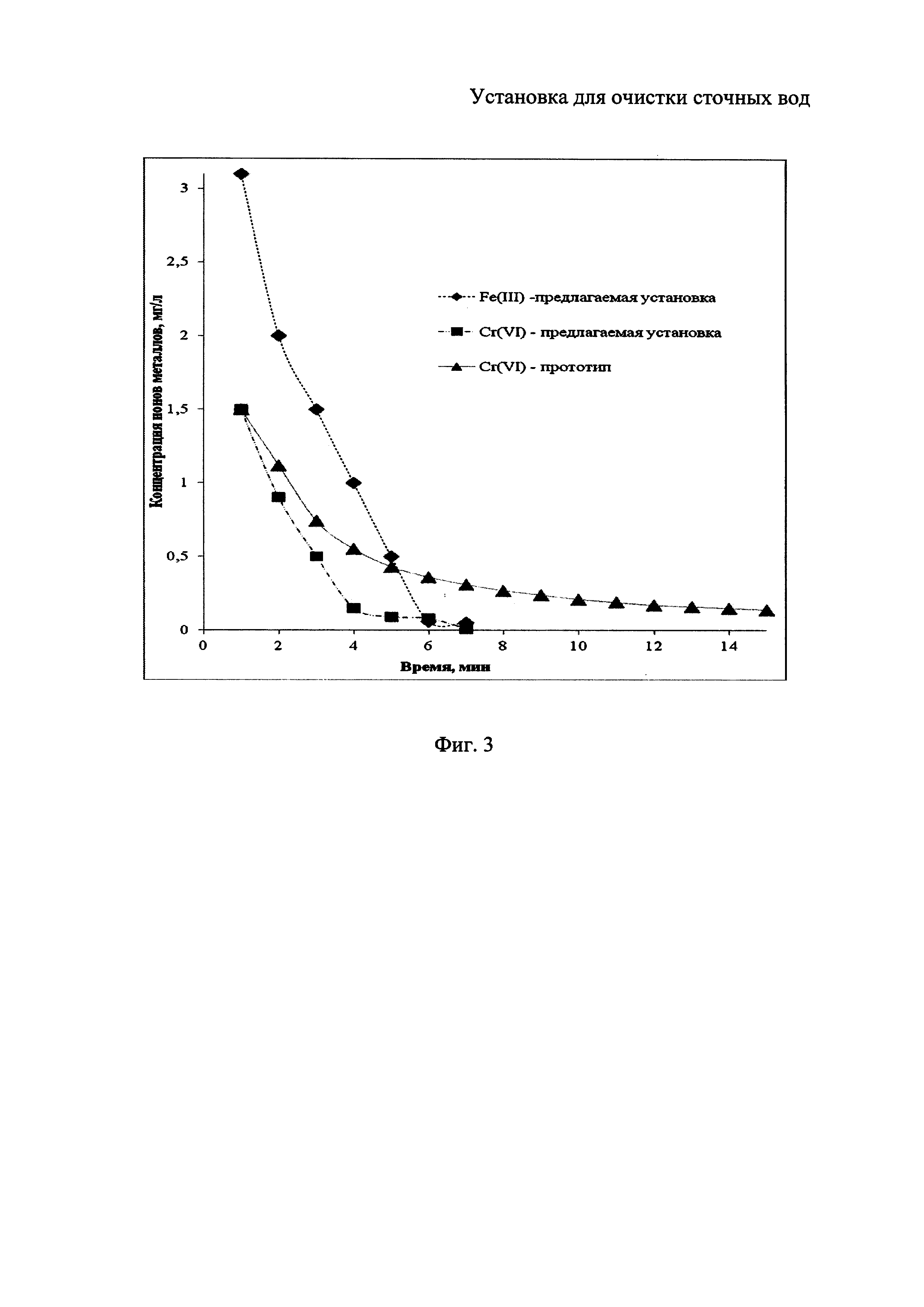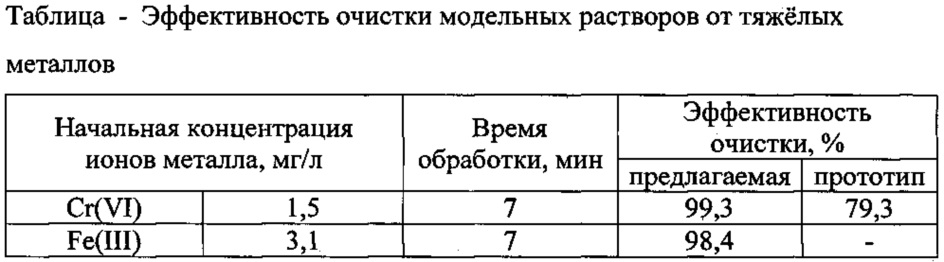 Предлагаемое изобретение относится к устройствам очистки сточных вод и может быть использовано в химической, металлургической и других отраслях промышленности для очистки загрязненных вод. Известен электрокоагулятор, содержащий корпус, днище, проточную камеру, засыпной стружечный анод, перфорированный катод и решетку, анодный токоподвод, трубопроводы, лоток, емкость, патрубок, эжектор, стержни (А.с. СССР №1787949, МПК5 C02F 1/46, 1993). Недостатком указанного электрокоагулятора является низкая степень очистки, обусловленная контактом очищаемой жидкости только со смываемыми продуктами реакции на электроде, а также отсутствие отстаивания обработанной жидкости. Прототипом является установка для очистки сточных вод от ионов тяжелых металлов, масел, взвешенных веществ и других примесей (А.с. СССР №1730044, МПК С02F 1/46, опубл. 1992). Установка для очистки сточных вод включает камеру с растворимыми электродами и флотокамеру с нерастворимыми электродами и плавающей фильтрующей загрузкой, флотокамера содержит перегородки, выполненные в виде четырех цилиндров с верхней частью в виде усеченного конуса, установленных коаксиально относительно друг друга, при этом верхняя часть боковой стенки первого и третьего и нижняя часть второго и четвертого по ходу очищаемой воды цилиндров перфорирована, а плавающая загрузка размещена между четвертым цилиндром и стенкой корпуса флотокамеры. Камера с растворимыми электродами соединена с флотокамерой горизонтальной реакционной трубой, в нижней части которой установлен распределитель стоков, выполненный в виде стержня с насадками, размещенными на одной стороне распределителя и направленными по касательной к окружности реакционной трубы, кроме того, верхние части конусных устройств флотокамеры снабжены вертикально расположенными трубками, торцы которых расположены на одинаковом уровне. Недостатком прототипа является недостаточная эффективность установки, обусловленная невысокой степенью очистки сточных вод в результате вторичного загрязнения воды продуктами растворения электродов, низкая производительность из-за малой площади электродов и большой расход электроэнергии. Задачей изобретения является увеличение эффективности очистки сточных вод. Задача решается установкой, включающей флотокамеру с нерастворимыми электродами, плавающей фильтрующей загрузкой, плавающей сорбционно-активной загрузкой, растворимым электродом; флотокамера содержит перегородки, выполненные в виде четырех цилиндров с верхней частью в виде конусного сборного устройства, установленных коаксиально относительно друг друга, при этом верхняя часть боковой стенки первого и третьего и нижняя часть второго и четвертого по ходу очищаемой воды цилиндров перфорирована, а верхние части конусных устройств снабжены вертикальными трубками, торцы которых расположены на одинаковом уровне, плавающая фильтрующая загрузка размещена между четвертым цилиндром и стенкой корпуса флотокамеры, а плавающая сорбционно-активная загрузка расположена ниже плавающей фильтрующей загрузки; в пространстве между вторым и третьим цилиндрами выполнен кольцевой барботер, а растворимый электрод, представляющий собой смесь из железных и медных шариков, упакованных в диэлектрический перфорированный бокс, расположен в первом цилиндре 