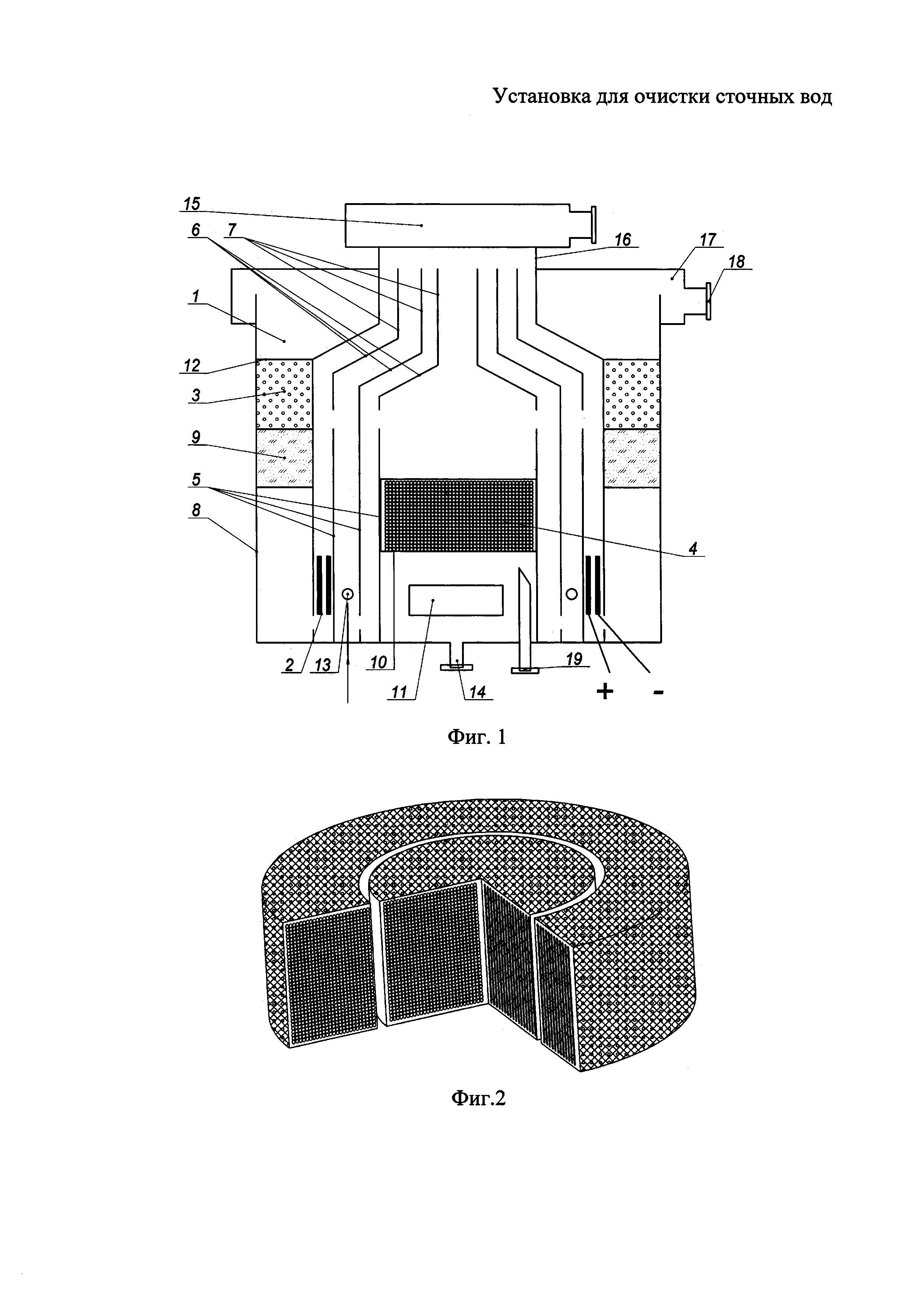 1. Установка для очистки сточных вод, содержащая флотокамеру с нерастворимыми электродами, плавающей фильтрующей загрузкой и растворимым электродом, причем флотокамера содержит перегородки, выполненные в виде четырех цилиндров с верхней частью в виде конусного сборного устройства, установленных коаксиально относительно друг друга, при этом верхняя часть боковой стенки первого и третьего и нижняя часть второго и четвертого по ходу очищаемой воды цилиндров перфорирована, а верхние части конусных устройств снабжены вертикальными трубками, торцы которых расположены на одинаковом уровне, плавающая загрузка размещена между четвертым цилиндром и стенкой корпуса флотокамеры, отличающаяся тем, что установка дополнительно снабжена плавающей сорбционно-активной загрузкой, расположенной ниже плавающей фильтрующей загрузки, в пространстве между вторым и третьим цилиндрами выполнен кольцевой барботер, а растворимый электрод, представляющий собой смесь из железных и медных шариков, упакованных в диэлектрический перфорированный бокс, расположен в первом цилиндре на некотором расстоянии от дна, под растворимым электродом установлен ультразвуковой генератор. 2. Установка по п. 1, отличающаяся тем, что отрицательный нерастворимый электрод размещен под плавающей сорбционно-активной загрузкой. 3. Установка по пп. 1 или 2, отличающаяся тем, что днище установки выполнено в виде конуса. 4. Установка по пп. 1 или 2, отличающаяся тем, что перфорированный диэлектрический бокс имеет две кольцевые перегородки, пространство между которыми не заполнено электродом.