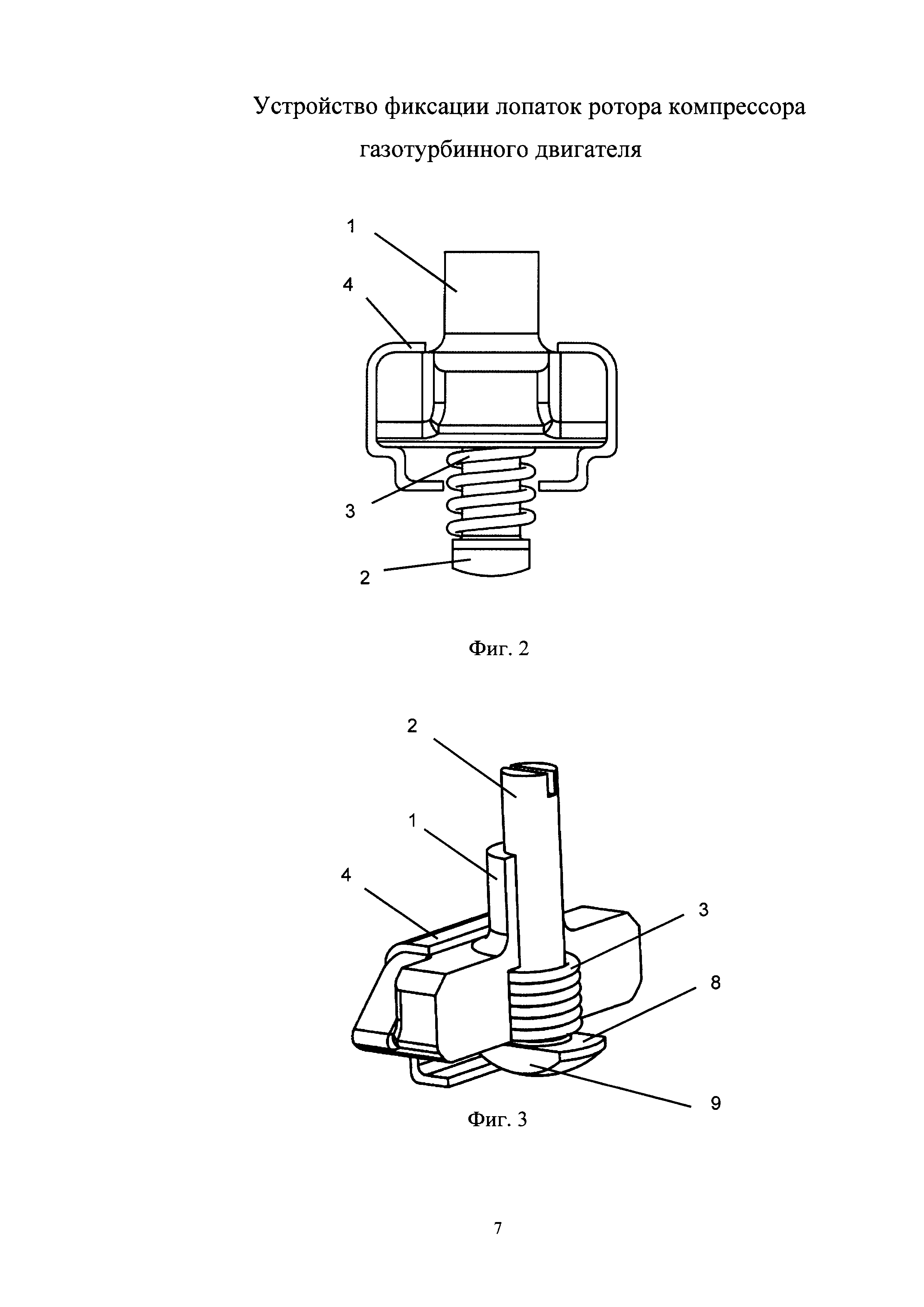 Изобретение относится к области авиадвигателестроения и ГТУ наземного применения, в частности к роторам компрессоров газотурбинных двигателей. Устройство фиксации лопаток ротора компрессора газотурбинного двигателя на диске ротора, содержащее вкладыш, выполненный с возможностью зацепления в удерживающем окне диска в рабочем положении устройства фиксации лопаток, фиксатор, выполненный с возможностью упираться в донышко канавки диска в рабочем положении устройства фиксации лопаток, пружину, обеспечивающую неподвижность элементов устройства фиксации лопаток на диске в рабочем положении устройства фиксации лопаток, и упор, установленный на вкладыше и выполненный с возможностью удержания фиксатора в сжатом монтажном положении устройства фиксации лопаток. Перевод устройства фиксации из рабочего в монтажное положение обеспечивается путем приложения радиального усилия к вкладышу для сжатия пружины и последующего поворота фиксатора, причем упор выполнен в форме пластины, а фиксатор имеет шляпку с лысками, обеспечивающую возможность зацепления фиксатора за установленный на вкладыше упор при повороте фиксатора, обеспечивающем перевод устройства фиксации лопаток в монтажное положение. Изобретение позволяет повысить надежность устройства фиксации, упростить процесс монтажа и демонтажа лопаток в диск ротора компрессора и уменьшить габариты устройства за счет применения пружины. 3 ил.