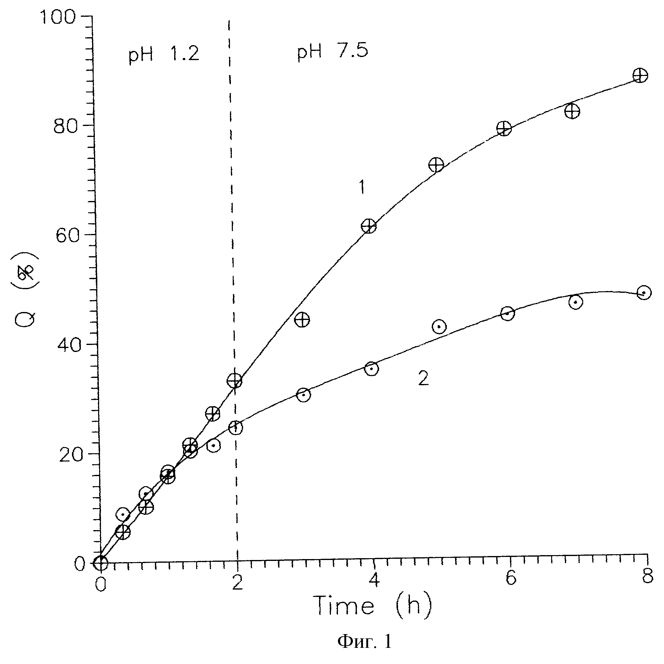 желудочно-кишечный тракт (в течение 2-х часов в среде с рН 1,2, затем - в среде с рН 7,5). Кривая 1 - теофиллин; кривая 2 - сальбутамола сульфат. Фиг. 2. Высвобождение (Q) теофиллина и
