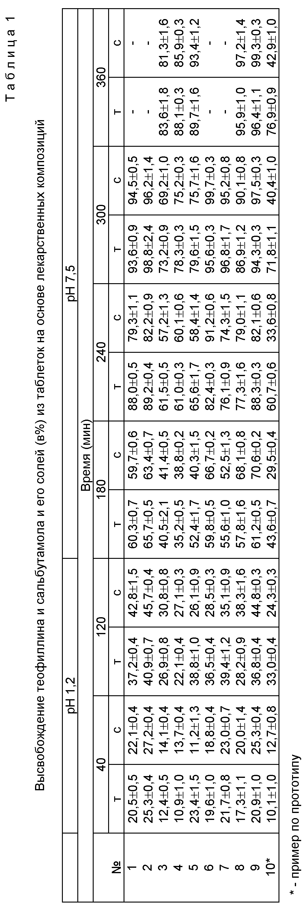 достаточно сложна. Задачей изобретения является сохранение терапевтической эффективности при уменьшении дозы теофиллина, уменьшение массы вспомогательных веществ, обеспечивающих