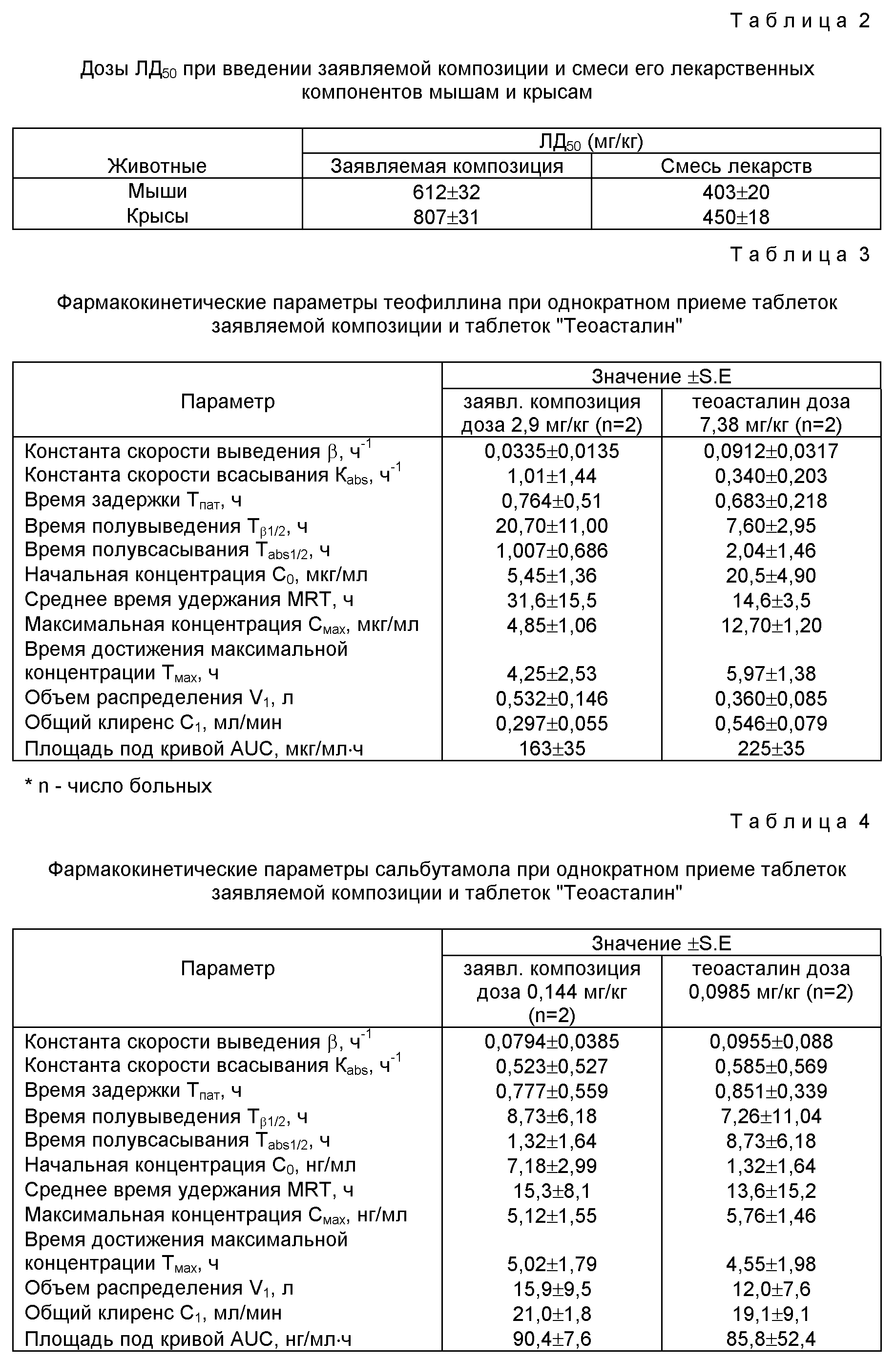 заявляемой композиции и теоасталина представлены в табл. 3,4. На основании изучения основных фармакокинетических параметров препаратов было показано, что всасывание теофиллина после