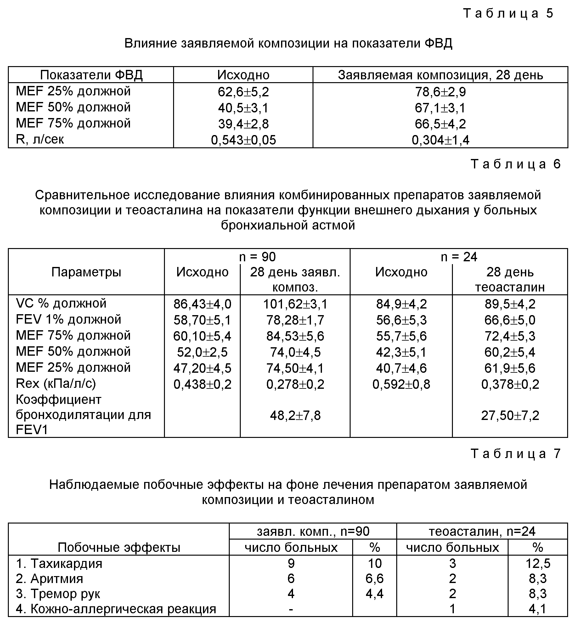 ИПК в предлагаемой композиции увеличивает биодоступность теофиллина, что позволяет снизить его дозу. Проведено изучение фармакодинамики заявляемой композиции при курсовом лечении