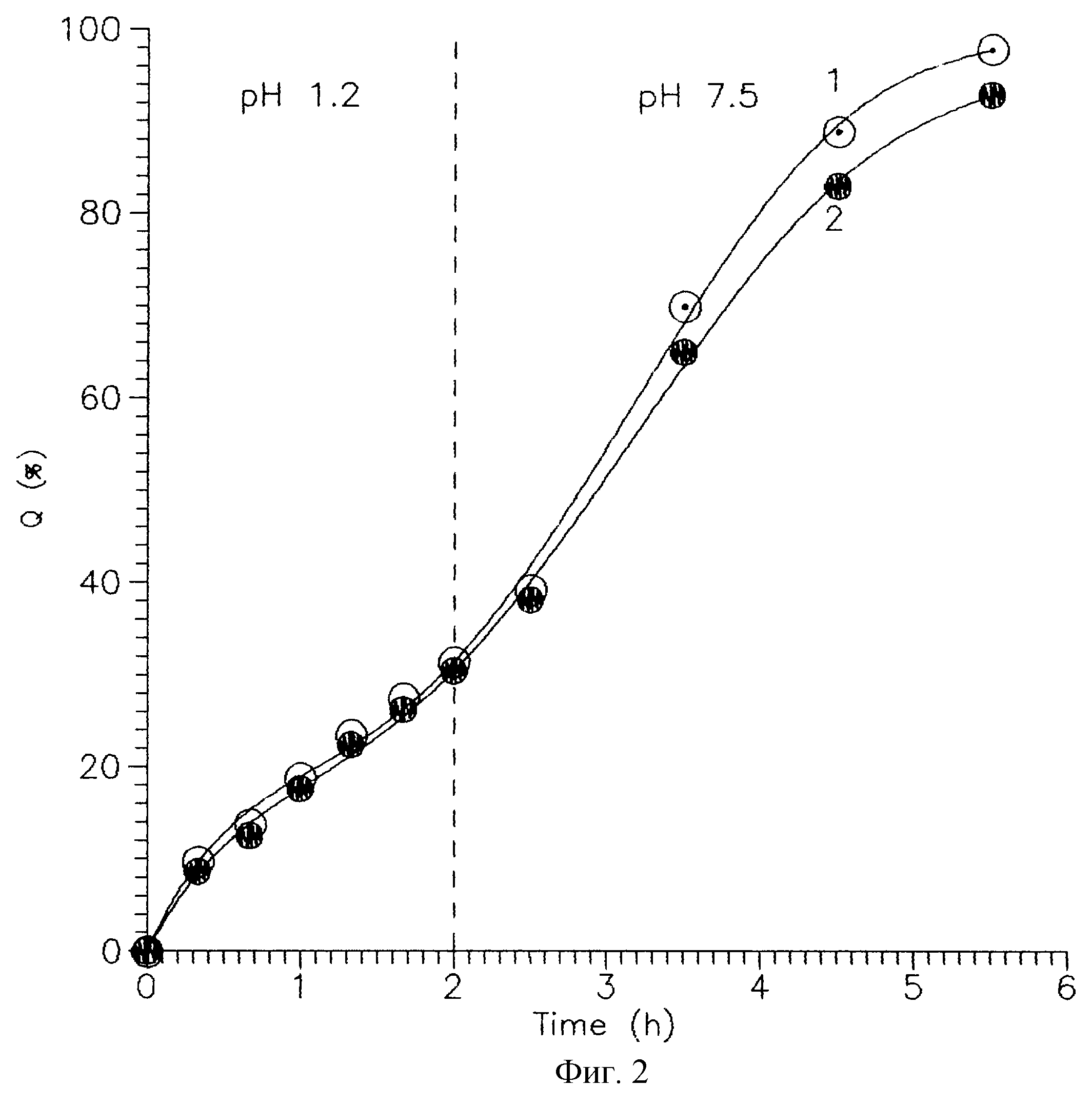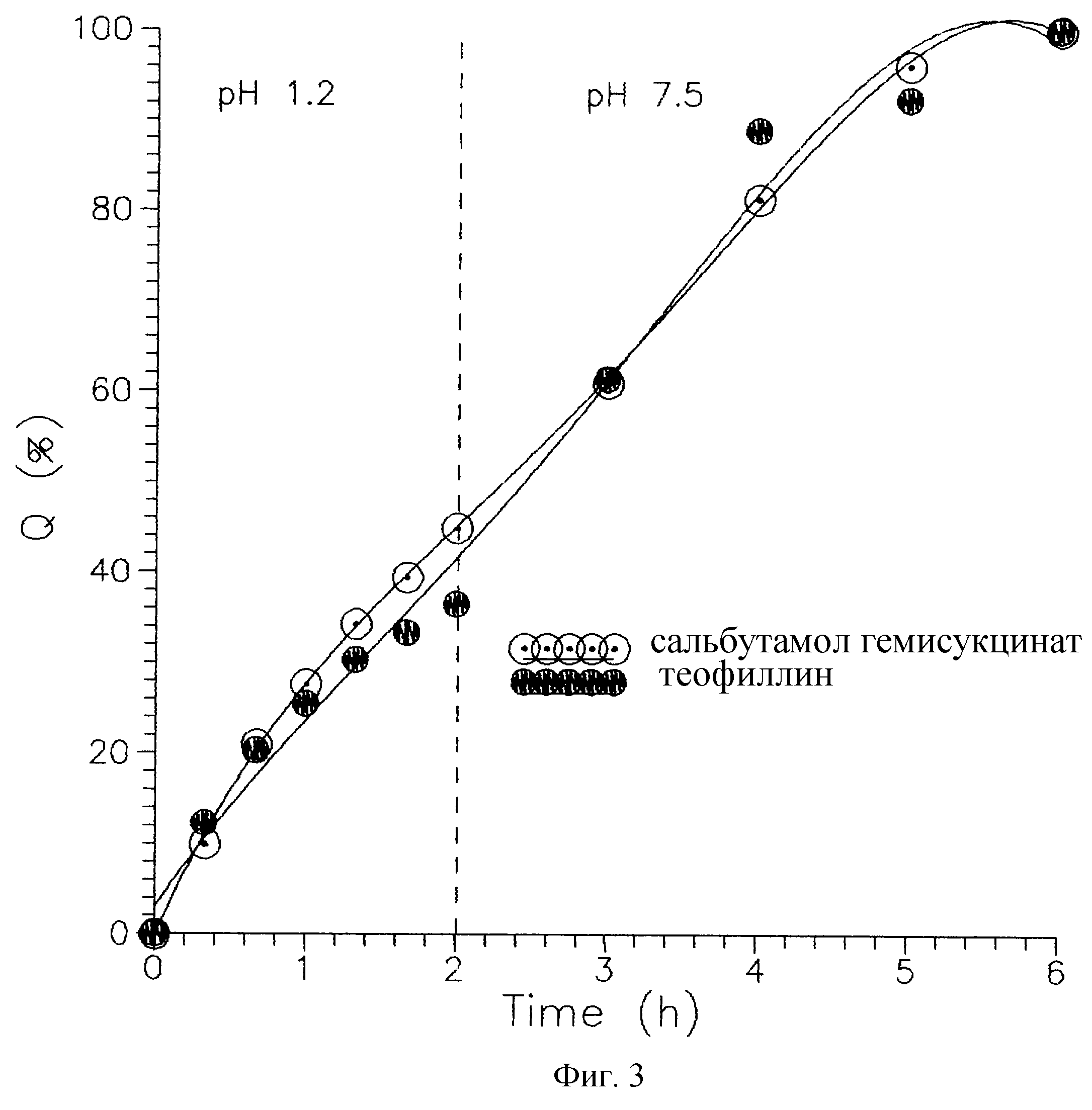 (в течение 2-х часов в среде с рН 1,2, затем - в среде с рН 7,5). Кривая 1 - сальбутамола гемисукцинат; 2 - теофиллин. Фиг. 3. Высвобождение (Q) теофиллина и сальбутамола гемисукцината