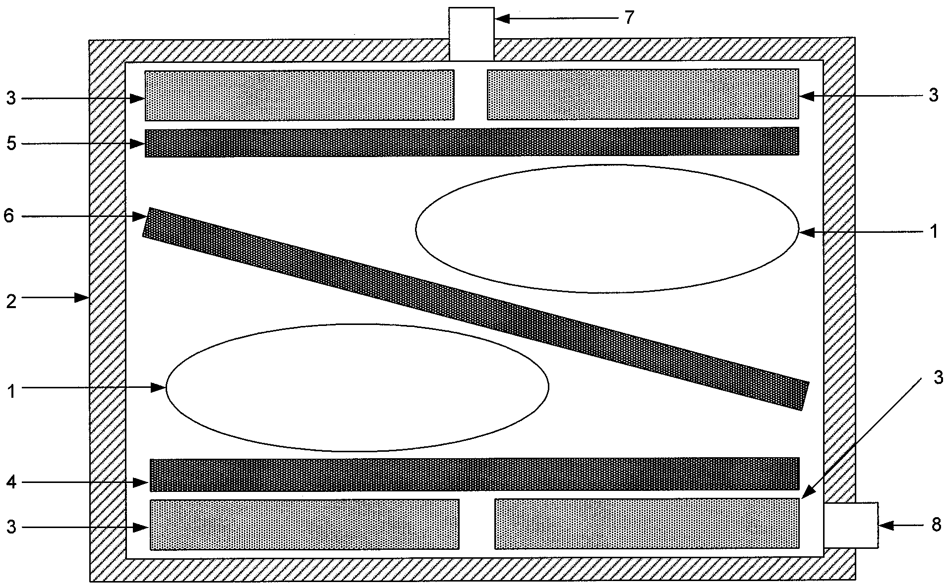 Изобретение относится к рыбной промышленности и может быть использовано для перевозки холодноводных ракообразных в живом виде. В частности, данный способ применим для камчатского краба (Paralithodes camtschaticus) и других промысловых холодноводных крабов и крабоидов. В последнее время на мировом рынке постоянно растет спрос на живого краба. В связи с этим возникает необходимость в разработке эффективного способа транспортировки выловленного краба от места промысла к месту его реализации или дальнейшего использования в качестве объекта аквакультуры. На сегодняшний день широко применяется транспортировка гидробионтов, в частности ракообразных, в емкостях с водой, снабженных подачей воздуха или кислорода. Однако такой способ транспортировки живого краба требует сложного технического оборудования по поддержанию необходимого микроклимата и очистке воды от продуктов жизнедеятельности. Помимо этого, емкости с водой имеют большой вес. Известен способ сохранения живыми ракообразных, таких как омары (патент США №2890680, НКИ 119-2, 1957 г), заключающийся в поддержании температуры и влажности в закрытом пространстве посредством периодического охлаждения и впрыскивания аэрозоля, содержащего водный раствор NaCl. Известен способ доращивания выловленных в море некондиционных крабов для получения товарной продукции, транспортировку крабов осуществляли во влажной среде, при этом крабов укладывали «на спину», перекладывали водорослями и укрывали влажной тканью (см. патент РФ 2273989, А01К 61/00 2006 г). Известные способы транспортировки обеспечивают перевозку живых крабов в течение не более 3 ч. Технической задачей заявленного изобретения является увеличение времени транспортировки живых крабов с минимальным отходом. Поставленная задача решается в способе транспортировки камчатского краба путем содержания краба во влажной среде при температуре не выше 10°С, при этом крабов размещают в контейнере, отделяя каждую особь влажным материалом, при этом через каждые 12 часов, осуществляют подачу морской воды с температурой 2-10°С, выдерживание в течение не более 15 мин и последующий сброс воды, при этом морскую воду из емкости подают через патрубок подачи воды, размещенный в крышке контейнера, а сброс осуществляется через патрубок, размещенный на боковой стенке контейнера. Кроме того, морскую воду для подачи в контейнер обогащают кислородом и для регенерации используется сорбент. На чертеже изображен контейнер. Для перевозки крабов без воды можно использовать различные модели контейнеров. Оптимально для этой цели подходят пенопластовые или пластиковые изотермические контейнеры. Размеры емкости зависят от количества перевозимых крабов. Запас морской воды для промывки хранится в изотермической накопительной емкости, оборудованной системой аэрации для обогащения воды кислородом. Для очистки промывочной воды от продуктов распада, выделяемых крабами в накопительной емкости, используется сорбент. Объем воды должен составлять 10% от суммарной емкости транспортировочных контейнеров, но при этом не должен быть менее объема одного контейнера. Способ осуществляют следующим образом. Крабов 1 в контейнер 2 помещают непосредственно из воды, чтобы жабры оставались максимально увлажненными. Основной принцип перевозки крабов (1) без воды - создание внутри трансп