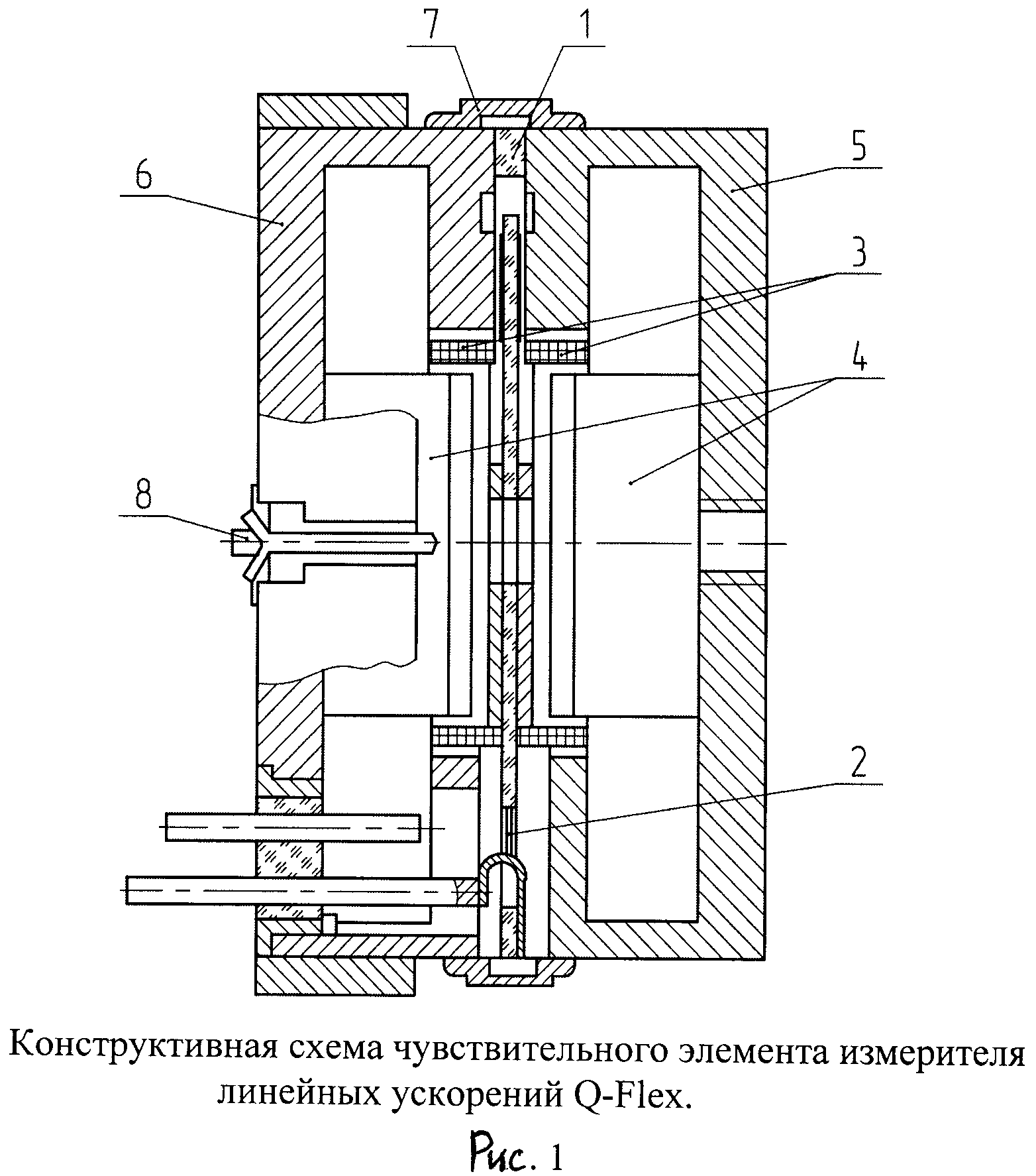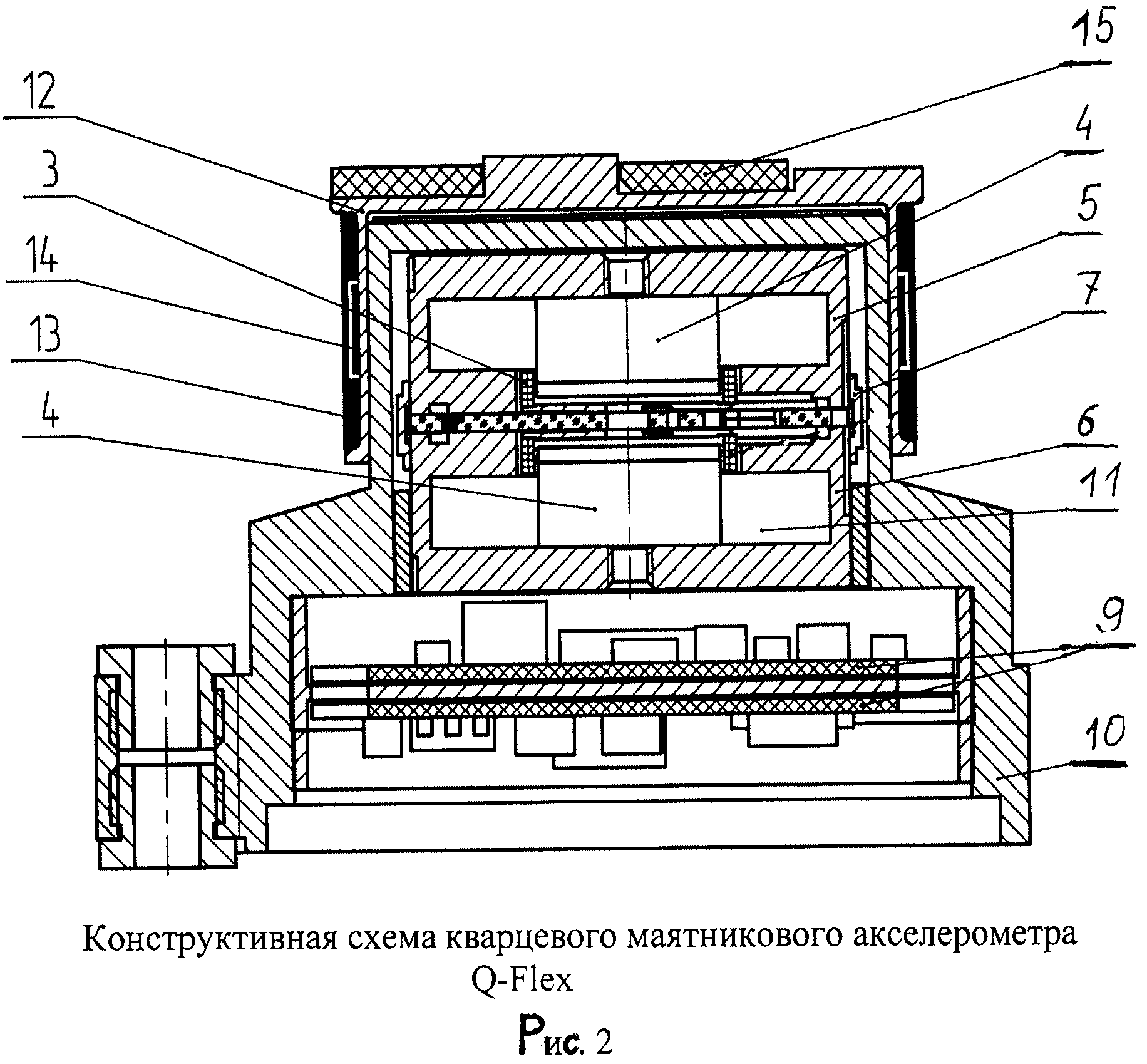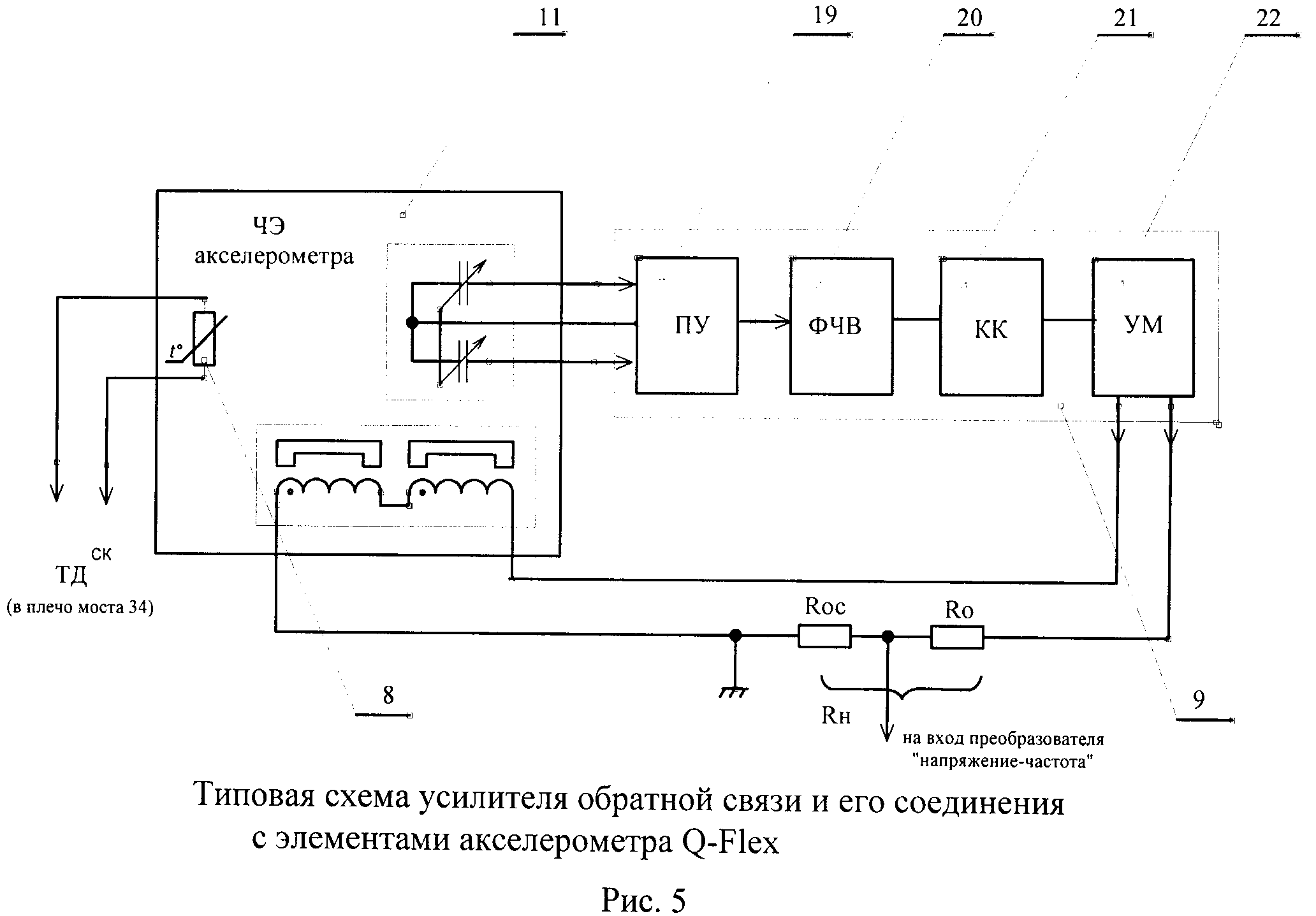 Изобретение относится к измерительной технике, а именно к средствам измерения линейных ускорений в системах управления движущимися объектами, например к средствам измерения линейного ускорения в бесплатформенных инерциальных навигационных системах управления космическими объектами. Кварцевые маятниковые акселерометры, используемые в системах управления, обычно компонуются в блоки измерителей линейного ускорения, которые содержат «n» измерительных каналов (n=1, 3, 4, 5, 6). Все каналы имеют одинаковую структуру. Каждый измерительный канал содержит кварцевый маятниковый акселерометр, вторичный источник питания и блок преобразования аналоговой выходной информации акселерометра по току обратной связи или напряжению в цифровую форму - код, для чего могут использоваться либо аналого-цифровой преобразователь, либо преобразователь «напряжение-частота» (ПНЧ) или «ток-частота» (ПТЧ), либо широтно-импульсный модулятор (ШИМ), либо преобразователи, построенные на ПЛИС и процессоре. Большое распространение получили преобразователи «напряжение-частота» - ПНЧ. Проблемой является существенная зависимость от температуры основных технических характеристик кварцевых маятниковых акселерометров, а именно масштабного коэффициента и смещения нуля, что определяет и температурную зависимость тех же параметров измерителей линейного ускорения, имеющих в качестве чувствительных элементов кварцевые маятниковые акселерометры. Дополнительная сложность решения задачи снижения влияния температуры на параметры измерителей линейного ускорения, а в идеальном варианте, задача обеспечения термоинвариантности масштабного коэффициента и смещения нуля измерителей линейного ускорения состоит в том, что указанные зависимости носят существенно нелинейный характер. Для снижения влияния температуры на параметры измерителя линейного ускорения используют следующие технические решения: - термостатирование измерителя; - алгоритмическую компенсацию температурной погрешности масштабного коэффициента и смещения нуля. Известна конструкция измерителя линейного ускорения с кварцевым маятниковым акселерометром компенсационного измерения, рассматриваемая в качестве аналога. Это измеритель линейного ускорения, широко описанный в литературе, - С.Ф.Коновалов и др., «Гироскопические системы», М.: Высшая школа, 1980, стр.31. Выходное напряжение акселерометра подается на емкость, выполняющую роль интегратора; заряд, накапливающийся на емкости, компенсируется импульсами нормированного тока, проходящими в момент открытия ключа. В схеме осуществляется формирование выходных импульсов, частота следования которых пропорциональна напряжению на аналоговом выходе акселерометра, т.е. измеряемому линейному ускорению. Для обеспечения точностных характеристик выполняется термостатирование акселерометра. Недостатки аналога - большое время готовности, большое энергопотребление. Известна конструкция прибора БИПС-М, принятого за аналог. Прибор разработан предприятием ОАО РКК «Энергия» и эксплуатируется в системе управления транспортного корабля «Прогресс-М». Прибор БИПС-М содержит пять измерителей линейного ускорения - кварцевых маятниковых акселерометров АК-6. Компенсация температурных погрешностей акселерометров в приборе БИПС-М отсутствует. Однако 