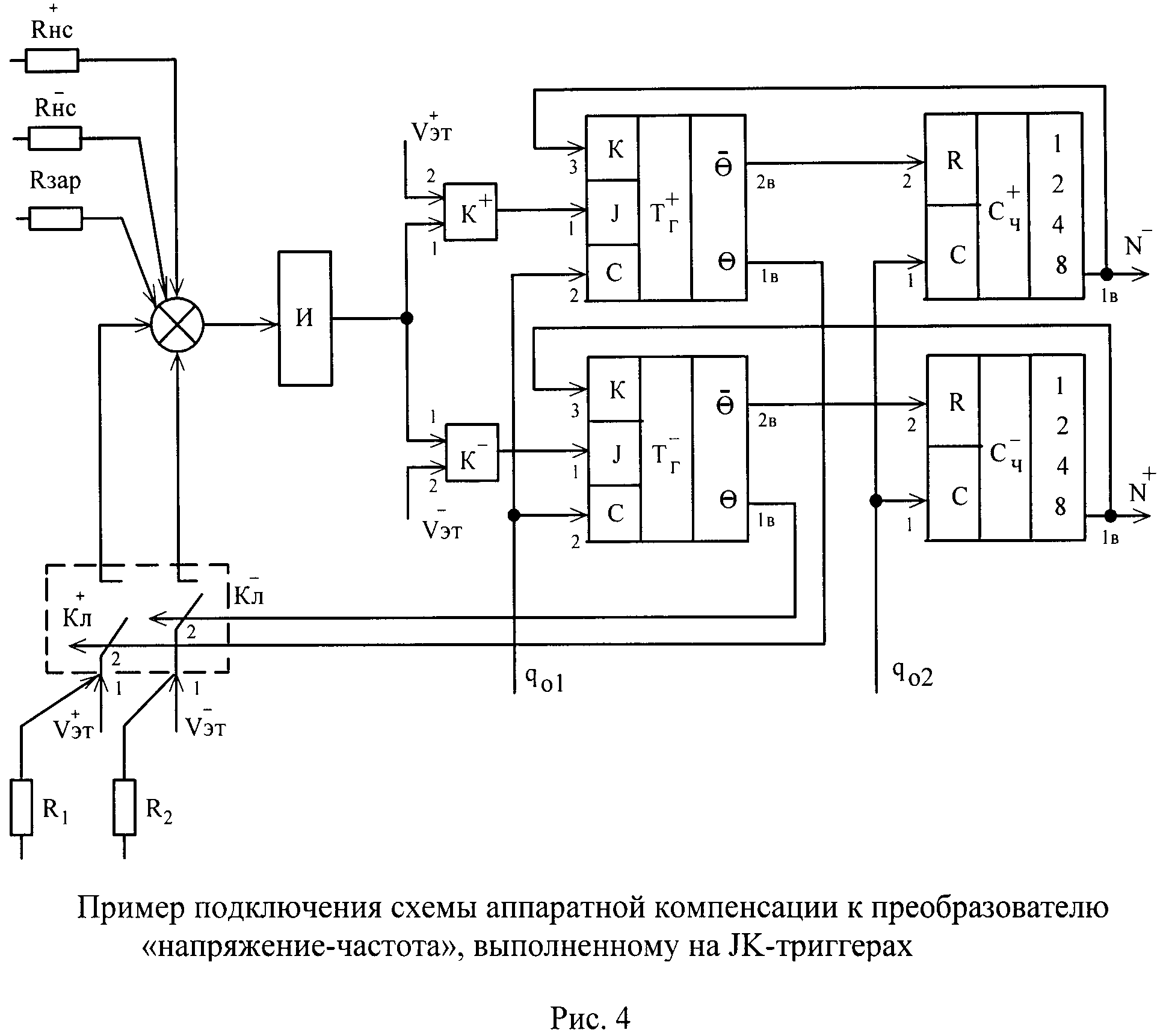 Термоинвариантный измеритель линейного ускорения, содержащий кварцевый компенсационный маятниковый акселерометр, преобразователь напряжения в частоту, входом связанный с выходом акселерометра, термосистему, содержащую первую мостовую схему резисторов, в одно из плеч которой включен первый термодатчик, усилитель мощности, вход которого соединен с выходом первой мостовой схемы, а выход соединен с катушкой обогрева, охватывающей корпус акселерометра, причем первый термодатчик установлен между катушкой и корпусом акселерометра, а входная диагональ первой мостовой схемы подключена к источнику вторичного питания, при этом преобразователь содержит нагрузочный резистор, который подключен к выходу усилителя обратной связи, генератор синхрочастоты, интегратор, резистор заряда Rзар, две симметричные цепи преобразования положительной и отрицательной информации, каждая из цепей содержит соединенные последовательно в каждой цепи преобразования эталонный источник напряжения, компаратор, резистор разряда Rразр, переключающее устройство, содержащее электронный ключ, триггер, счетчик тактовых импульсов, и формирователь импульсной выходной информации; при этом Rзар соединен через нагрузочный резистор Roc с выходом усилителя обратной связи и с входом интегратора, выход интегратора соединен с первым входом каждого из компараторов, второй вход каждого компаратора соединен с первым выходом соответствующего эталонного источника напряжения, второй выход эталонного источника напряжения через соответствующие резисторы Rразр соединен с первым входом соответствующего ключа, выход ключа соединен с входом интегратора, выход компаратора соединен с первым входом триггера, второй вход триггера и первый вход счетчика соединены с выходом генератора синхрочастоты, третий вход триггера соединен с выходом соответствующего счетчика, первый выход триггера соединен со вторым входом соответствующего ключа, второй выход триггера соединен со вторым входом счетчика, выход счетчика соединен с входом соответствующего формирователя и с третьим входом соответствующего триггера, отличающийся тем, что введена система аппаратной компенсации температурных погрешностей, содержащая вторую мостовую схему резисторов, входная диагональ которой связана с источником вторичного питания, второй термодатчик, установленный внутри корпуса акселерометра и включенный в одно из плеч второй мостовой схемы, измерительный усилитель, инвертор и четыре резистора R1-4, выход второй мостовой схемы соединен с входом измерительного усилителя, при этом резистор R1 соединен первым выводом с первым выходом измерительного усилителя, резистор R2 соединен первым выводом через первый канал инвертора со вторым выходом измерительного усилителя, вторые выводы резисторов R1 и R2 соединены с информационными входами ключей, соответственно, положительной и отрицательной цепей преобразователя; резистор R3 первым выводом соединен с третьим выходом измерительного усилителя, резистор R4 первым выводом через второй канал инвертора соединен с четвертым выходом измерительного усилителя, вторые выводы резисторов R3 и R4 соединены с входом интегратора преобразователя.