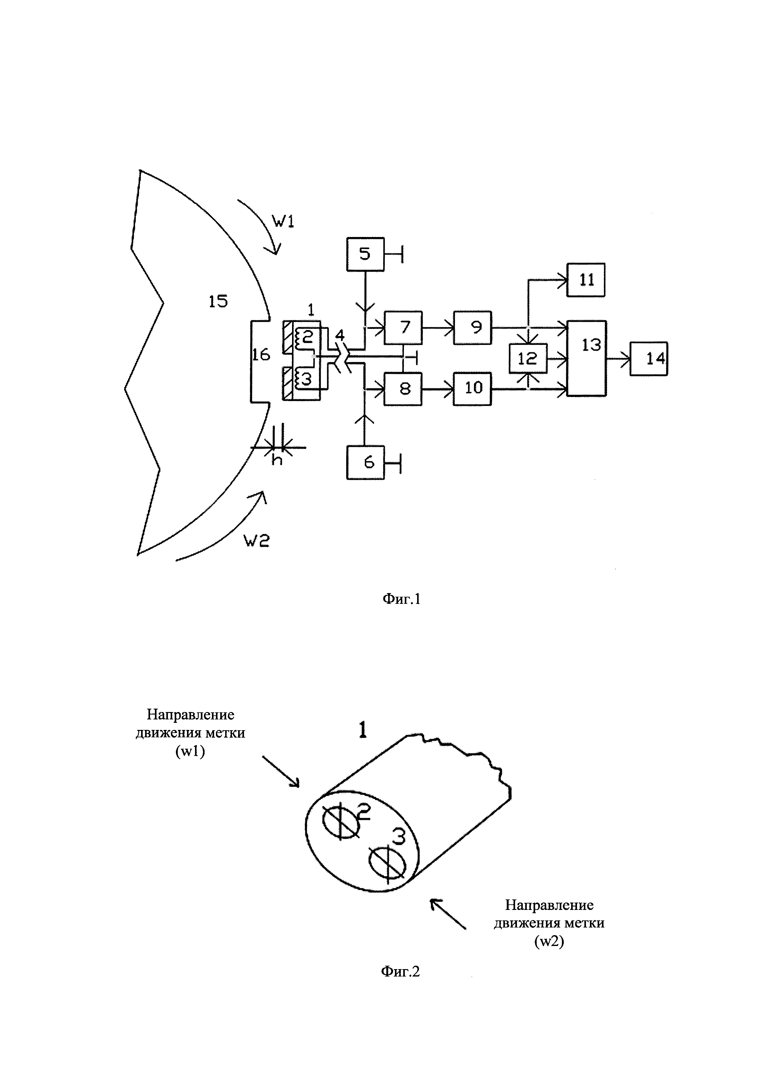 Изобретение относится к измерительной технике и может быть использовано для контроля вращения движущихся металлических частей. Сущность изобретения заключается в том, что вихретоковый измеритель скорости и направления вращения дополнительно содержит обмотку, которая подключена через соединительный кабель к выходу дополнительного автогенератора и входу дополнительного выпрямителя, выход которого через дополнительный формирователь импульсов подключен к первому входу логической схемы и первому входу элемента ИЛИ, второй вход логической схемы соединен с выходом первого формирователя импульсов, третий вход логической схемы соединен с выходом элемента ИЛИ, а выход логической схемы подключен к дополнительному индикатору, кроме того, дополнительная обмотка возбуждения установлена в одной плоскости рядом с основной обмоткой на расстоянии (0,5-1)D, где D - диаметр основной и дополнительной обмоток возбуждения, при этом диаметр измерительной метки на валу равен или больше (2,5-3)D. Технический результат – расширение функциональных возможностей устройства. 2 ил.