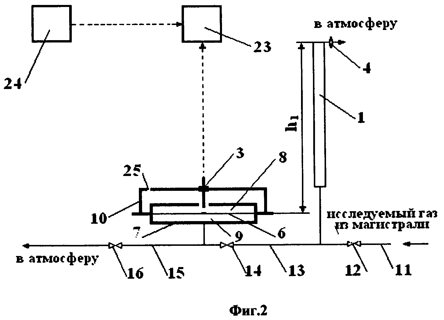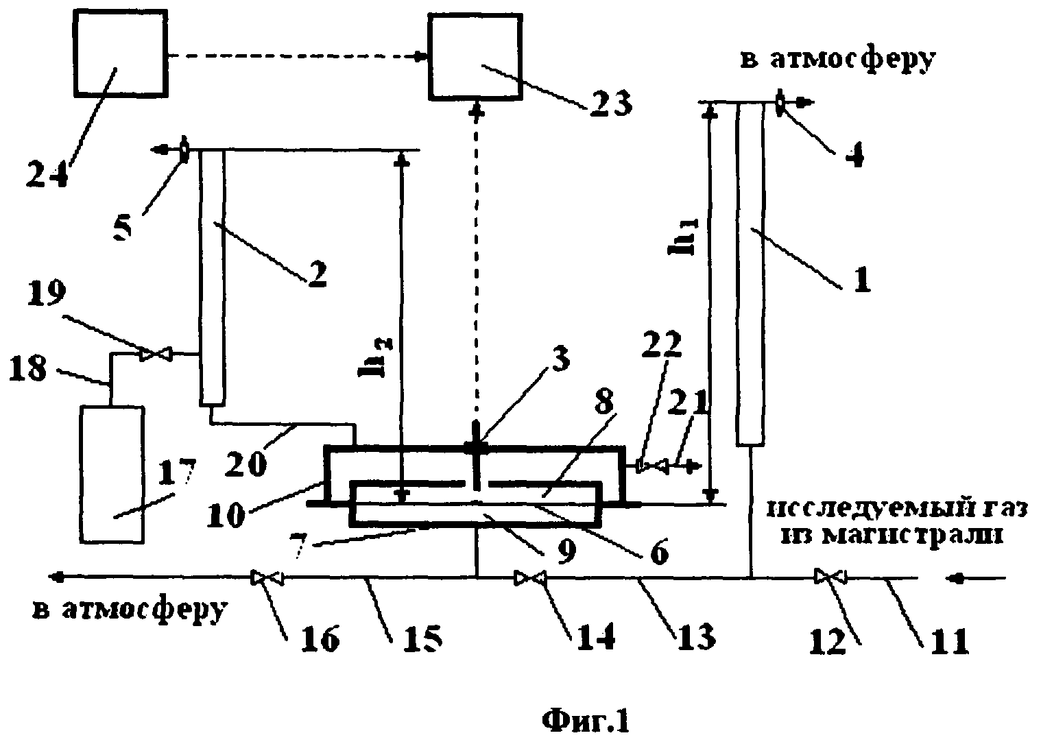 1. Газовый плотномер, содержащий два измерительных сосуда известной высоты соответственно для исследуемого и эталонного газов, устройство для выравнивания между собой давлений газов в верхней части сосудов и устройство выработки измерительного сигнала с чувствительным элементом, реагирующим на перепад давлений в нижней части сосудов, вызванный разностью плотностей столбов исследуемого и эталонного газов, и с датчиком перемещения указанного чувствительного элемента, отличающийся тем, что устройство для выравнивания давлений выполнено в виде двух дросселей, каждый из которых сообщен с атмосферой и с одним из сосудов со стороны его верхнего торца, чувствительный элемент - в виде эластичной мембраны, а устройство выработки измерительного сигнала - в виде камеры, разделенной перегородкой на два отсека, причем, по меньшей мере, частью перегородки служит указанная мембрана, и сосуды со стороны их нижних торцов подключены каждый к одному из указанных отсеков. 2. Газовый плотномер по п.1, отличающийся тем, что мембрана представляет собой круглую раму с натянутой на нее полимерной пленкой, скрепленной в центральной части с маркером перемещения, выполненным в виде пластины, имеющей форму центрально-симметричной плоской фигуры, и радиальных упругих нитей, равномерно натянутых между краями пластины и рамой. 3. Газовый плотномер, содержащий измерительный сосуд известной высоты для исследуемого газа, устройство для выравнивания между собой давлений эталонного газа и исследуемого газа в верхней части сосуда и устройство выработки измерительного сигнала с чувствительным элементом, реагирующим на перепад давлений, вызванный разностью плотностей равных столбов исследуемого и эталонного газов, и с датчиком перемещения указанного чувствительного элемента, отличающийся тем, что устройство для выравнивания давлений выполнено в виде дросселя, сообщенного с атмосферой и с сосудом со стороны его верхнего торца, чувствительный элемент - в виде эластичной мембраны, а устройство выработки измерительного сигнала - в виде камеры, разделенной перегородкой на два отсека, причем, по меньшей мере, частью перегородки служит указанная мембрана, сосуд со стороны своего нижнего торца подключен к одному из отсеков камеры, а другой отсек сообщен с атмосферой. 4. Газовый плотномер по п.3, отличающийся тем, что мембрана представляет собой круглую раму с натянутой на нее полимерной пленкой, скрепленной в центральной части с маркером перемещения, выполненным в виде пластины, имеющей форму центрально-симметричной плоской фигуры, и радиальных упругих нитей, равномерно натянутых между краями пластины и рамой.