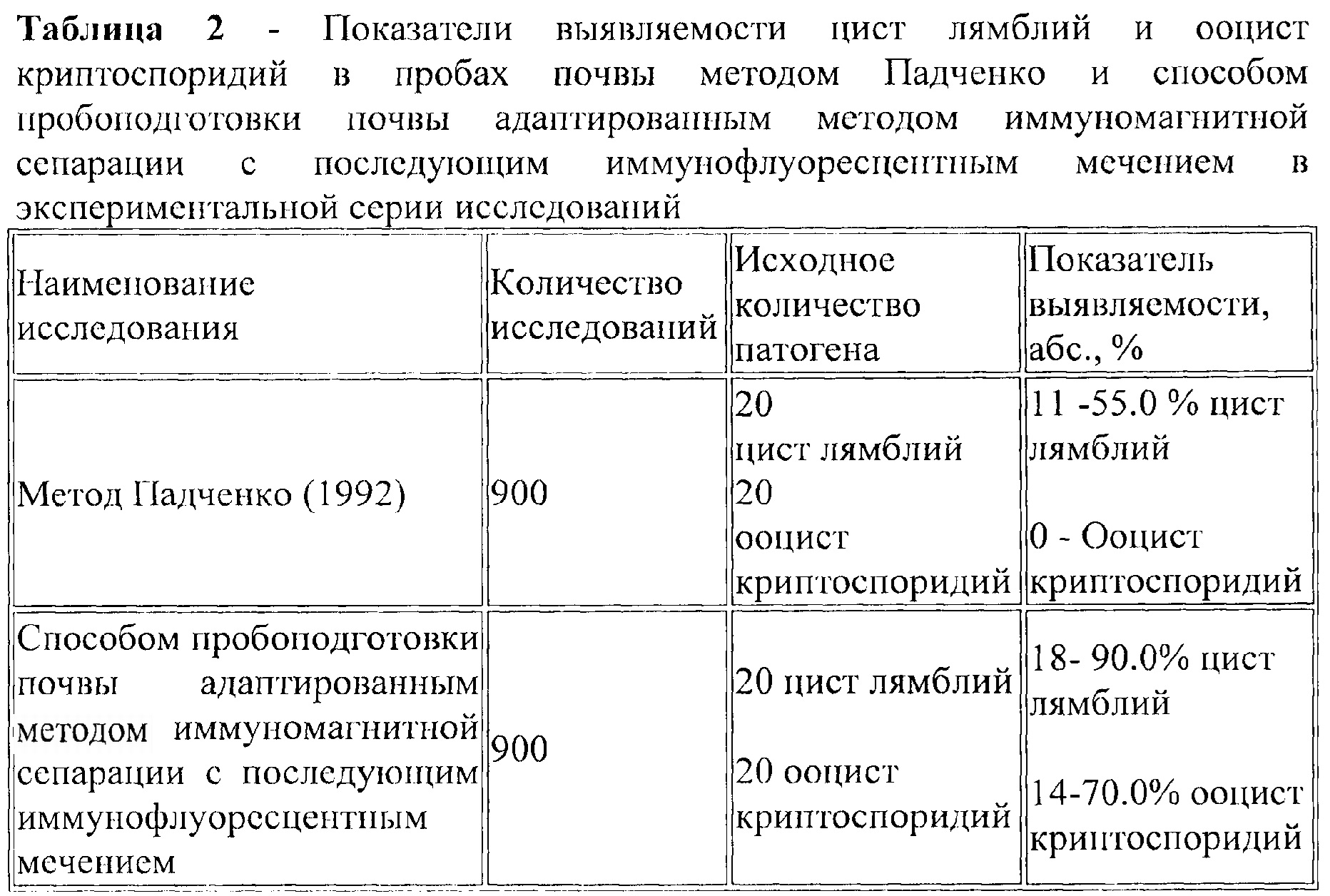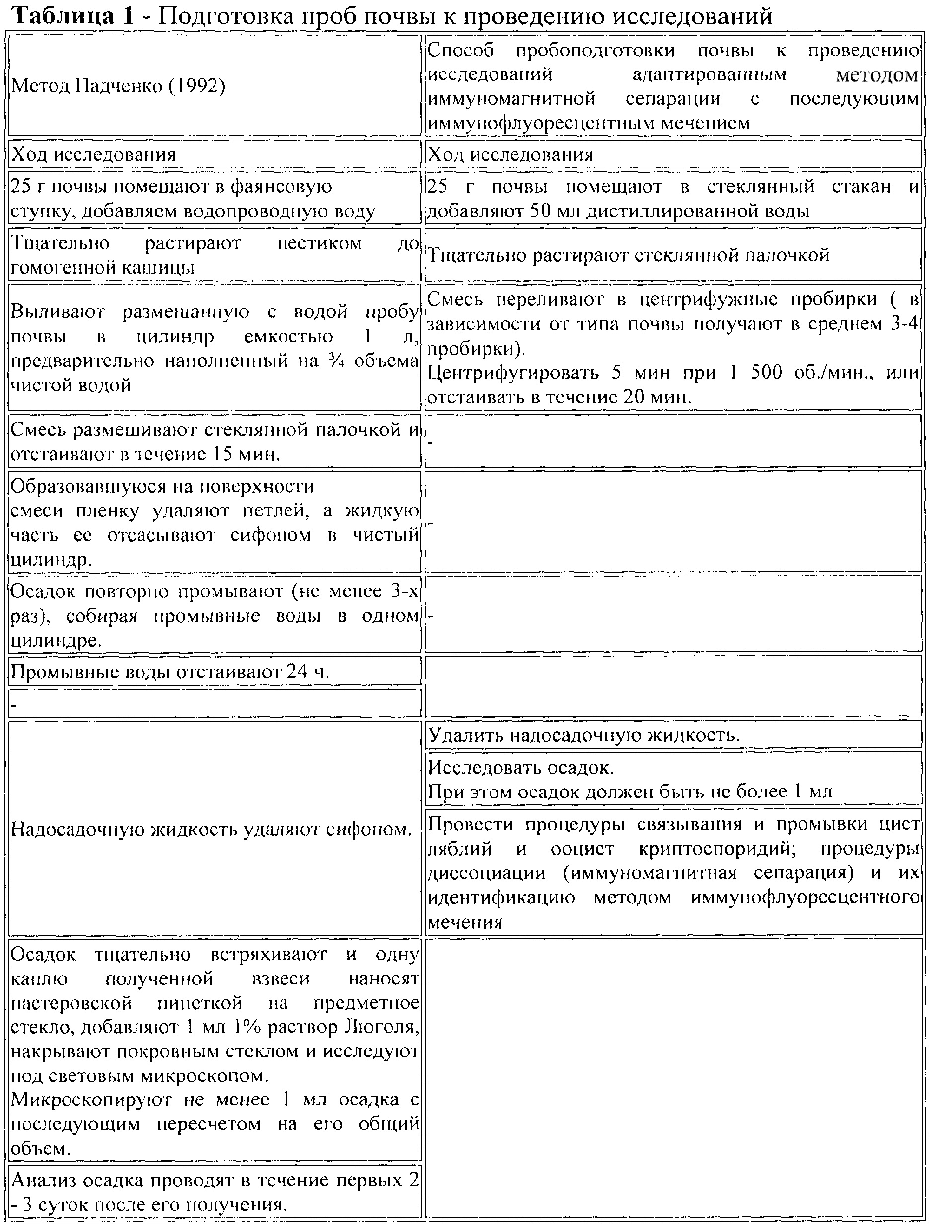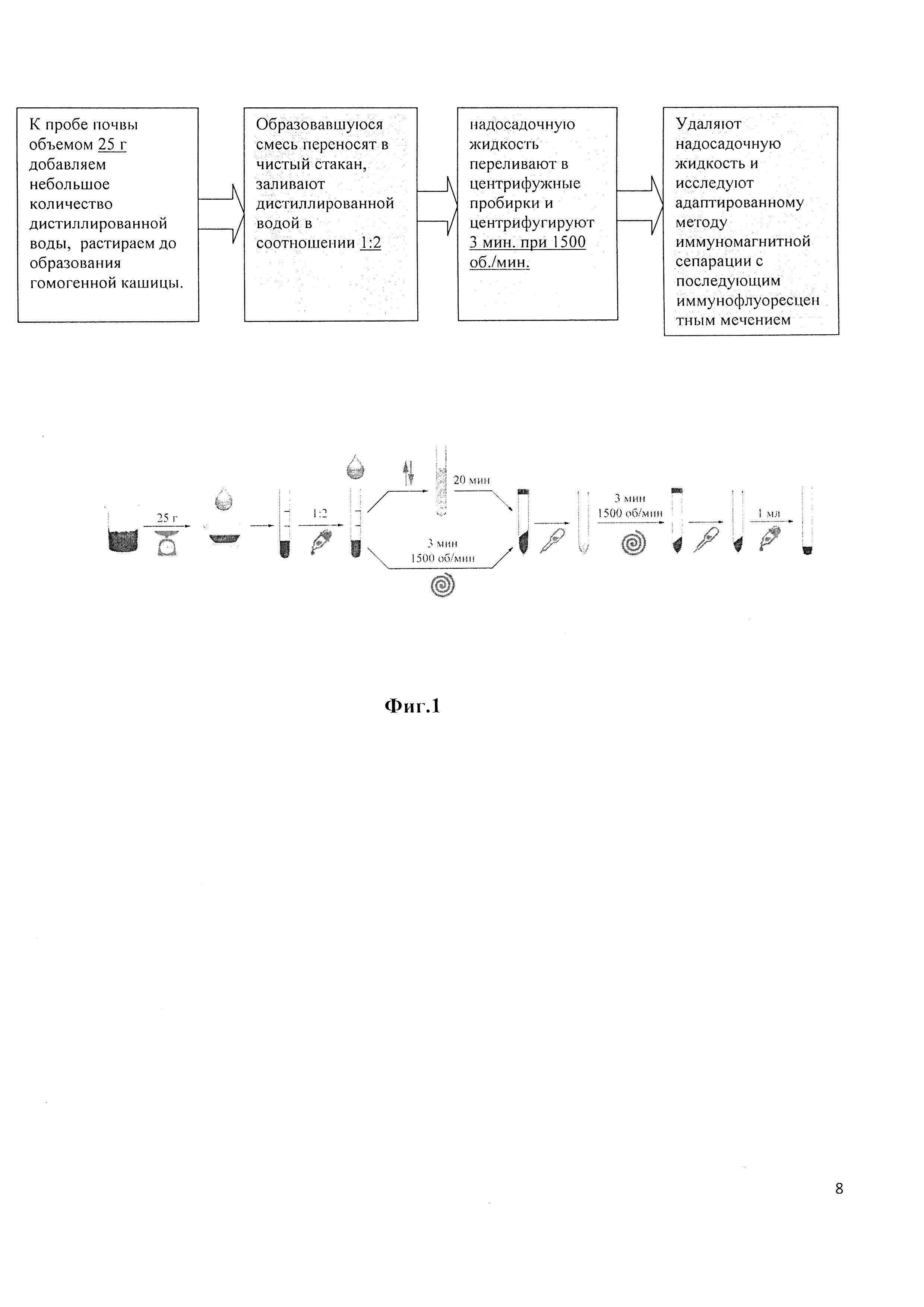 Способ пробоподготовки почвы для определения цист лямблий и ооцист криптоспоридий с использованием адаптивного метода иммуномагнитной сепарации с последующим иммунофлуоресцентным мечением, включающий отбор проб и поэтапные исследования, отличающийся тем, что при исследовании в отобранный объем пробы почвы добавляют дистиллированную воду, после чего взвесь перемешивают и отстаивают в течение экспериментально установленного времени 20 мин или центрифугируют 3 мин при 1500 об/мин, надосадочную жидкость переливают в центрифужные пробирки и центрифугируют 3 мин при 1500 об/мин, надосадочную жидкость из пробирок удаляют, полученный осадок исследуют адаптированным методом иммуномагнитной сепарации с последующим иммунофлуоресцентным мечением, при этом количество исследований рассчитывают по количеству полученных осадков таким образом, что в 25 мл надосадочной жидкости размещаются в 3 пробирки, после центрифугирования которых образуются 3 пробы осадка, по расчету 1 осадок на 1 исследование, при этом, если суммарный объем осадков в пробирках составляет не более 1,0 мл, их объединяют в одно исследование, после чего проводят определение цист лямблий и ооцист криптоспоридий адаптированным методом иммуномагнитной сепарации с последующим иммунофлуоресцентным мечением, результат учитывают исходя из того, что цисты лямблий представляют собой сверкающие и флюоресцирующие яблочно-зеленым светом объекты, от округлых до овальных, от 8 до 14 мкм в длину, от 7 до 10 мкм в ширину, с ярко подсвеченными краями, ооцисты криптоспоридий представляют собой сверкающие и флюоресцирующие яблочно-зеленым светом объекты от овальных до сферических от 3 до 5 мкм в диаметре, с ярко подсвеченными краями.