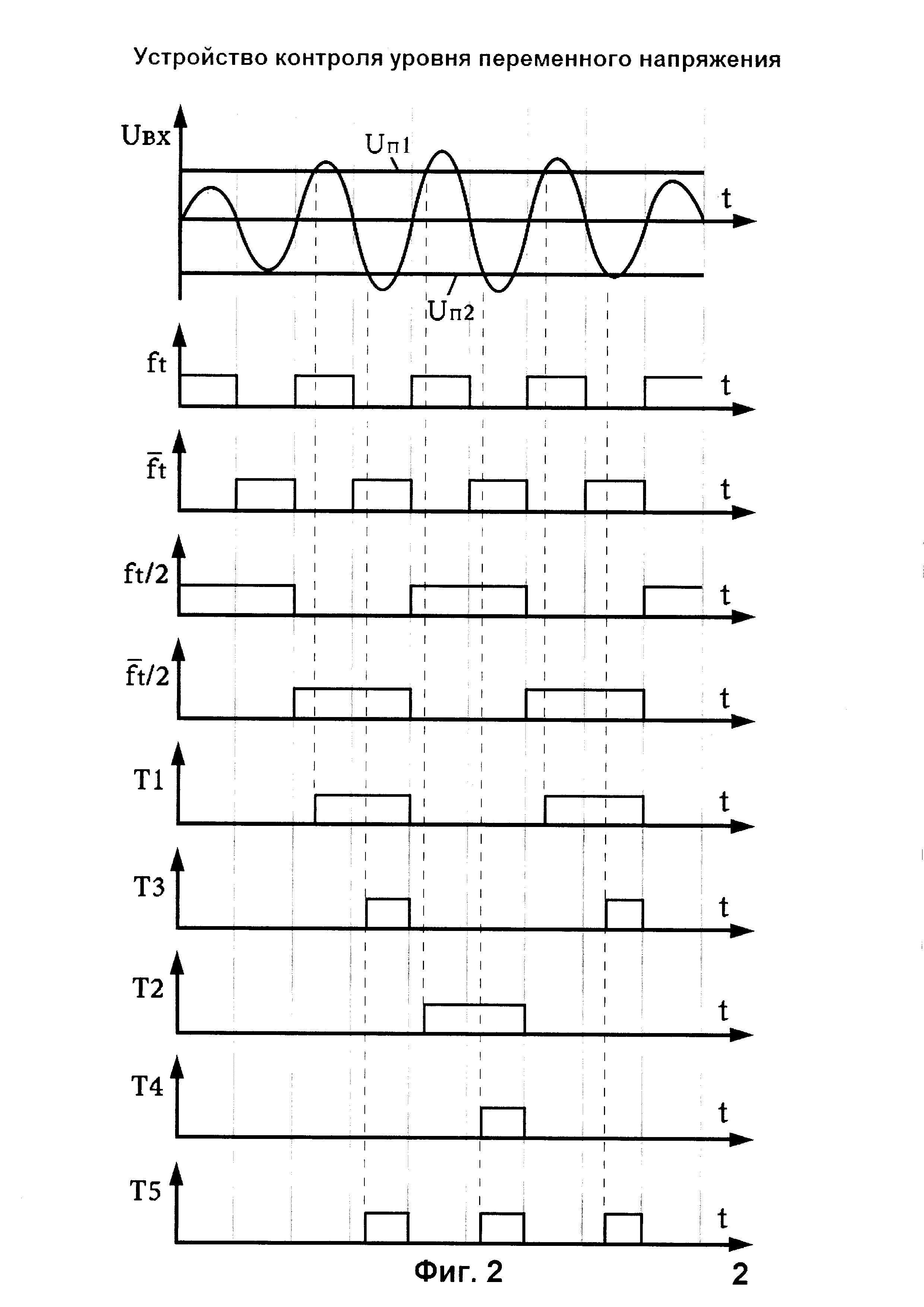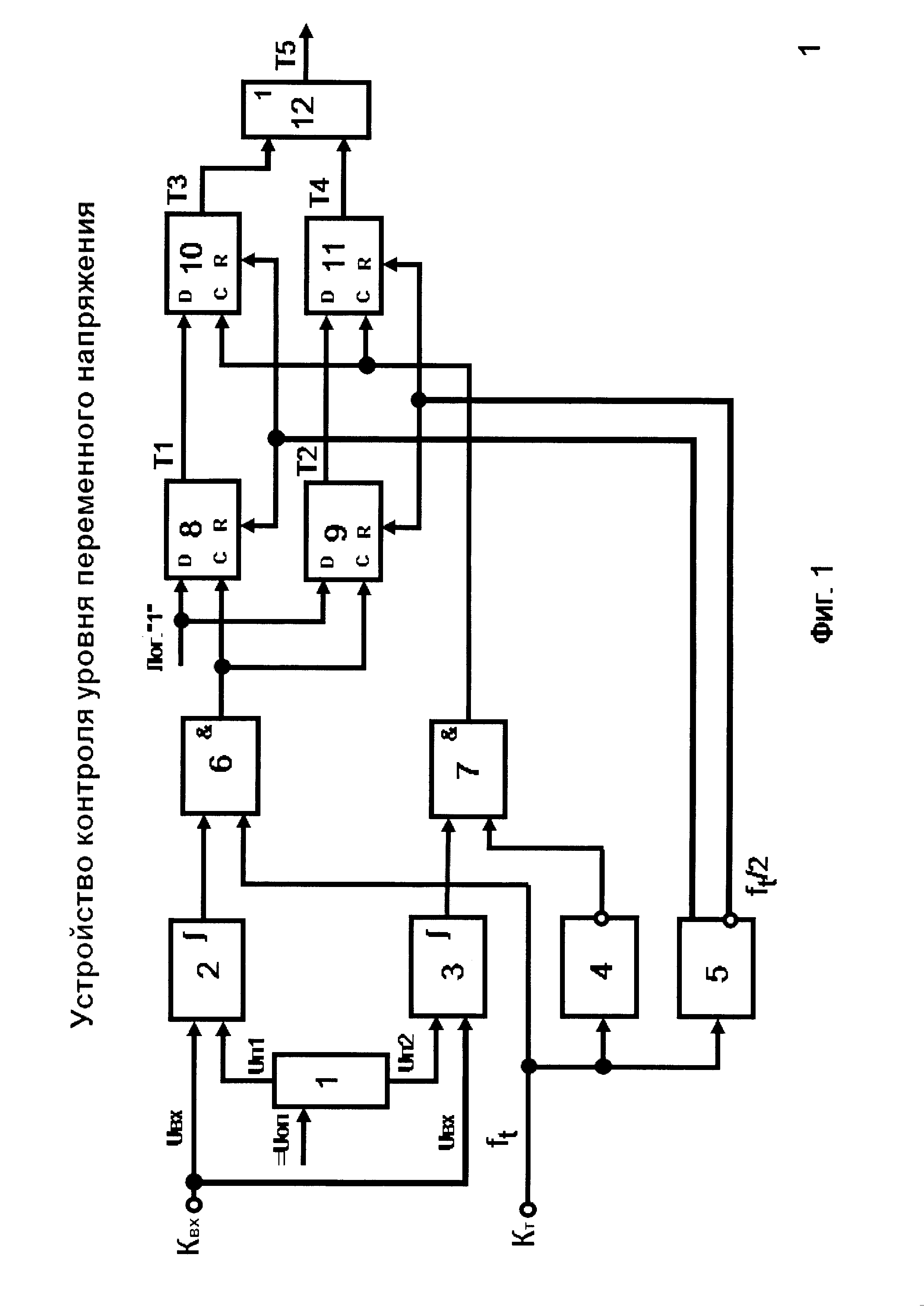 Изобретение относится к контрольно-измерительной технике, предназначено для допускового контроля уровня переменного напряжения, в том числе амплитуды сигналов индукционных датчиков, и может быть использовано в системах автоматики и телемеханики, где требуется высокая точность, быстродействие и помехоустойчивость. Известно двухпороговое устройство контроля уровня напряжения, описанное в авторском свидетельстве SU 995003 с приоритетом от 07.08.1981 г., содержащее делитель опорного напряжения, инвертор, три пороговых элемента, соединенные первыми входами с соответствующими выводами делителя опорного напряжения, а вторыми - с входной клеммой устройства, два триггера, первые входы которых соединены с выходами соответствующих пороговых элементов, элемент совпадения, входы которого соединены с выходами соответствующих триггеров, и исполнительный орган, в котором выход третьего порогового элемента соединен с входом инвертора и первым входом исполнительного органа, выход инвертора соединен с вторыми входами триггеров, а второй вход исполнительного органа соединен с выходом элемента совпадения. Недостатком известного устройства является восприимчивость к импульсным помехам в измерительных цепях, вызывающих ложные срабатывания устройства. Прототипом является двухпороговое устройство контроля уровня напряжения, описанное в авторском свидетельстве SU 625167 с приоритетом от 03.04.1975 г., содержащее делитель опорного напряжения с двумя выходами, которые подключены к входам двух пороговых устройств, элемент совпадения и исполнительный орган, при этом в него введены генератор тактовых импульсов, дифференцирующая цепь, элемент запрета и два триггера, каждый из которых включен между выходом соответствующего порогового устройства и входом элемента совпадения, выход которого через элемент запрета соединен с входом исполнительного органа, причем выход генератора тактовых импульсов подключен ко второму входу элемента запрета и через дифференцирующую цепь соединен с установочными входами триггеров. Недостатком прототипа является восприимчивость к импульсным помехам в измерительных цепях, вызывающих ложные срабатывания устройства. Задача изобретения - повышение помехоустойчивости устройства при сохранении высокого быстродействия. На фиг. 1 изображена функциональная схема устройства, на фиг. 2 - эпюры напряжений в различных точках схемы. Устройство контроля уровня переменного напряжения содержит (фиг. 1): Кт - входная клемма К - клемма тактового сигнала 1 - делитель опорного напряжения; 2 - первый пороговый элемент; 3 - второй пороговый элемент; 4 - инвертор; 5 - делитель частоты на два; 6 - первый элемент совпадения; 7 - второй элемент совпадения; 8 - первый триггер; 9 - второй триггер; 10 - третий триггер; 11 - четвертый триггер; 12 - исполнительный орган. Элементы устройства контроля уровня переменного напряжения имеют следующие связи: Первый и второй выходы делителя опорного напряжения (1) подключены к первым входам первого (2) и второго (3) пороговых элементов, вторые входы которых соединены с входной клеммой (Квх) устройства. Выход первого порогового элемента (2) соединен с первым входом первого элемента совпадения (6), а выход второго порогового элемента (3) соединен с первым входом второго элемента совпадения (7). Второй вход первого элемента сов
