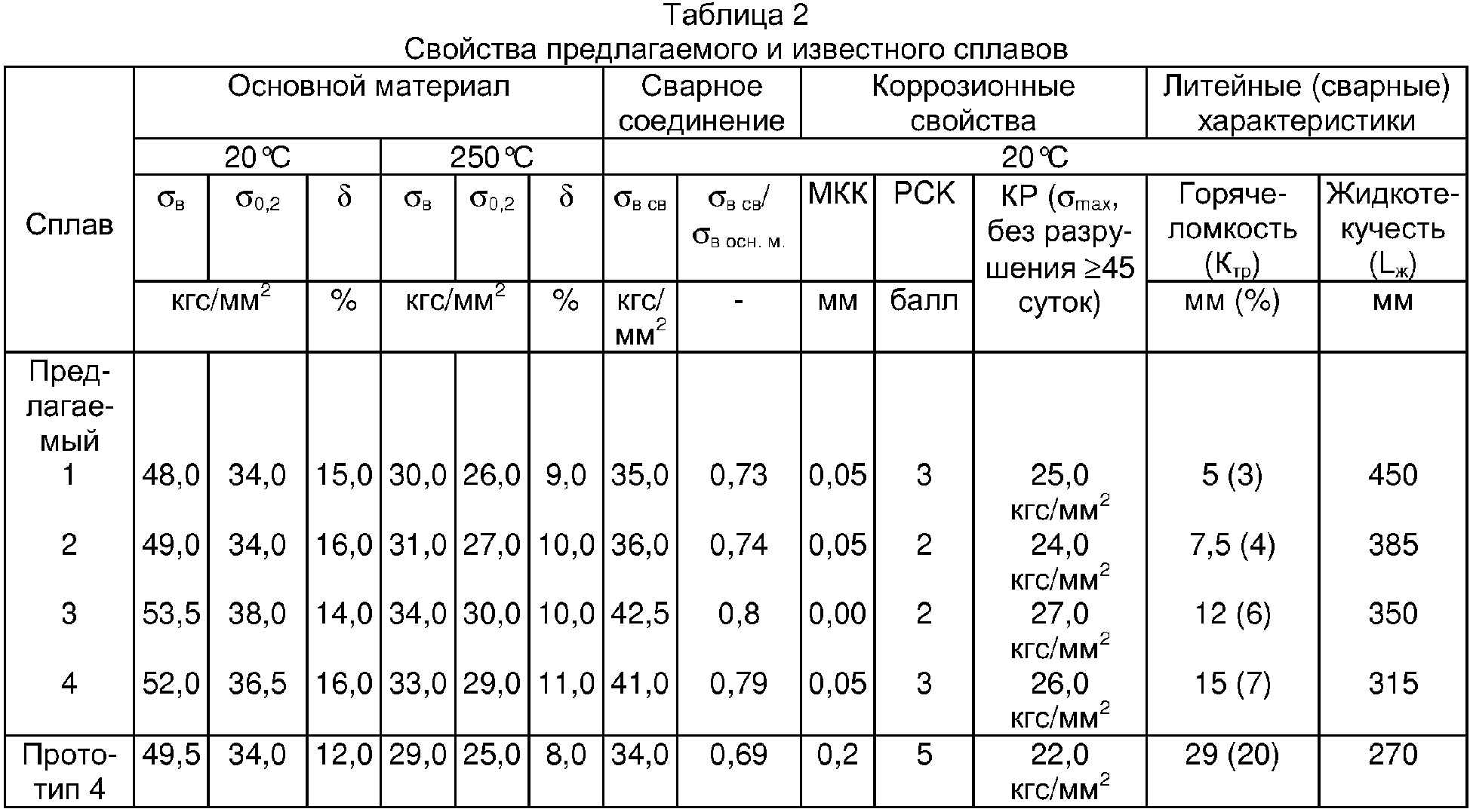 коррозионному растрескиванию под напряжением - ГОСТ 9.019. В таблице 2 представлены механические свойства предлагаемого сплава и сплава-прототипа. Как видно из таблицы 2,