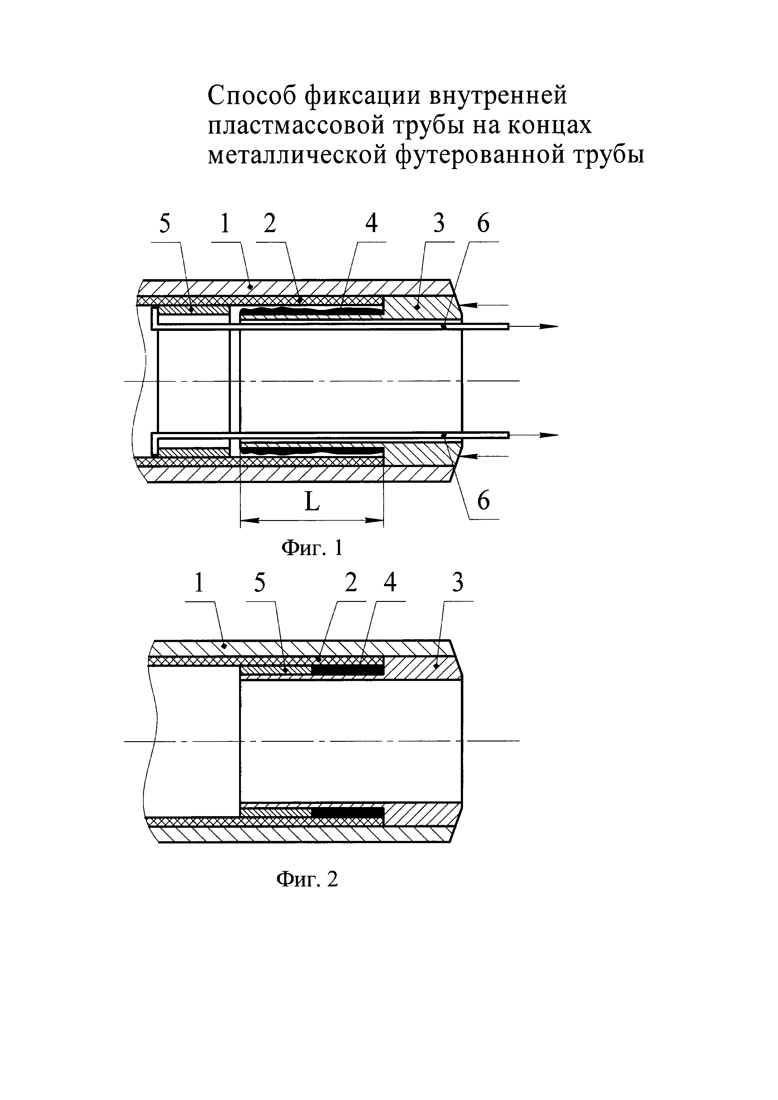 Способ фиксации внутренней пластмассовой трубы на концах металлической трубы, включающий футерование внутренней поверхности металлической трубы пластмассовой трубой, удаление концов пластмассовой трубы от торцов металлической трубы на длину, превышающую длину зоны термической деструкции пластмассовой трубы от места соединения металлических труб сваркой, закрепление концов пластмассовой трубы к внутренней поверхности концов металлической трубы втулками, отличающийся тем, что втулку изготавливают цельной из материала, близкого по свойствам материалу металлической трубы, на наружной поверхности втулки выполняют проточку длиной, достаточной для герметичного соединения с пластмассовой трубой, и диаметром меньше внутреннего диаметра пластмассовой трубы, поверхность втулки покрывают полимерным антикоррозионным покрытием, перед установкой втулки на нее снаружи наносят клеевой состав с заполнением проточки, конец пластмассовой трубы разогревают на длину не менее длины проточки до температуры, обеспечивающей максимальную адгезию пластмассы с клеящим составом, нанесенным на втулку, перед установкой которой внутрь пластмассовой трубы вставляют полый толкатель с наружным диаметром меньше внутреннего диаметра пластмассовой трубы, а внутренним - больше наружного диаметра проточки, установку втулки внутрь металлической трубы производят до совмещения торца проточки с торцом пластмассовой трубы, клеящий состав прижимают к внутренней поверхности пластмассовой трубы и к наружной поверхности проточки путем механического уплотнения толкателем в осевом направлении.