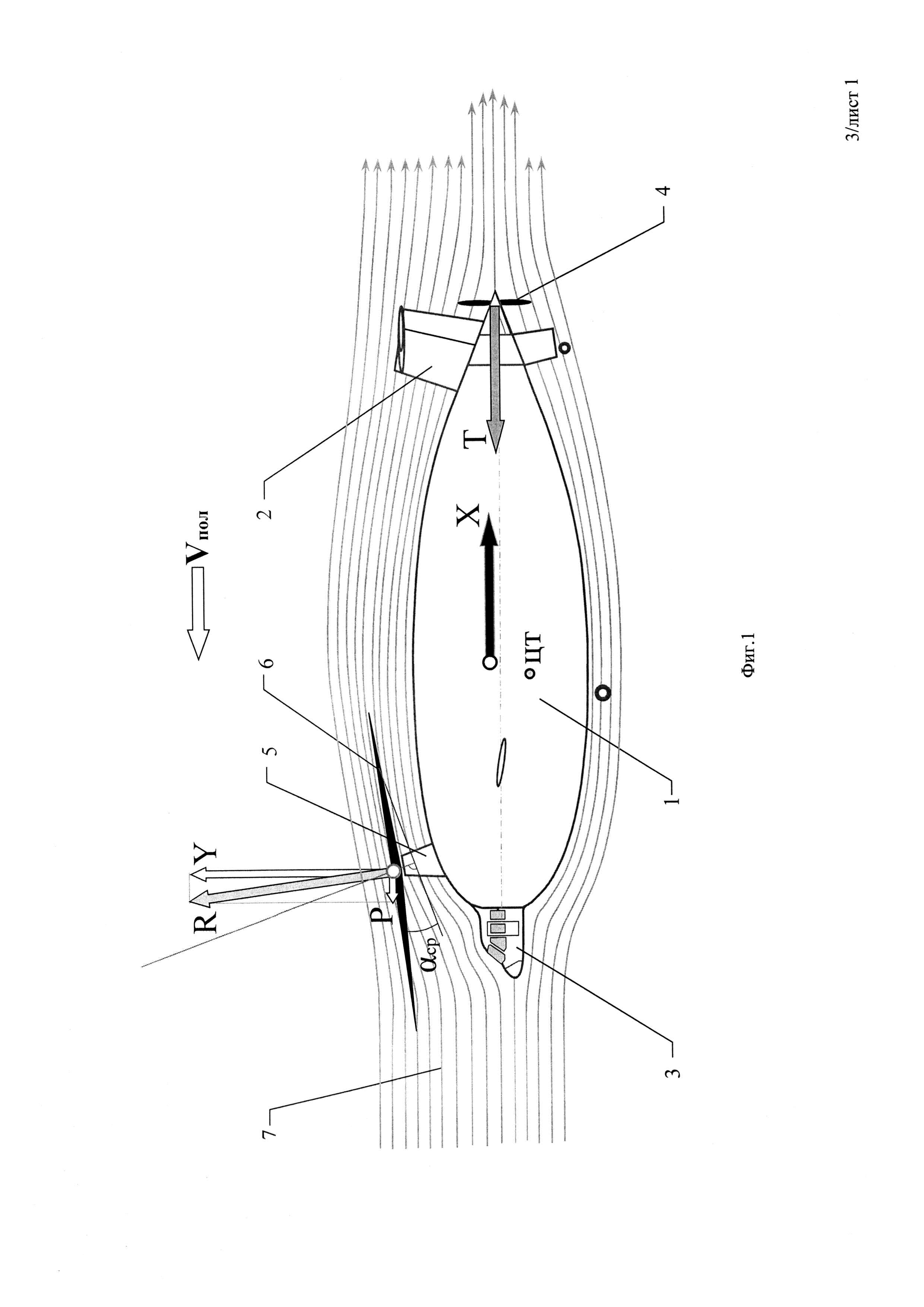 1. Устройство вертостата с автожирным винтом, содержащим оболочку, наполненную несущим газом, автожирный несущий винт, кабину для экипажа с пассажирами, хвостовое оперение, силовую установку и шасси, отличающееся тем, что с целью получения тянущей горизонтальной составляющей полной аэродинамической силы автожирного винта, кабан автожирного винта установлен в носовой части вертостата в зоне наибольшего изменения кривизны образующей поверхности оболочки с таким расчетом, чтобы максимальные отклонения элементарных воздушных струек притекающего к плоскости винта потока приходились на центральную область ометаемой площади винта. 2. Устройство вертостата с автожирным винтом по п. 1, отличающееся тем, что автожирный винт включен в систему управления по курсу и тангажу с возможностью создания моментов боковых и продольных сил относительно центра тяжести вертостата.