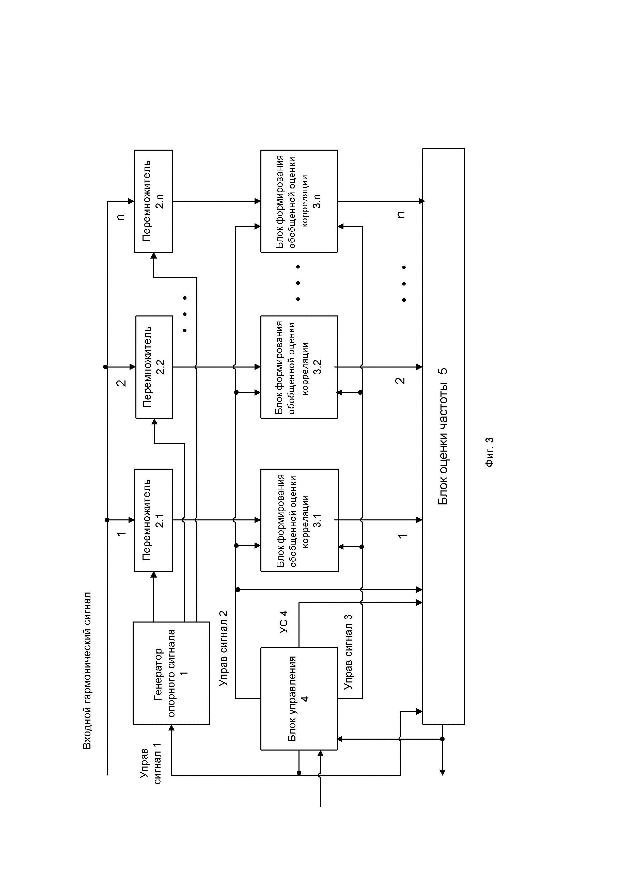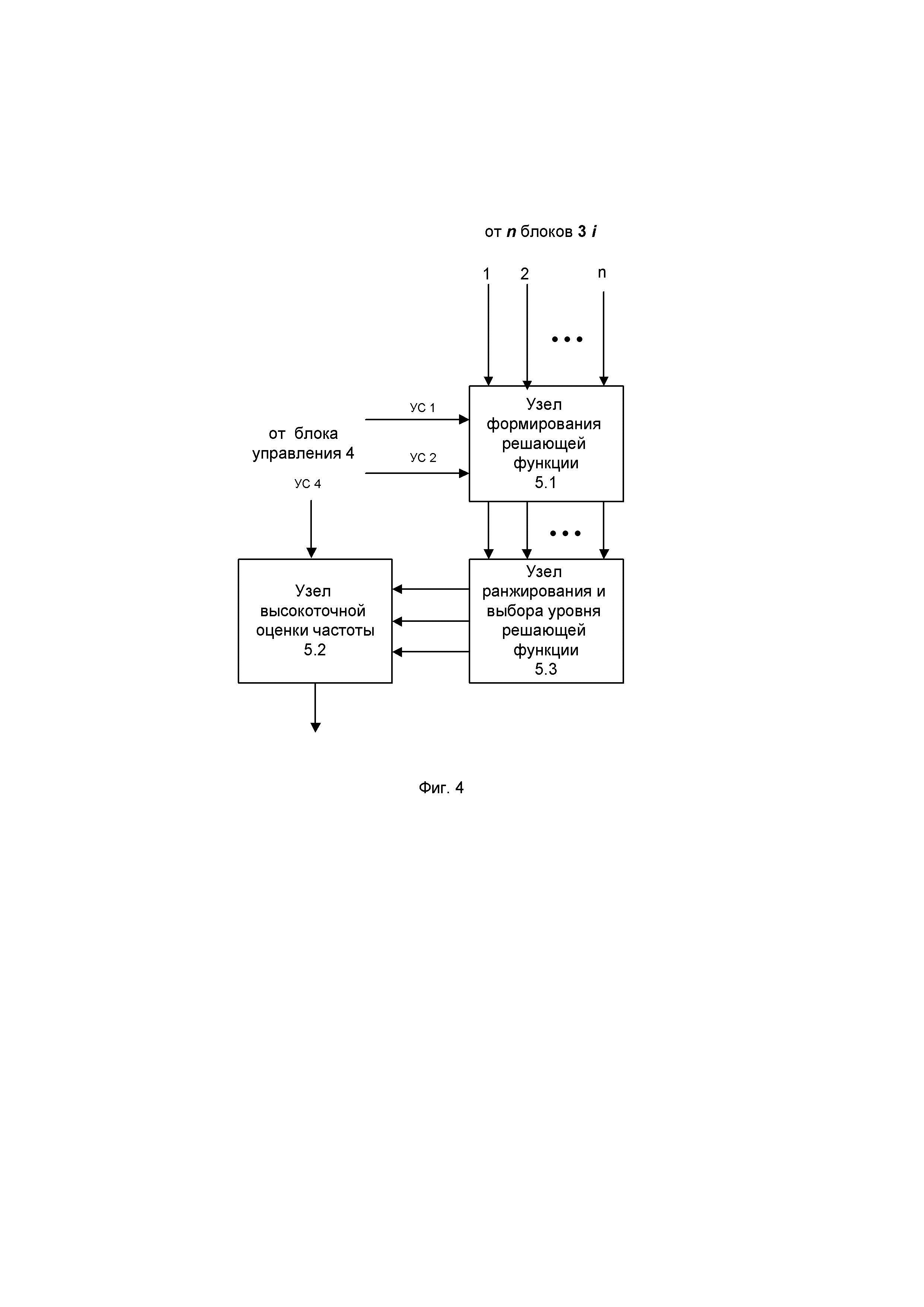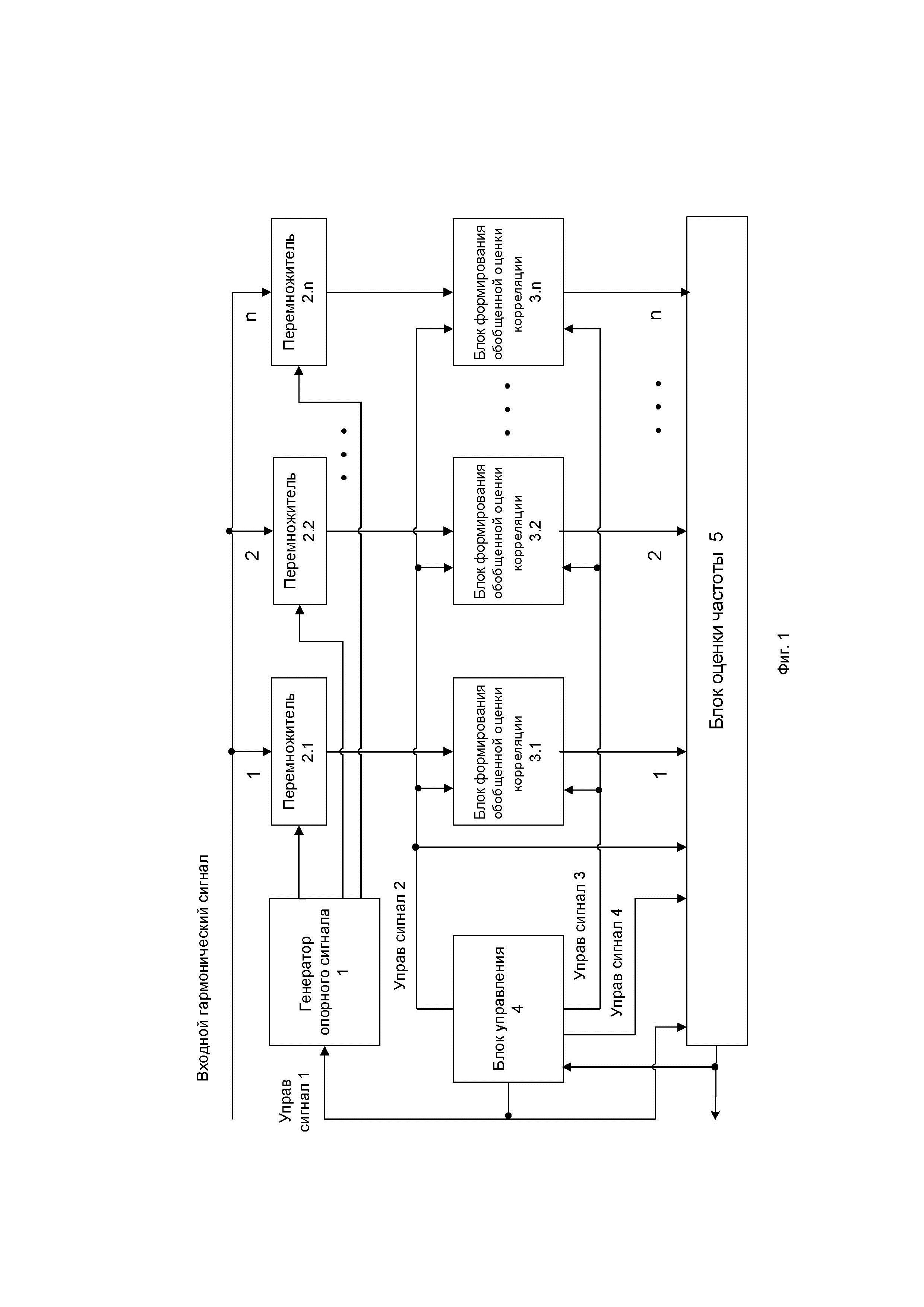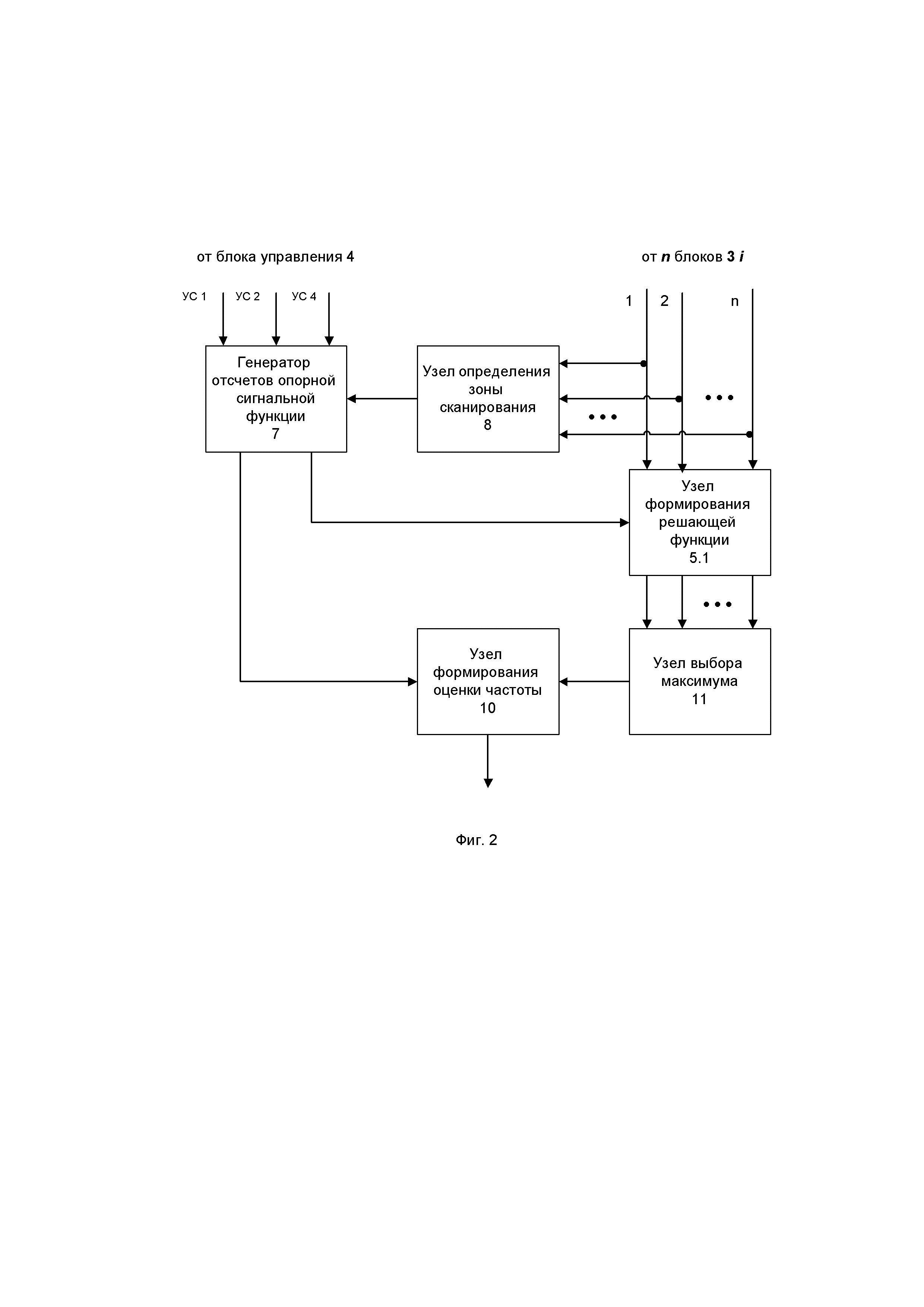 Изобретение относится к области радиотехники, в частности к устройствам частотной синхронизации широкополосного сигнала (ШПС) в системах радиосвязи и сотовых системах связи множественного доступа с кодовым разделением каналов (Code Division Multiple Access – CDMA). Известно, что прием и обработку широкополосного сигнала (ШПС) в любой цифровой системе связи невозможно осуществить без выполнения процедур оценки временного положения и несущей частоты входного сигнала. При этом качество выделяемой информации напрямую зависит от точности оценки временного положения и несущей частоты ШПС и степени их близости к истинному значению. Величина возможного рассогласования между несущей частотой принимаемого ШПС и частотой опорного сигнала Вопросам анализа и реализации устройств частотной синхронизации на практике достаточно большое внимание уделяется в работах [1–14]. Наиболее часто используемыми являются фазовые методы определения частоты. Принципиальные различия между всеми существующими фазовыми методами определения частоты состоят в реализации операции преобразования постоянного сдвига фазы в измеряемый параметр, однозначно связанный с существующим сдвигом частоты. Одним из наиболее простых способов оценки постоянного сдвига фазы сложного фазоманипулированного сигнала является выделение фазового сдвига между двумя последовательно принятыми комплексными символами и последующее их усреднение [5]. Эту операцию можно реализовать как перемножение комплексного отсчета принятого сигнала с комплексно-сопряженным предыдущим с последующей фильтрацией полученной комбинационной составляющей. Наиболее близким аналогом по технической сущности к предлагаемому устройству высокоточной оценки несущей частоты сигнала в широкополосных системах связи является устройство по первому варианту реализации, описанное в патенте [8], принятый за прототип. Устройство-прототип предназначено для решения задачи автоподстройки частоты с высокой точностью оценки в большом априорном интервале возможных рассогласований частоты, низком отношении сигнал/шум и малых программных и аппаратных затратах при реализации данного способа на практике. В устройстве-прототипе используют принцип многоканального приемника [3], состоящего из Для удобства анализа и наглядности рассмотрения заявляемого технического решения выполним укрупнение схемы устройства-прототипа. Укрупненная схема устройства-прототипа представлена на фиг. 1, где введены следующие обозначения: 1 – генератор опорного сигнала; 4 – блок управления (БУ); 5 – блок оценки частоты. Устройство-прототип содержит генератор опорного сигнала 1, Следует отметить, что укрупненная блок-схема устройства-прототипа определения частоты согласно описанию [8] является одинаковой по предложенным первому и второму вариантам реализации устройства-прототипа. Различие выполнения вариантов заключается только в структуре блока оценки частоты 5. Наиболее близким к заявляемому устройству является устройство-прототип по первому варианту реализации. Укрупненная структурная схема блока оценки частоты 5 устройства-прототипа по первому варианту реализации приведена на фиг. 2, где введены следующие обозначения: 7 – генератор отсчетов опорной сигнальной функции; 8– узел определения зоны сканирования; 5.1 – узел фо