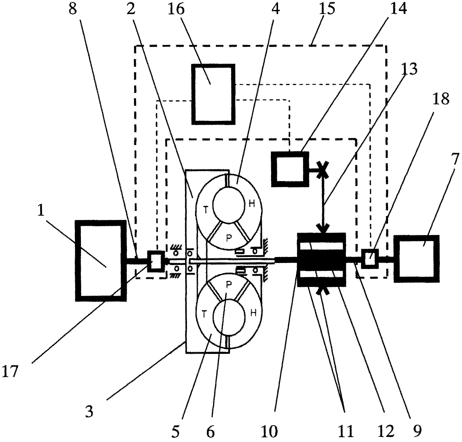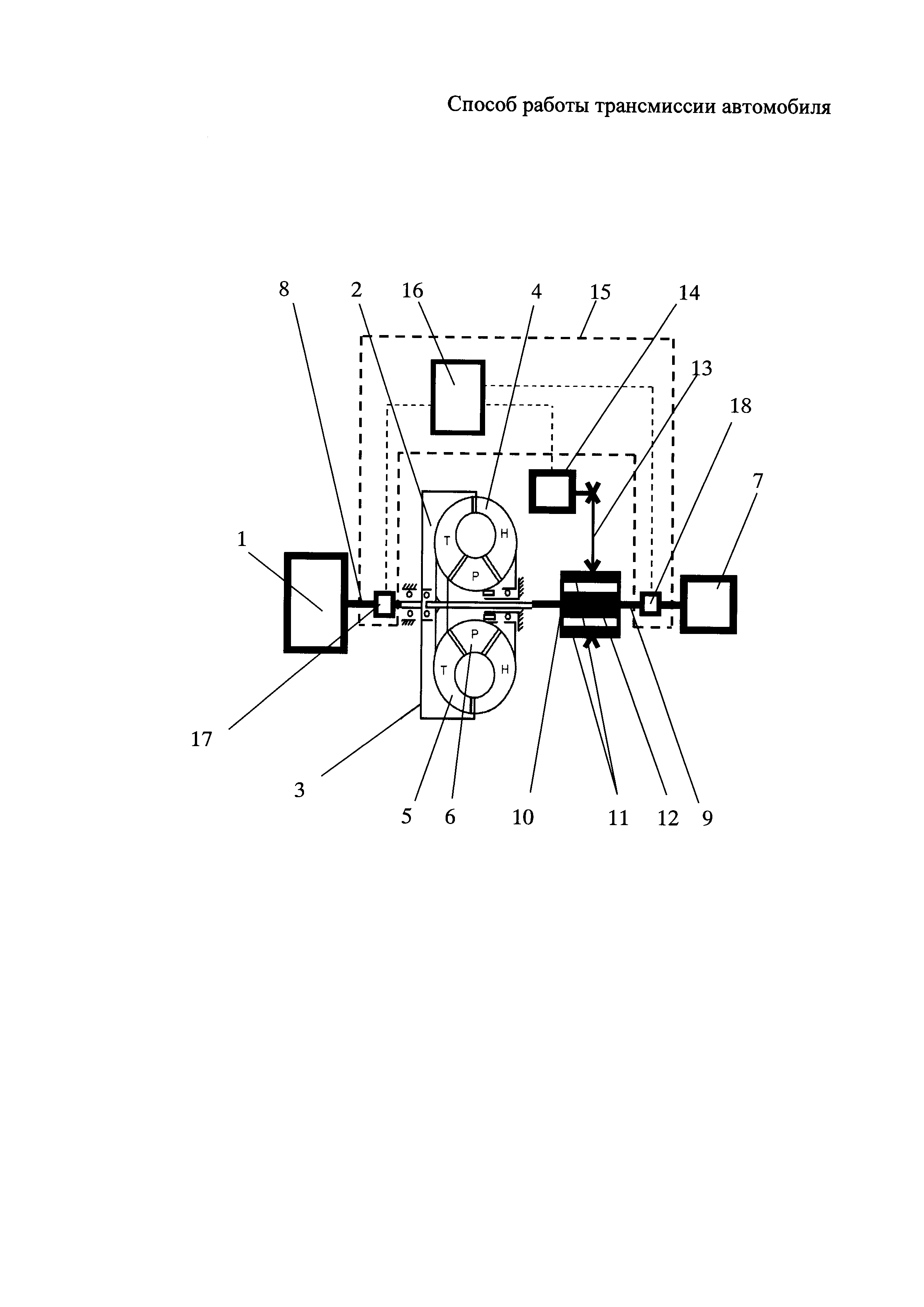 Изобретение относится к области машиностроения, преимущественно к способам работы трансмиссий транспортных средств. Известен способ работы трансмиссии транспортного средства на примере гидродинамической передачи, включающей гидротрансформатор, содержащий насосное и турбинное колеса и реактор. В устройстве реализуется способ работы трансмиссии автомобиля, заключающийся в том, что при вращении ведущего вала крутящий момент от привода передают посредством гидротрансформатора, заполненного рабочей жидкостью, на ведомый вал, причем в гидротрансформаторе, состоящем из насосного и турбинного колес и реактора (статора), предусматривают установку сменных лопаток, а каждое из рабочих колес выполняют составным, средние части которых сопрягают со сменными лопатками. При этом, изменяя поворот сменных лопаток или заменяя их другими, изменяют мощность, передаваемую от двигателя и воспринимаемую гидротрансформатором, что позволяет исследовать влияние большого числа геометрических параметров лопастной системы (см. А.С. СССР №241187, МПК F16H 41/00, опубл. 1969 г.). Недостаток способа состоит в том, что гидротрансформатор является экспериментальным и применим в узкой области, а именно для исследования влияния геометрических параметров на передаточные свойства гидротрансформатора. Кроме того, известна гидродинамическая передача, включающая регулируемый гидротрансформатор, содержащий насосное и турбинное колеса, а также реактор. Устройство реализует способ работы трансмиссии автомобиля, выбранный в качестве прототипа и заключающийся в том, что при вращении ведущего вала крутящий момент от привода плавно передают с помощью гидротрансформатора на ведомый вал и к коробке переключения передач. Причем в гидротрансформаторе, состоящем из насосного и турбинного колес и реактора, последний выполняют с неподвижными лопаточными венцами. При этом регулирование параметров рабочей жидкости осуществляют, изменяя положение подвижного венца реактора (см. А.С. СССР №369317, МПК F16H 41/08, опубл. 1973 г.). Известный способ позволяет повысить энергоемкость - момент на ведущем валу, однако имеет следующие недостатки: малый диапазон регулирования, значительные механические потери в гидродинамической передаче трансмиссии при регулировании параметров работы в связи с наличием в конструкции трущихся поверхностей, что в итоге приводит к снижению ресурса работы. Технической задачей настоящего изобретения является снижение механических потерь в гидродинамической передаче и повышение за счет этого мощности трансмиссии в целом. Решение поставленной технической задачи достигается тем, что в способе работы трансмиссии автомобиля, заключающемся в том, что при работе двигателя крутящий момент от ведущего вала посредством гидротрансформатора, корпус которого заполнен рабочей жидкостью, передают на ведомый вал и коробку переключения передач, осуществляя при этом регулирование угловых скоростей до момента их последующего плавного выравнивания на ведущем и ведомом валах, согласно изобретению трансмиссию дополнительно снабжают устанавливаемой на ведомом валу магнитной муфтой с внешним и внутренним магнитными роторами, а также электродвигателем, в процессе работы автоматически контролируют угловые скорости ведущего и ведомого валов, в соответствии с к