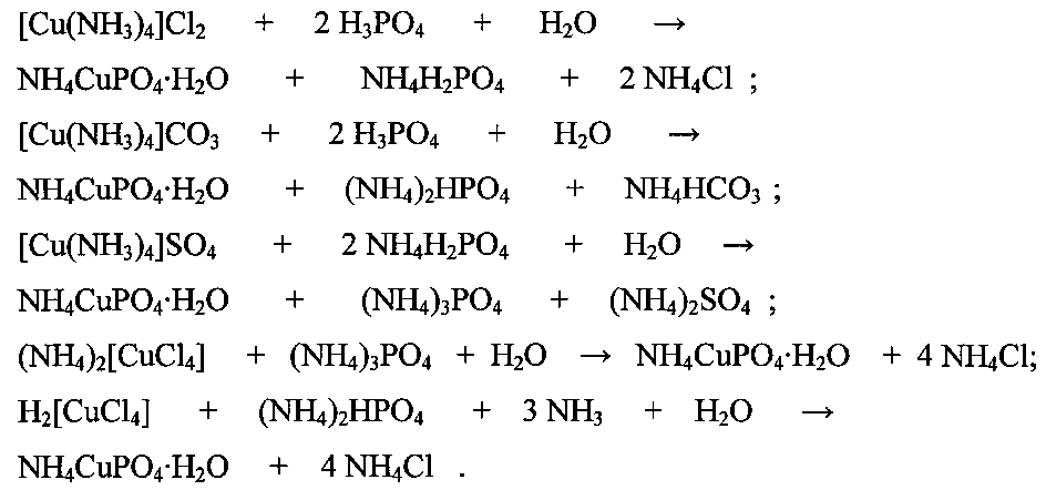 Изобретение относится к химической технологии неорганических веществ и к промышленной экологии, в частности к способам получения фосфатов меди(+2) и к способам переработки токсичных жидких отходов меди(+2), которые образуются при получении медных покрытий, обработке поверхности медных деталей, производстве печатных плат. Растворы, содержащие медь(+2) в высокой концентрации, являются токсичными отходами многих технологических процессов. В больших количествах они образуются при производстве печатных плат, получении медных покрытий, обработке поверхности меди и ее сплавов, синтезе органических веществ и производстве медноаммиачных волокон. Медь является ценным цветным металлом, поэтому необходимо извлекать медь(+2) из отработанных растворов либо в форме металла, либо в форме какого-либо химического соединения для того, чтобы вернуть дорогой и дефицитный компонент отходов производства в хозяйственный оборот. Из уровня техники известно несколько способов получения двойной соли фосфата меди(+2)-аммония, которая кристаллизуется из водного раствора в форме моногидрата состава ΝΗ4CuΡΟ4·H2Ο. Известен способ получения моногидрата фосфата меди(+2)-аммония, включающий обработку водой при 35°C соединения (NH4)4[Cu(NH3)2](PO4)2·7H2O (Синтезы неорганических соединений (под ред. Джолли У.). Т. 2. М.: Мир. 1967. С. 209). Недостатком способа является его сложность и необходимость затрат на реагенты (исходное соединения получают, используя оксид меди(+2), аммиак, фосфорную кислоту). Известен способ получения моногидрата фосфата меди(+2)-аммония, включающий растворение оксида меди(+2) в избытке фосфорной кислоты при нагревании с последующей нейтрализацией раствора газообразным аммиаком (Тураев З., Хакимова В.К., Тухтаев С. Взаимодействие оксида меди с фосфатами аммония // Узб. хим. журн. 1985. №4. С. 43-45). Недостатком способа является необходимость затрат на реагенты и на нагревание раствора. Известен способ получения моногидрата фосфата меди(+2)-аммония, включающий приготовление реакционного водного раствора, содержащего медь(+2), фосфат и аммоний, в котором реакционный водный раствор готовят по реакции порошкообразной металлической меди с карбонатом аммония в водной среде с последующим добавлением раствора фосфорной кислоты (Копилевич В.А., Войтенко Л.В., Щегров Л.Н., Панчук Т.К. Способ получения моногидрата фосфата меди-аммония. Патент РФ №2051089. Опубл. 1995). Недостатком способа является необходимость затрат на реагенты и на нагревание раствора. Известен способ получения моногидрата фосфата меди(+2)-аммония, включающий приготовление реакционного водного раствора, содержащего медь(+2), фосфат и аммоний, в котором источником меди(+2) является сульфат меди, источником аммония является аммиак, а источником фосфата - раствор, полученный щелочным гидролизом некондиционного пестицидного препарата O,O-диметил-S(N-метилкарбамоилметилди-тиофосфат) (Ранський А.П., Петрук Р.В. Повний лужний гiдролiз некондицiйного пестицидного препарату диметоат з отриманням екологiчно безпечних продуктiв // Вюник НАУ. 2012. №1. С. 258-265). Способ позволяет утилизировать фосфат натрия, образующийся при гидролизе некондиционного пестицида. Недостатком способа является необходимость материальных затрат на сульфат меди(+2). Способ не предусматривает утилизацию жидких отходов меди(+2). Известен способ получения 