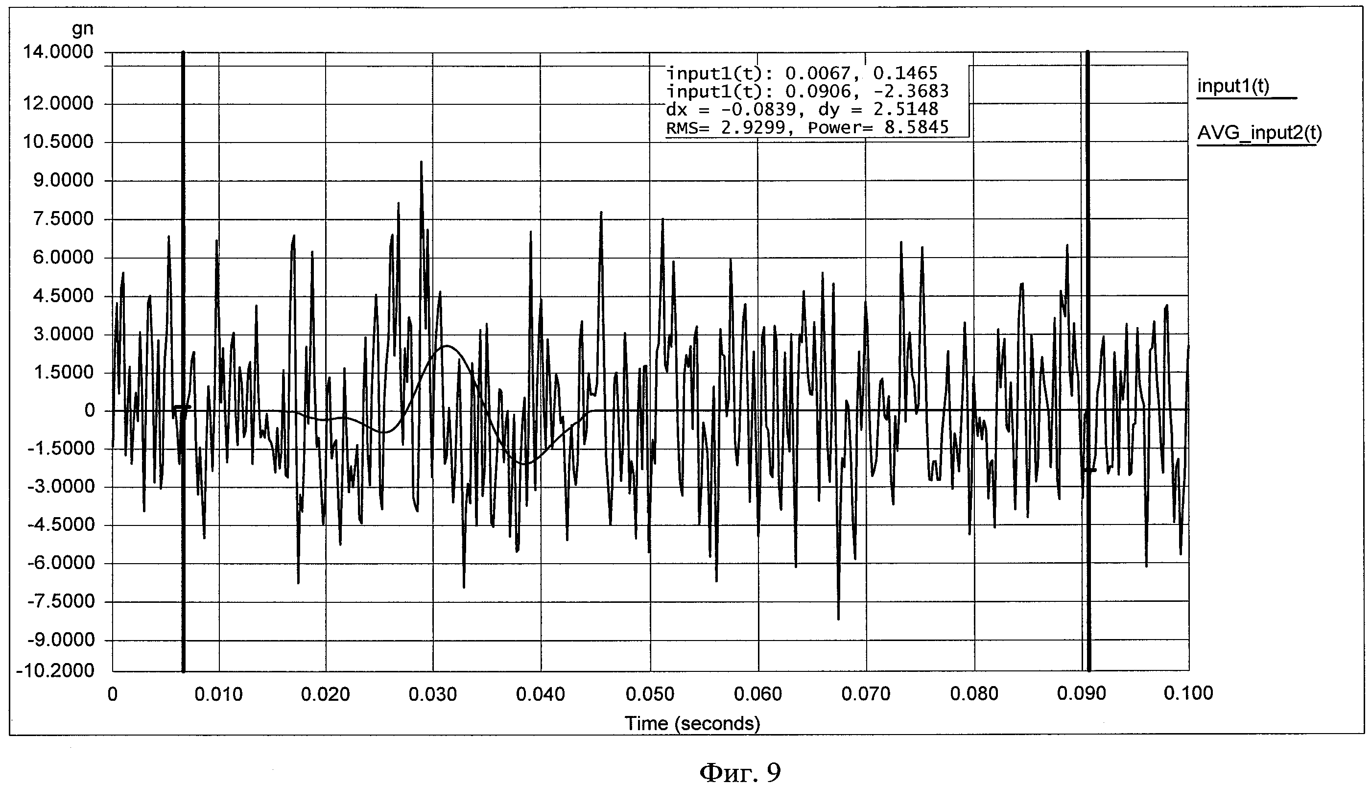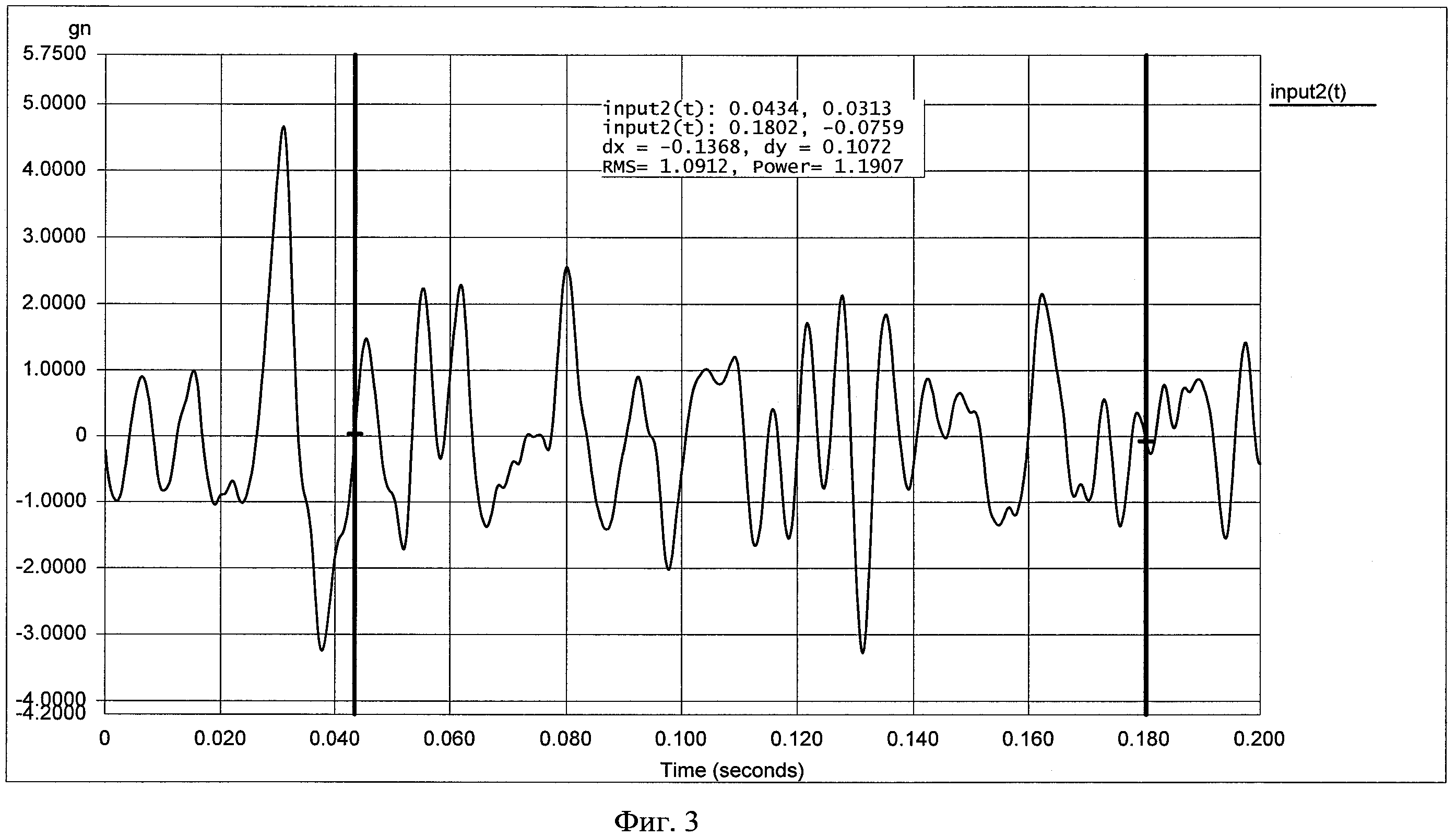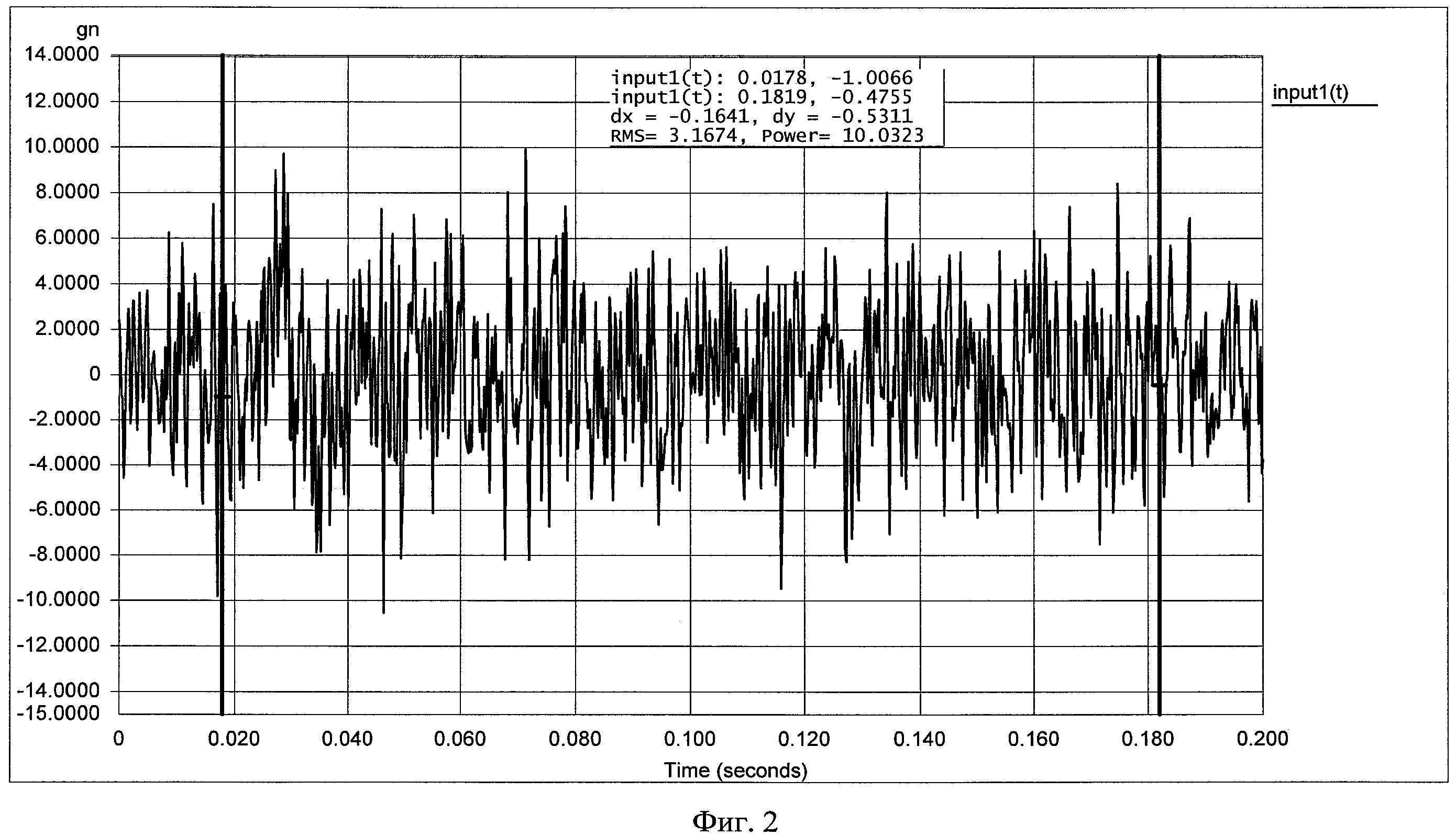 Предлагаемое изобретение относится к испытательной технике и может быть использовано для определения параметров нестационарных процессов (в том числе вибрационных) при лабораторных исследованиях надежности изделий современной техники. Аналогом предлагаемого изобретения является способ определения стохастического среднего значения нестационарного процесса x(t). Этот способ теоретически рассмотрен в работе «Случайные колебания» (под редакцией С.Кренделла, М.: Мир, 1967, стр.81) и в работе «Измерения и анализ случайных процессов» (авторы Д.Бендат и А.Пирсол, М.: Мир, 1974, стр.398-400). Среднее значение mx(t) на выходе линейной системы получается усреднением процесса x(t) по ансамблю реализаций: mx(t)=E[x(t)], где Е - знак усреднения. Практические рекомендации для осуществления этого способа содержит литература по электро- и радиоизмерительной технике (см., например Г.Я.Мирский. Электронные измерения. М.: Радио и связь, 1986, стр.275-276; А.А.Харкевич. Борьба с помехами. М.: Наука, 1965, стр.276). Аналогом-прототипом предлагаемого изобретения является способ обработки нестационарных сигналов, применяемый в современной компьютерной системе Photon (см. «Руководство пользователя редакция 6.0 Анализ динамических сигналов. Web-сайт: www.lds-group.com»). Система производит прием исследуемых сигналов (в том числе нестационарных) и их последующую обработку программными средствами с усреднением по ансамблю. При этом система обеспечивает синхронизацию принимаемых реализаций, выполняемую триггерным программным модулем (см. стр.85-88 Руководства пользователя). Работа триггерного модуля вполне удовлетворительна, если синхросигнал имеет упорядоченный характер (например, в виде импульса прямоугольной формы). Использовать в качестве синхросигнала исследуемый нестационарный случайный процесс в исходном облике невозможно, так как триггерный модуль при этом работает произвольно и четкая синхронизация невозможна. Между тем осуществление способа в таком режиме желательно, так как при этом обеспечиваются прием и эффективная обработка нестационарных сигналов и определение параметров сигналов во временной и частотной области. Задачей предлагаемого изобретения является разработка способа приема и передачи на вход компьютерной системы нестационарных случайных сигналов (например, ударных импульсов совместно с широкополосной случайной вибрацией) и последующее измерение параметров этих сигналов. Сущность предлагаемого изобретения состоит в том, что способ обработки сигналов посредством осреднения по ансамблю реализаций, поступающих на вход компьютерной системы, дополнен операцией формирования синхросигнала, управляющего триггерным программным модулем. Кроме того, прием исследуемого сигнала и его последующая обработка производятся только в тех случаях, когда амплитуда сигнала равна или превышает предварительно установленное пороговое значение. При этом синхросигнал формируется путем преобразования реализации исследуемого сигнала. Преобразование осуществляется низкочастотной фильтрацией и стробированием. Использование предлагаемого изобретения способно обеспечить прием и передачу на вход компьютерной системы нестационарных сигналов, амплитуда которых равна или незначительно превосходит среднеквадратический уровень сопровождающего стационарного процесса 