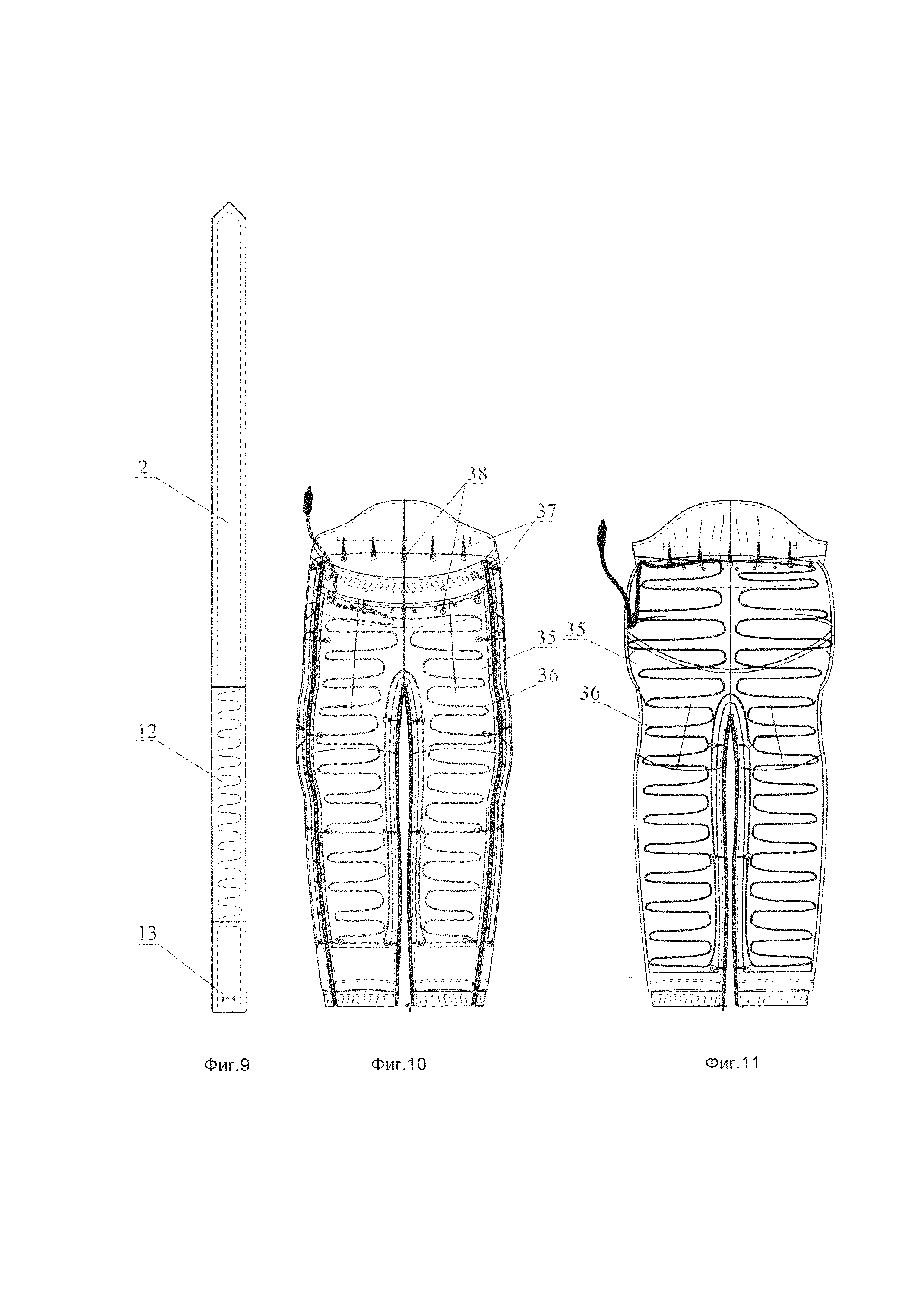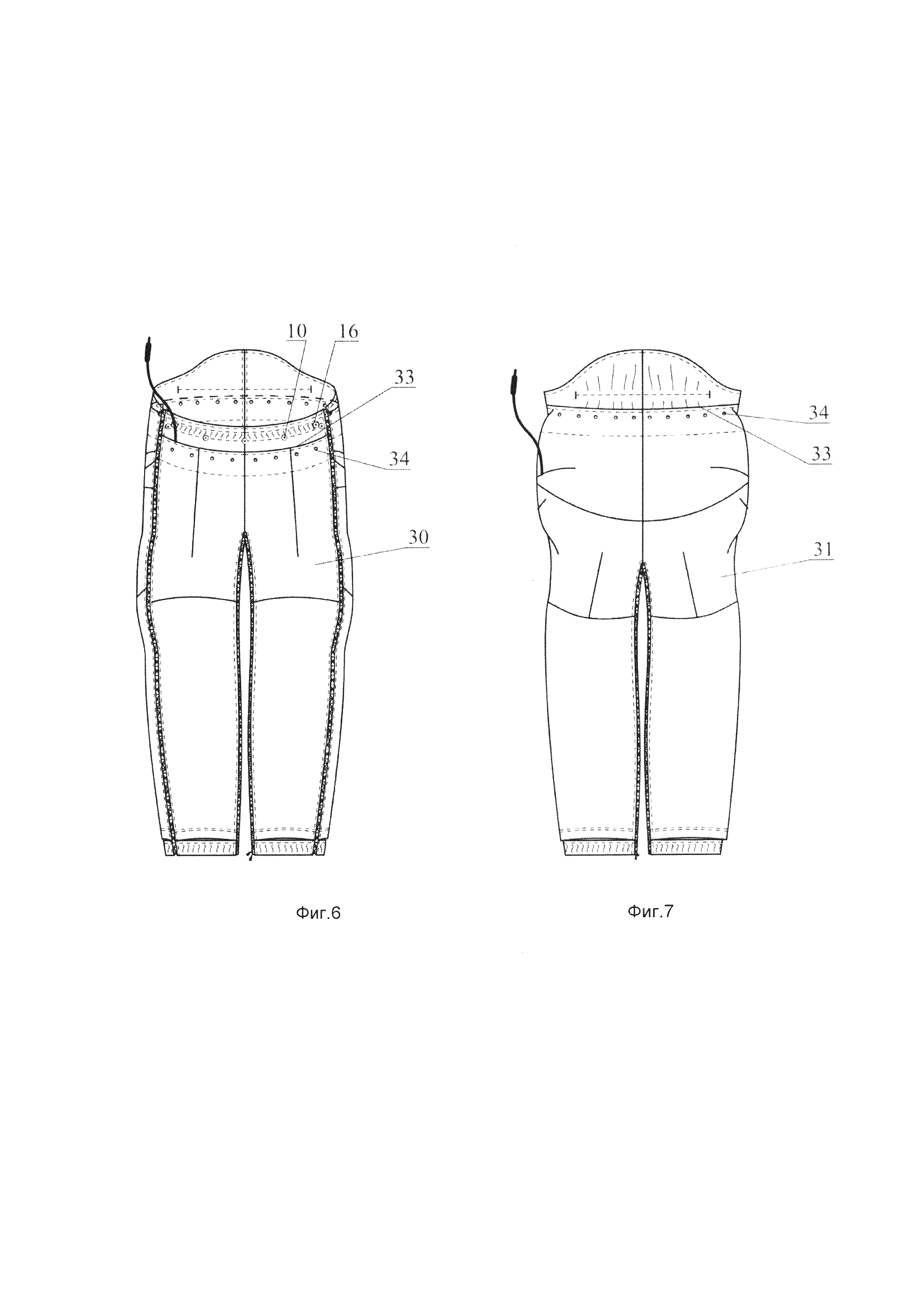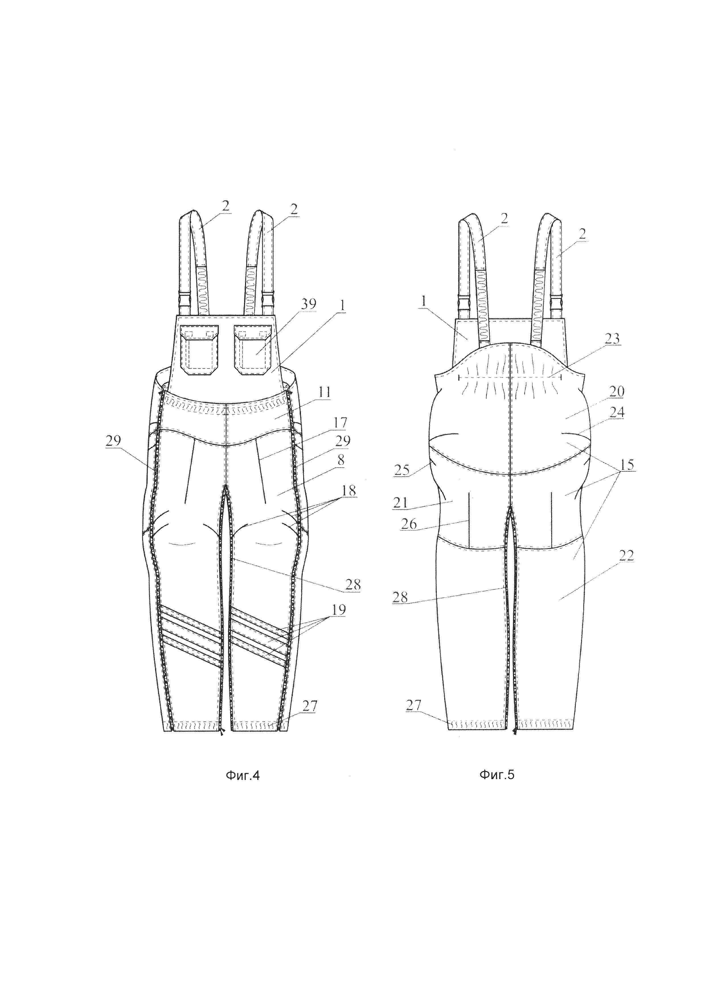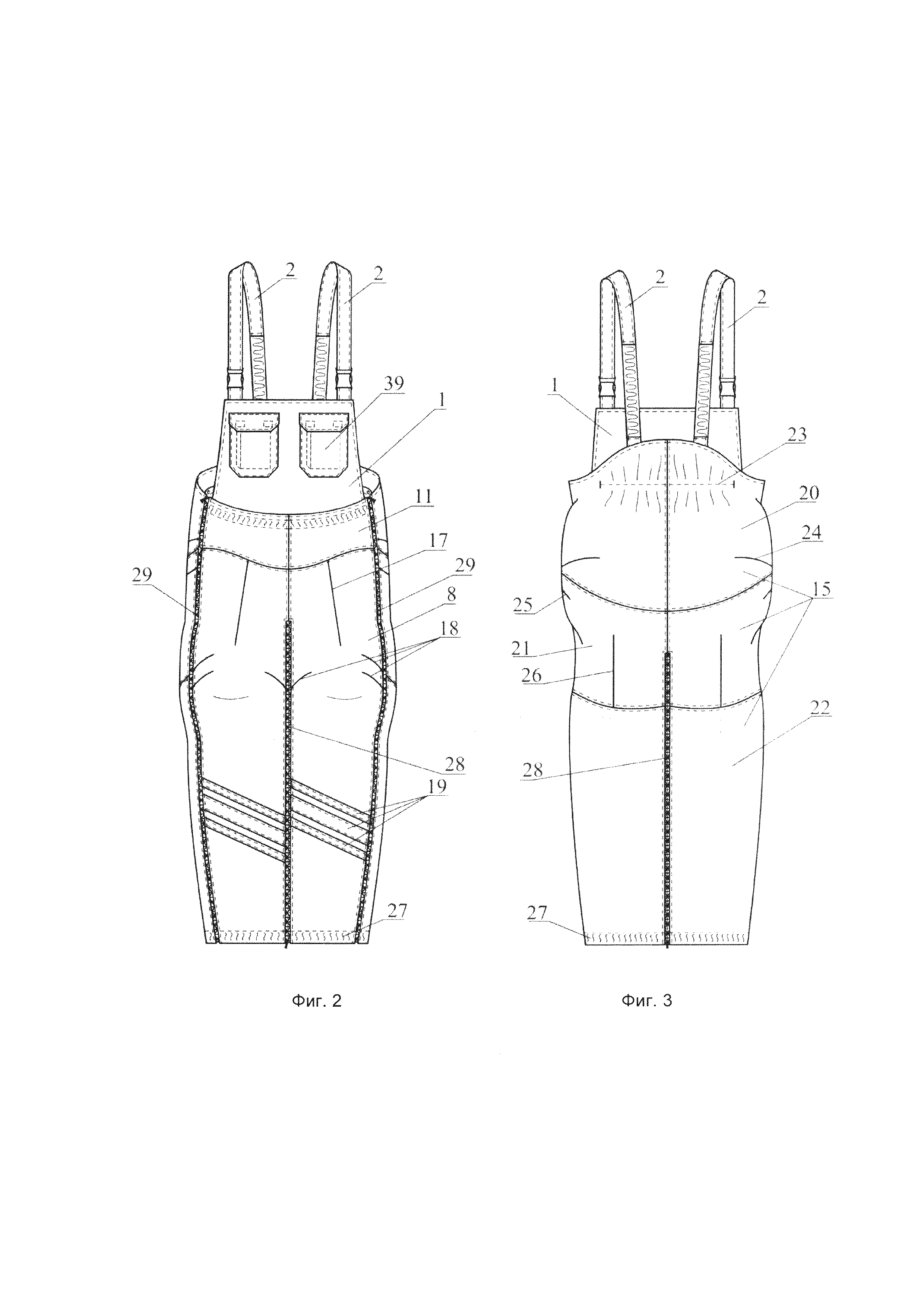 1. Полукомбинезон для людей с ограниченными двигательными возможностями, характеризующийся тем, что имеет крой, повторяющий форму тела сидящего человека, причем его нижняя часть (низ) представляет собой брюки, состоящие из передних 8 и задних 15 половинок, соединенных по боковым, шаговым и среднему срезам, при этом брюки выполнены разъемными по боковым швам, отличающиеся тем, что в шаговых швах низа изделия установлена одна разъемная двухзамковая молния для трансформации брюк в закрывающее обе ноги полотнище и обратно. 2. Полукомбинезон по п. 1, отличающийся тем, что передняя часть брюк, представляющая собой соединенные по среднему срезу передние половинки 8 штанин, имеет составную кокетку (передняя кокетка) 11, из-под которой по середине ширины передней половинки 8 каждой штанины по направлению к линии колена заложена вытачка 17, а в области колена на каждой передней половинке 8 штанины заложены складки 18: по одной складке из шагового шва и по две складки - из боковых швов; задняя часть брюк, представляющая собой соединенные по среднему срезу задние половинки 15 штанин, имеет составную кокетку (задняя кокетка) 20, каждая половинка которой по нижнему дугообразно выгнутому книзу срезу соединена со средним участком 21 задней половинки 15 соответствующей штанины, расположенным выше отрезного под коленом нижнего участка 22, при этом: на задней кокетке 20 области ягодиц, перпендикулярно соответствующему боковому шву выполнены две вытачки 24; на среднем участке 21 задней половинки 15 каждой штанины на расстоянии 4-10 см от нижнего среза кокетки по боковому шву заложена складка 25; а по середине ширины указанного участка 21, от шва его притачивания к нижнему участку 22, по направлению к подъягодичной складке - вытачка 26. 3. Полукомбинезон по п. 2, отличающийся тем, что по верхнему срезу кокетки 11 продернута эластичная лента 16. 4. Полукомбинезон по любому из пп. 2, 3, отличающийся тем, что на задней кокетке 20 по линии талии с изнанки настрочена эластичная лента 23. 5. Полукомбинезон по любому из пп. 1-4, отличающийся тем, что имеет верхнюю часть в виде лифа 1 со съемными бретелями 2. 6. Полукомбинезон по п. 5, отличающийся тем, что лиф 1 содержит обметанные по его низу прорезные петли 9, с помощью которых и такого же числа пуговиц 10, пришитых с изнанки на передней кокетке 11 в соответствии с расположением указанных петель 9, он прикреплен к верхнему срезу передней части низа полукомбинезона. 7. Полукомбинезон по любому из пп. 5, 6, отличающийся тем, что по верхнему краю лифа 1, ближе к его боковым краям втачаны держатели/петли 6, каждый для пряжки-замка 7, предназначенной для фиксации одного из концов бретели 2. 8. Полукомбинезон по любому из пп. 5-7, отличающийся тем, что в нижней части каждой бретели 2 продернута эластичная лента 12. 9. Полукомбинезон по любому из пп. 5-8, отличающийся тем, что на одном из концов каждой бретели 2 лифа 1 размещена, по меньшей мере, одна прорезная петля 13, с помощью которой и пуговицы 14, пришитой на задней кокетке 20 в соответствии с расположением указанной петли 13, данный конец бретели 2 пристегнут к низу полукомбинезона, при этом другой конец бретели зафиксирован в пряжке замке 7. 10. Полукомбинезон по любому из пп. 5-9, отличающийся тем, что лиф 1 выполнен с двумя накладными карманами 3 с клапанами 4. 11. Полукомбинезон по любому из пп. 5-10, отличающийся тем, что лиф 