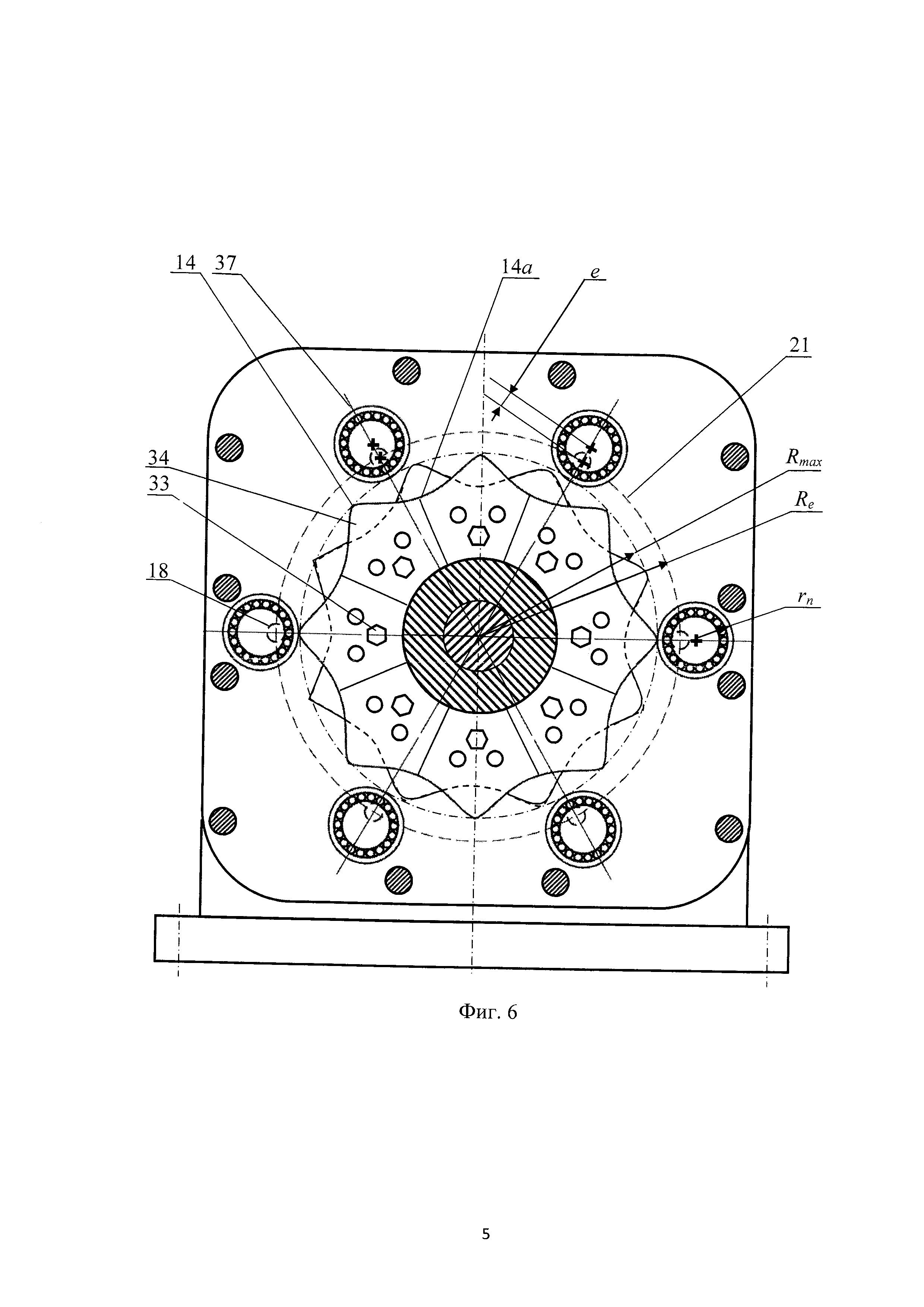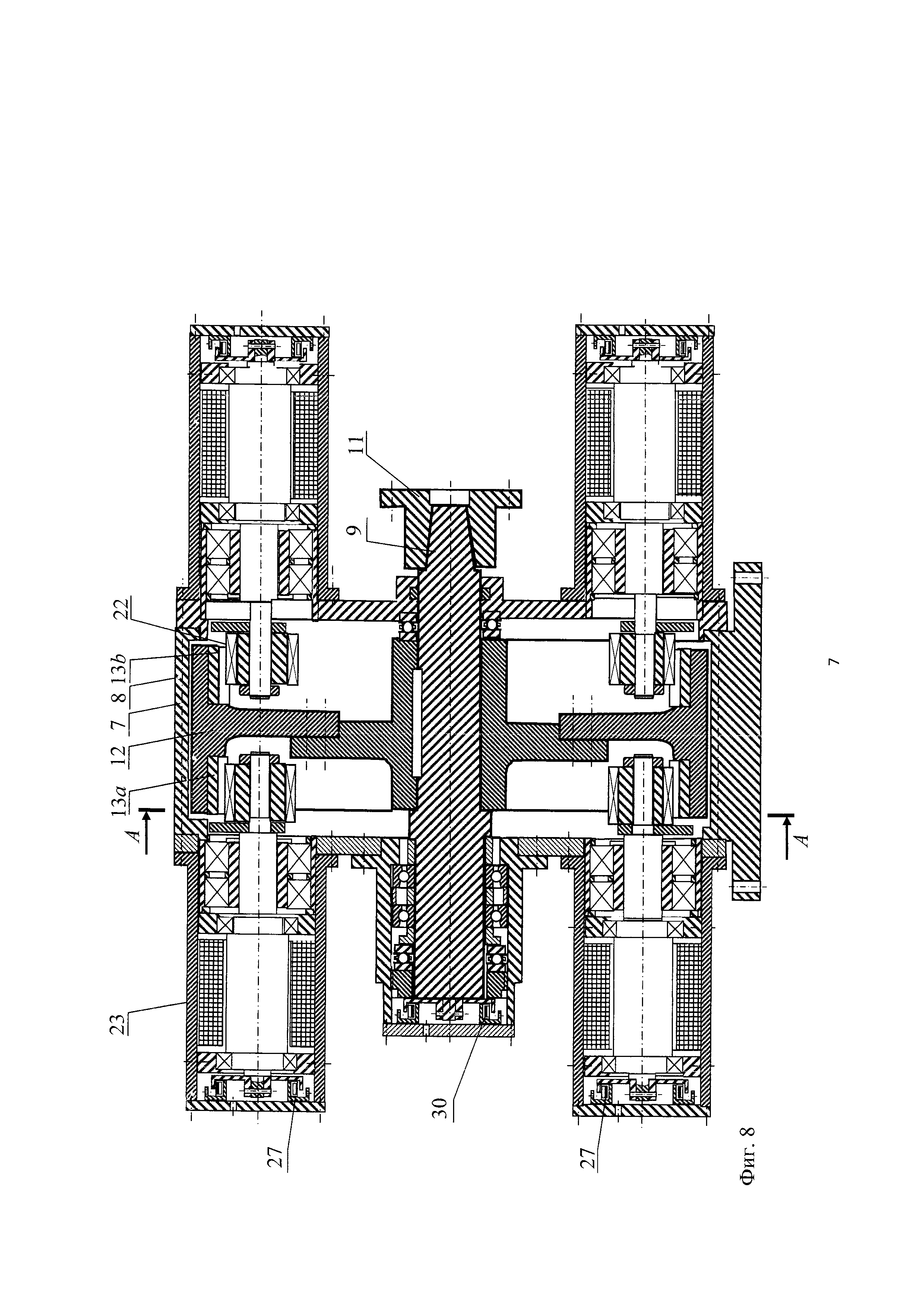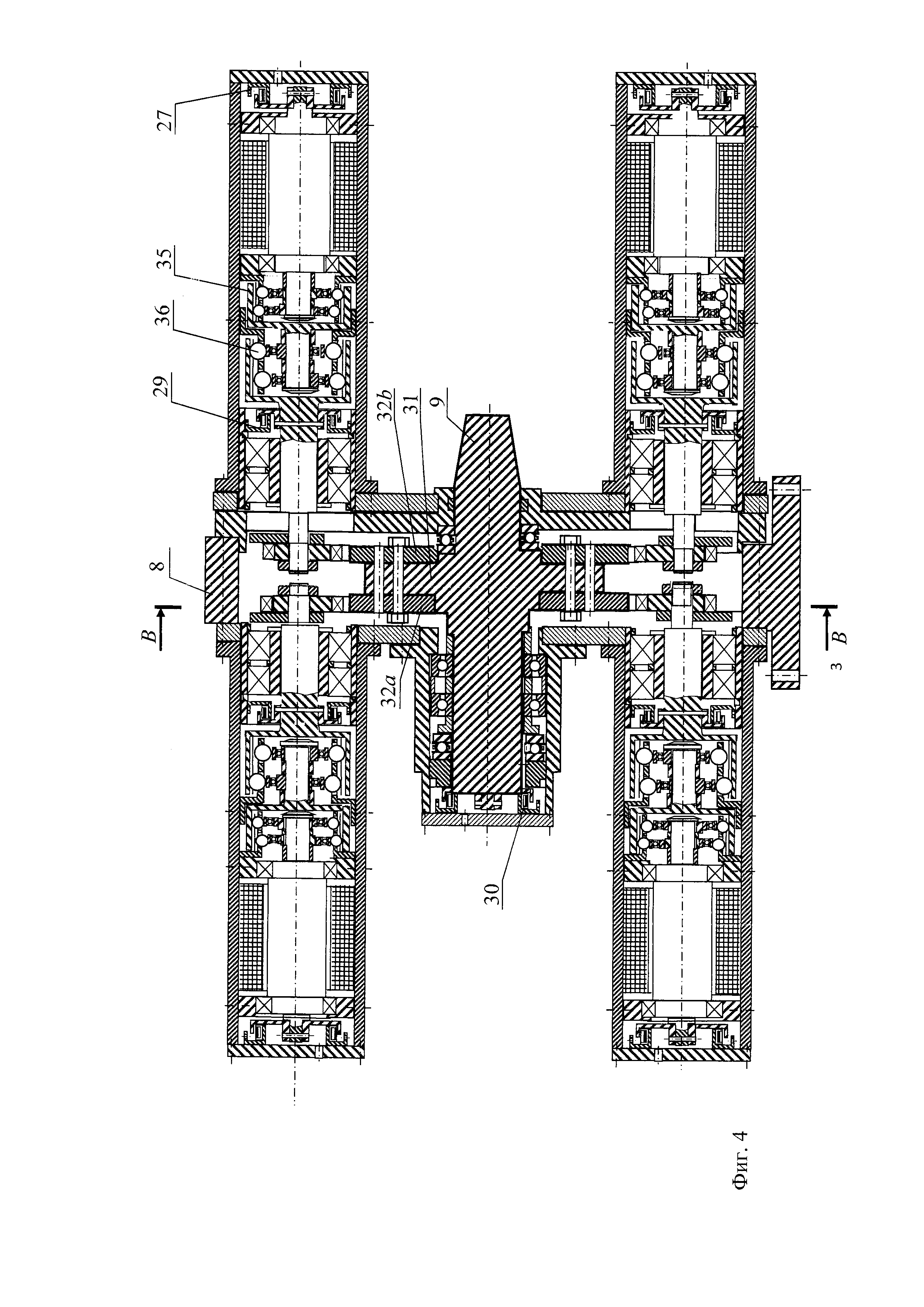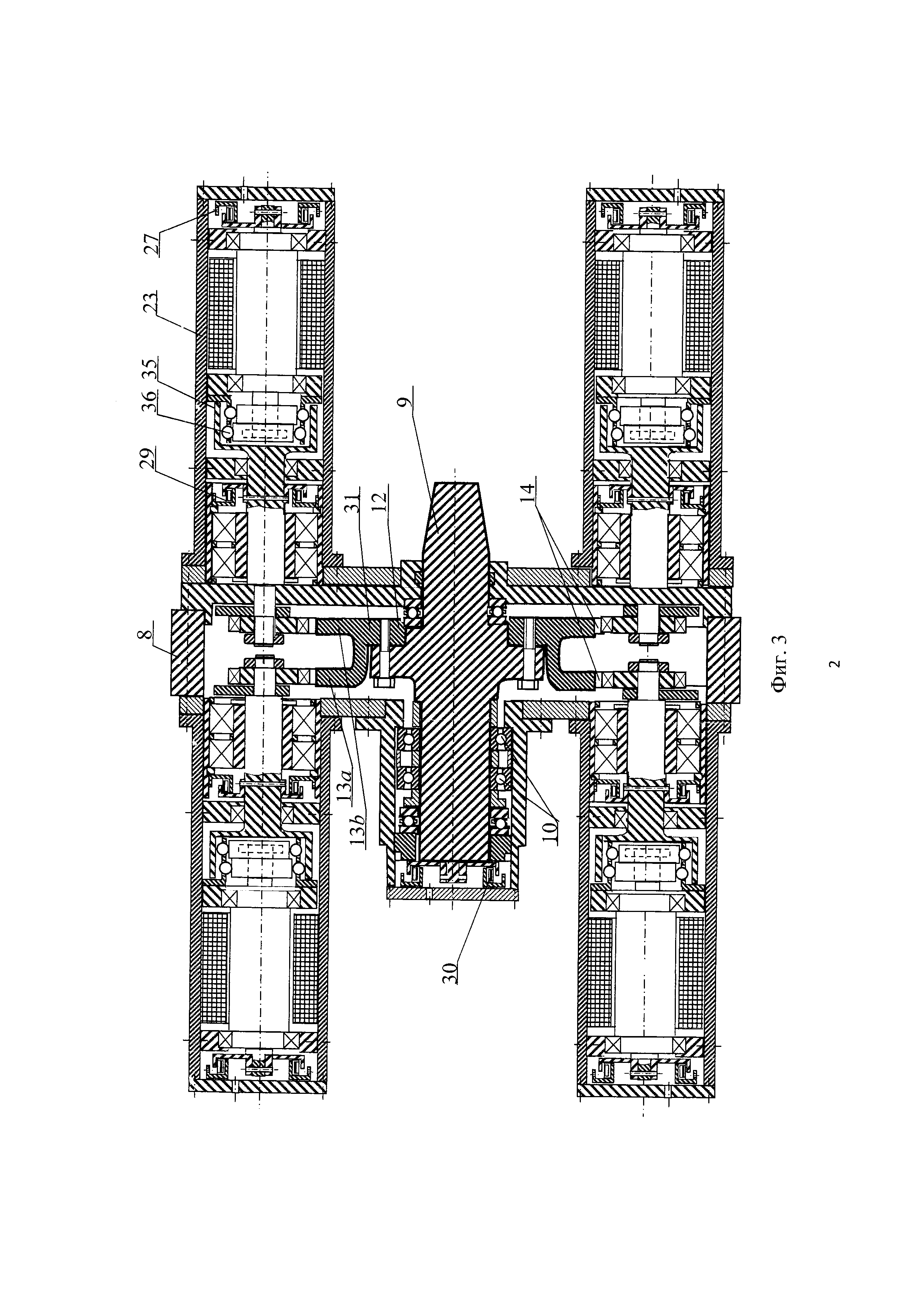 1. Электромеханический привод гребного винта судна, содержащий: судовой валопровод с валом с гребным винтом, дейдвудным, опорным и упорным подшипниками; зубчатый редуктор, имеющий корпус с одним выходным и несколькими входными валами; муфту, соединяющую выходной вал редуктора с валом судового валопровода; установленное на выходном валу в корпусе редуктора по меньшей мере одно цилиндрическое зубчатое колесо с двумя зубчатыми венцами; зубчатую шестерню, установленную на каждом из входных валов по окружности вокруг каждого из зубчатых венцов; следящие электроприводы, установленные на корпусе редуктора, выходные валы которых имеют шестерни и являются входными валами зубчатого редуктора; блоки управления следящими электроприводами, каждый из которых установлен на электродвигателе электропривода; источник электропитания, соединенный с электроприводами через блоки управления ими; главный блок управления следящими электроприводами (включающий задатчик частоты вращения роторов электродвигателей); датчики углового положения выходного вала каждого следящего электропривода, соединенные интерфейсными шинами с соответствующими блоками управления; датчик углового положения выходного вала редуктора, соединенный интерфейсной шиной с главным блоком управления, отличающийся тем, что зубья каждого из двух зубчатых венцов колеса образованы циклоидальной поверхностью; шестерня на каждом входном валу редуктора является однозубой, выполнена в виде цилиндрического эксцентрика с установленным на нем подшипником и, взаимодействуя с зубчатым венцом, образует эксцентриково-циклоидальную передачу; входные валы зубчатого редуктора, каждый - с цилиндрическим эксцентриком с подшипником, установлены вокруг каждого зубчатого венца колеса; количество следящих электроприводов с входными валами с цилиндрическими эксцентриками с подшипниками выбирается из интервала целых чисел по зависимости: где n - количество следящих электроприводов каждого из двух зубчатых венцов колеса; Re - радиус окружности, на которой размещены оси входных валов, описанной относительно оси выходного вала; Re=Rmax-e±rп, Rmax - радиус окружности, описанной относительно вершин зубьев или впадин колеса внешней или внутренней эксцентриково-циклоидальной передачи; е - эксцентриситет цилиндрического эксцентрика; rп - внешний радиус подшипника, установленного на цилиндрическом эксцентрике; +rп - для внешней эксцентриково-циклоидальной передачи; -rп - для внутренней эксцентриково-циклоидальной передачи; ДЭД - максимальный диаметр (размер) корпуса следящего электропривода. 2. Электромеханический привод по п.1, отличающийся тем, что эксцентриково-циклоидальная передача является внешней. 3. Электромеханический привод по п.2, отличающийся тем, что зубчатое колесо является сборным, состоящим из ступицы с диском и двойного зубчатого венца, жестко закрепленного на диске. 4. Электромеханический привод по п.2, отличающийся тем, что зубчатое колесо является сборным, состоящим из ступицы с двумя дисками и колец с зубчатыми венцами, жестко закрепленных на каждом диске. 5. Электромеханический привод по п.4, отличающийся тем, что одно кольцо с зубчатым венцом имеет угловое расположение относительно другого, такое, что зубья одного кольца находятся напротив впадин другого. 6. Электромеха