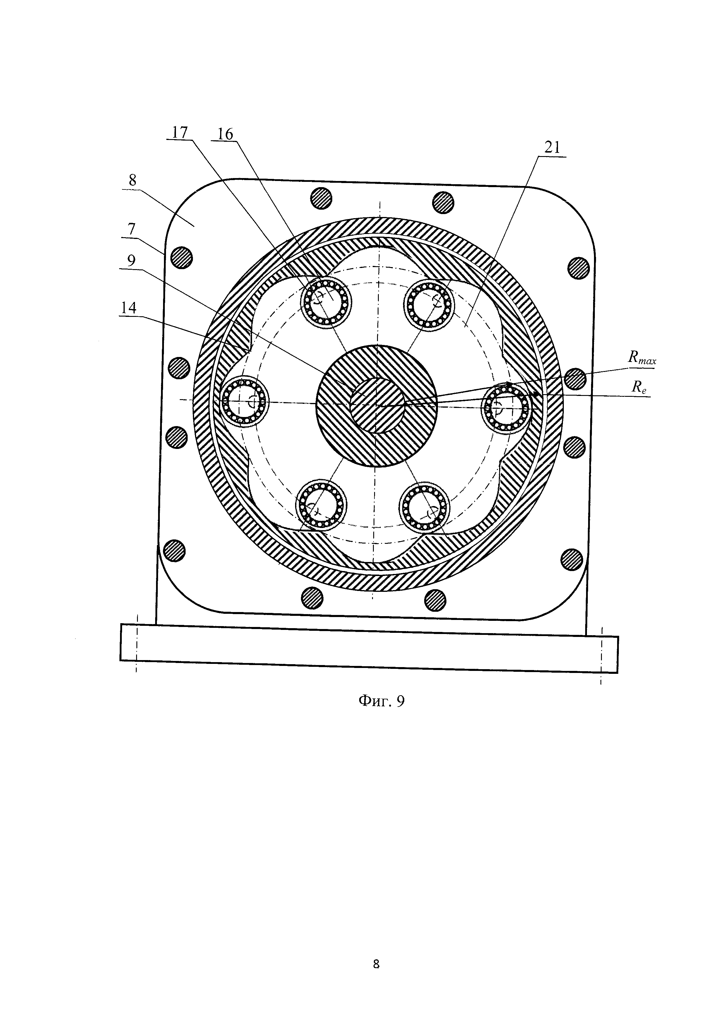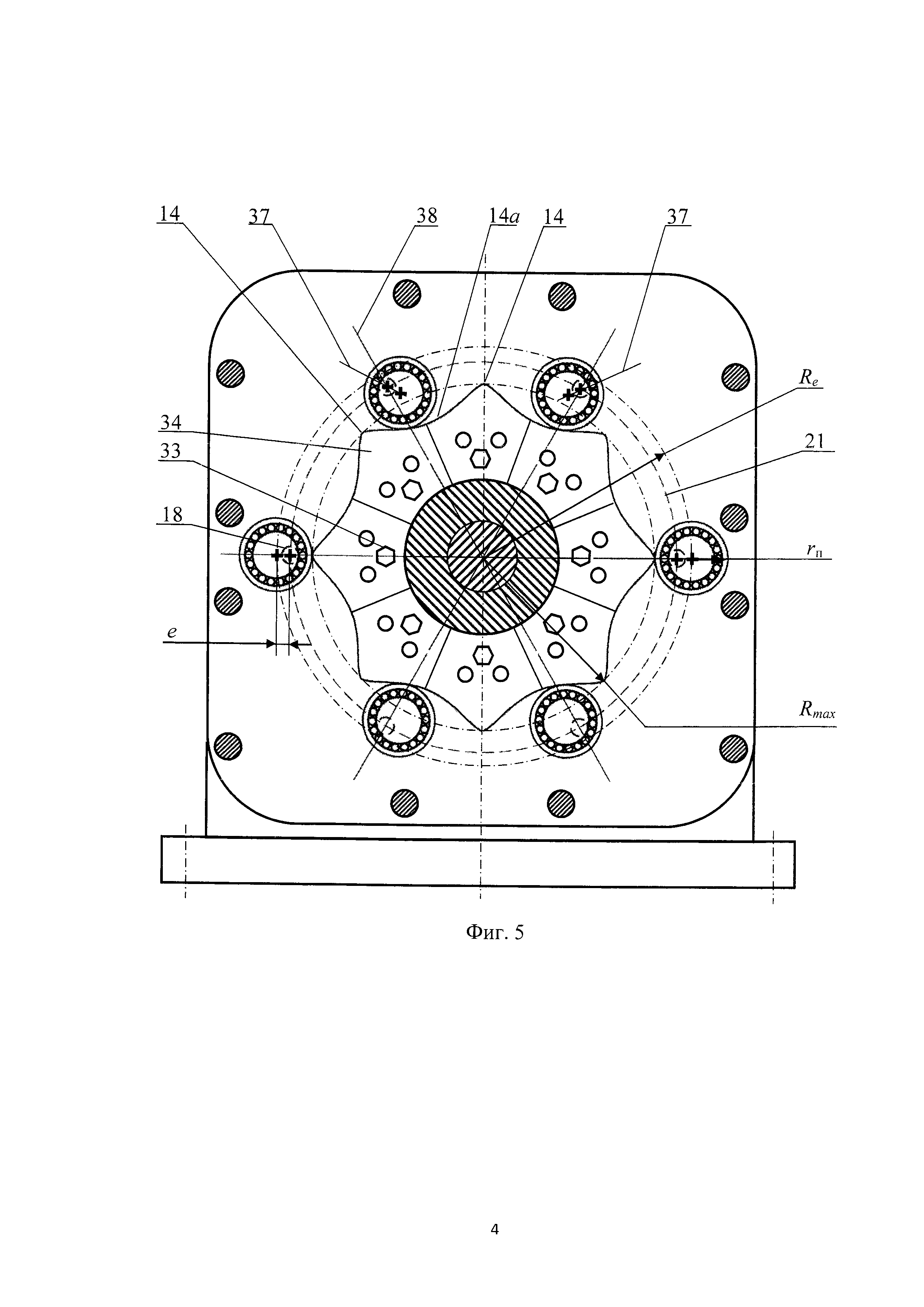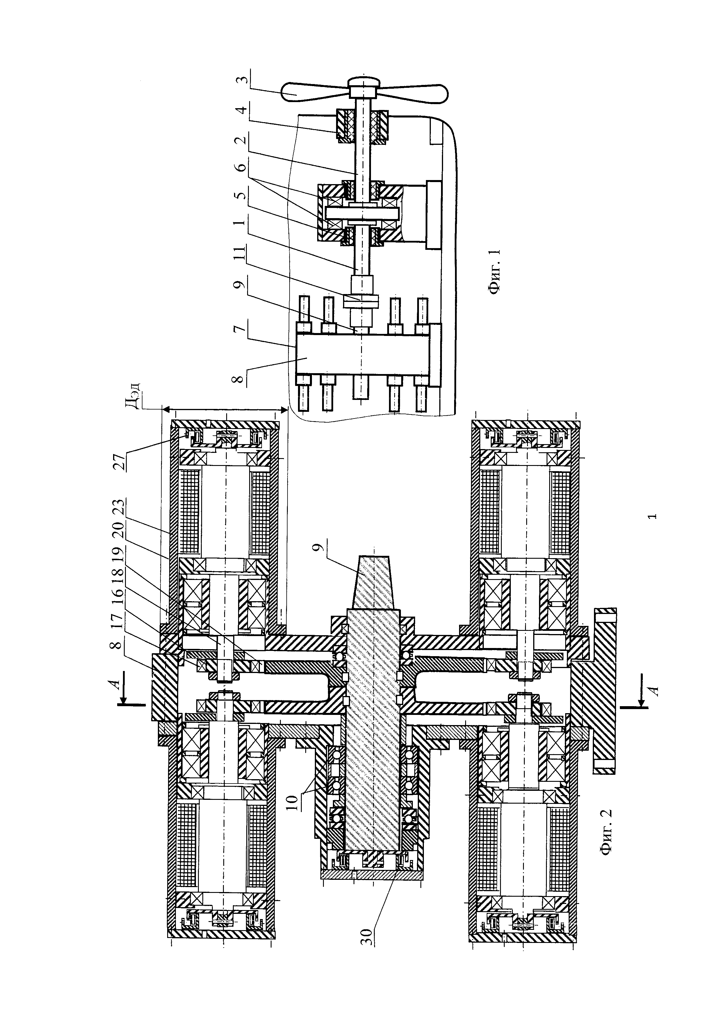 1. Электромеханический привод гребного винта судна, содержащий: судовой валопровод с валом с гребным винтом, дейдвудным, опорным и упорным подшипниками; зубчатый редуктор, имеющий корпус с одним выходным и несколькими входными валами; муфту, соединяющую выходной вал редуктора с валом судового валопровода; установленное на выходном валу в корпусе редуктора по меньшей мере одно цилиндрическое зубчатое колесо с двумя зубчатыми венцами; зубчатую шестерню, установленную на каждом из входных валов по окружности вокруг каждого из зубчатых венцов; следящие электроприводы, установленные на корпусе редуктора, выходные валы которых имеют шестерни и являются входными валами зубчатого редуктора; блоки управления следящими электроприводами, каждый из которых установлен на электродвигателе электропривода; источник электропитания, соединенный с электроприводами через блоки управления ими; главный блок управления следящими электроприводами (включающий задатчик частоты вращения роторов электродвигателей); датчики углового положения выходного вала каждого следящего электропривода, соединенные интерфейсными шинами с соответствующими блоками управления; датчик углового положения выходного вала редуктора, соединенный интерфейсной шиной с главным блоком управления, отличающийся тем, что зубья каждого из двух зубчатых венцов колеса образованы циклоидальной поверхностью; шестерня на каждом входном валу редуктора является однозубой, выполнена в виде цилиндрического эксцентрика с установленным на нем подшипником и, взаимодействуя с зубчатым венцом, образует эксцентриково-циклоидальную передачу; входные валы зубчатого редуктора, каждый - с цилиндрическим эксцентриком с подшипником, установлены вокруг каждого зубчатого венца колеса; количество следящих электроприводов с входными валами с цилиндрическими эксцентриками с подшипниками выбирается из интервала целых чисел по зависимости: где n - количество следящих электроприводов каждого из двух зубчатых венцов колеса; Re - радиус окружности, на которой размещены оси входных валов, описанной относительно оси выходного вала; Re=Rmax-e±rп, Rmax - радиус окружности, описанной относительно вершин зубьев или впадин колеса внешней или внутренней эксцентриково-циклоидальной передачи; е - эксцентриситет цилиндрического эксцентрика; rп - внешний радиус подшипника, установленного на цилиндрическом эксцентрике; +rп - для внешней эксцентриково-циклоидальной передачи; -rп - для внутренней эксцентриково-циклоидальной передачи; ДЭД - максимальный диаметр (размер) корпуса следящего электропривода. 2. Электромеханический привод по п.1, отличающийся тем, что эксцентриково-циклоидальная передача является внешней. 3. Электромеханический привод по п.2, отличающийся тем, что зубчатое колесо является сборным, состоящим из ступицы с диском и двойного зубчатого венца, жестко закрепленного на диске. 4. Электромеханический привод по п.2, отличающийся тем, что зубчатое колесо является сборным, состоящим из ступицы с двумя дисками и колец с зубчатыми венцами, жестко закрепленных на каждом диске. 5. Электромеханический привод по п.4, отличающийся тем, что одно кольцо с зубчатым венцом имеет угловое расположение относительно другого, такое, что зубья одного кольца находятся напротив впадин другого. 6. Электромеха
