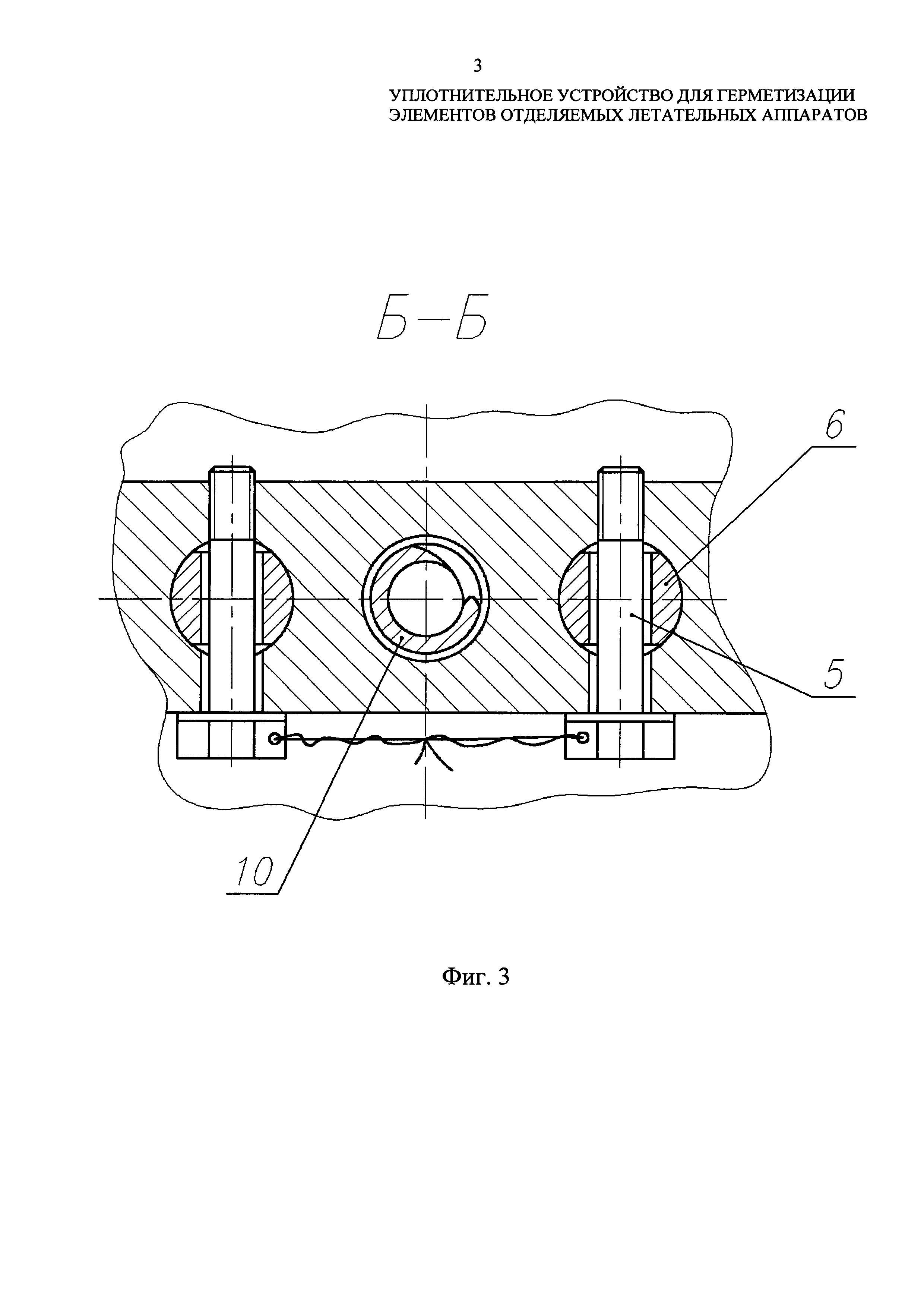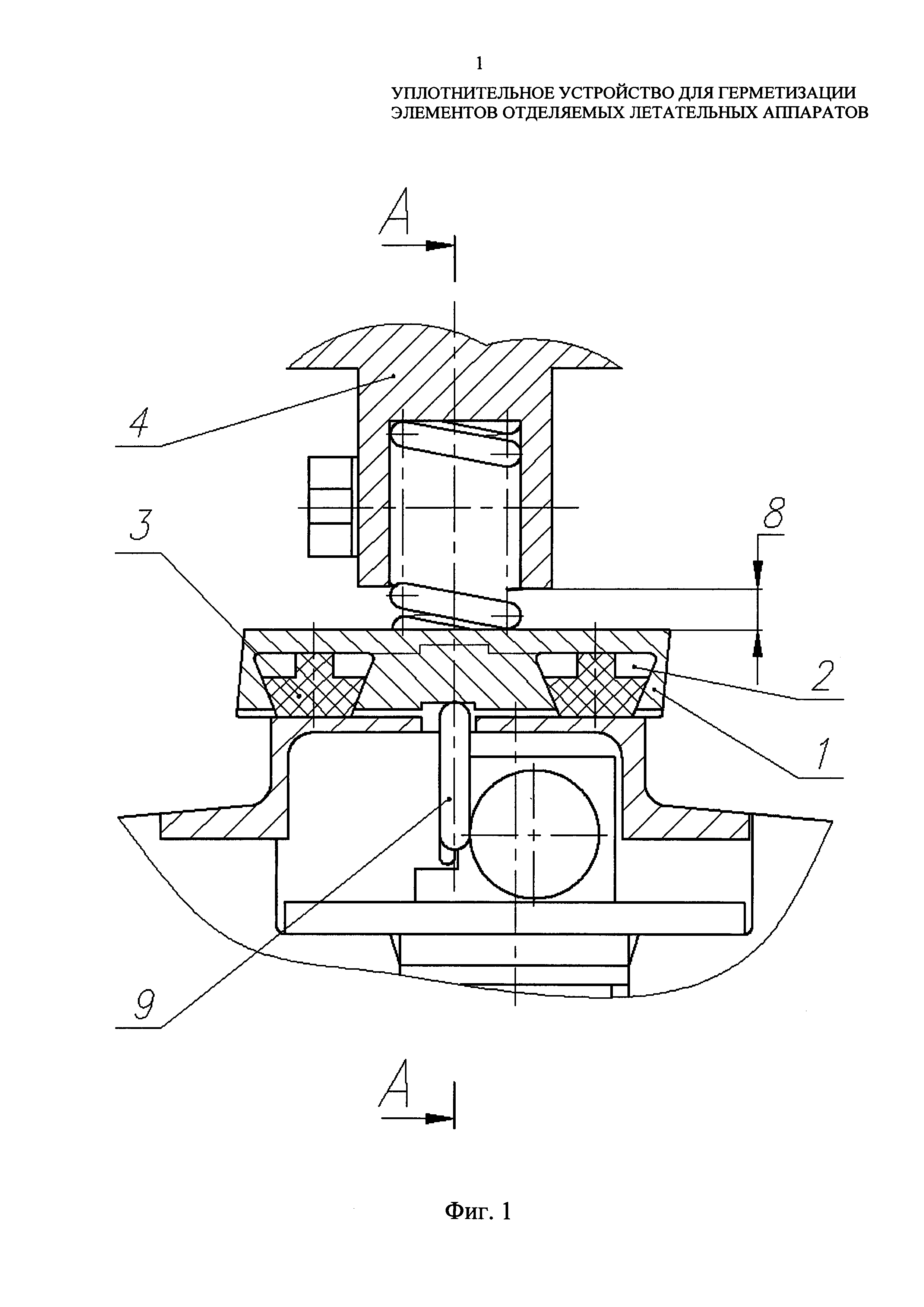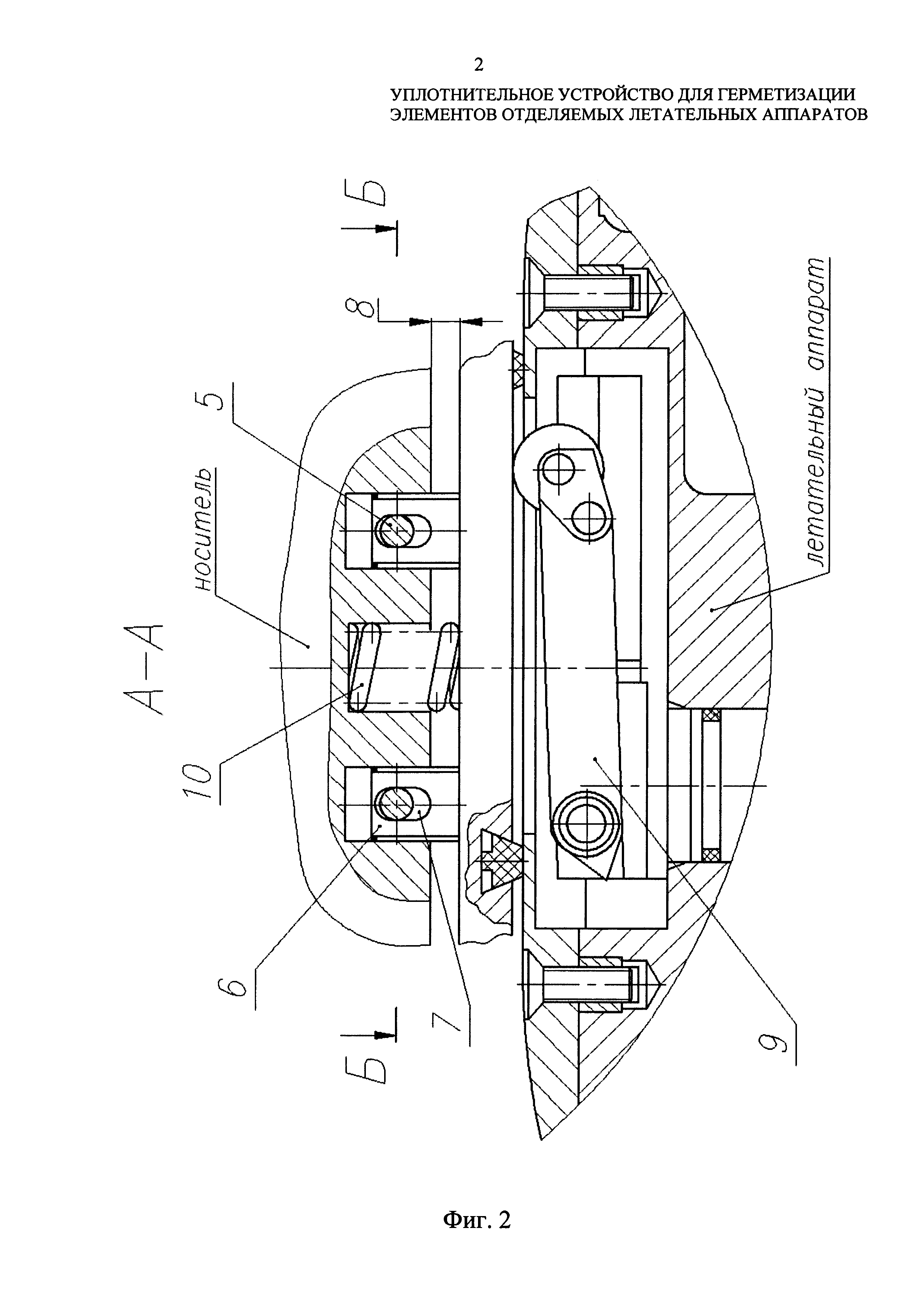 Изобретение относится к машиностроению и может быть использовано в авиации и ракетостроении в уплотнительных устройствах для герметизации элементов отделяемых летательных аппаратов (ЛА) от внешней среды на носителе. Многие элементы отделяемых ЛА на носителе для обеспечения надежности требуют защиты от воздействия внешней среды: осадков, температуры, давления. Известны простые стандартные устройства герметизации при разновидности канавок и уплотнительных колец, но в ряде случаев для решения задачи герметизации в особо ответственных объектах требуются специальные уплотнительные устройства: - схема герметизации неподвижных соединений [1. Башта Т.М. Машиностроительная гидравлика: Справ, пособие. - М.: Машиностроение, 1971. - С. 576, рис. 344]. Указанное устройство предназначено для уплотнения неподвижных поверхностей, не допускающее перемещений при эксплуатации с сохранением условий герметичности, что является недостатком; - клапанное уплотнение [2. Уплотнения и уплотнительная техника: Справочник / Под общ. ред. А.И. Голубева, Л.А. Кондакова / - М.: «Машиностроение», 1986. - С. 221, 222, рис. 7.1] не обеспечивает высокой степени герметичности: требуется плотный контакт под действием повышенной сжимающей нагрузки, герметичность определяется допускаемыми утечками при высоком контактном давлении, что не допустимо для герметизации элементов отделяемых ЛА от воздействия внешней среды; - клапанное уплотнение [2. Уплотнения и уплотнительная техника: Справочник / Под общ. ред. А.И. Голубева, Л.А. Кондакова / - М.: Машиностроение, 1986. - С. 222, рис. 7.2 г, с. 232 рис. 7.10 (б-в)] обеспечивает высокую степень герметичности при малом контактном давлении, но неприемлемо для герметизации элементов отделяемых ЛА от воздействия внешней среды, так как взаимное поперечное перемещение контактирующих поверхностей, обязательно присутствующее в конструктивной схеме подвеса ЛА на носителе, приведет к потере герметичности при эксплуатации и снижению надежности ЛА; - канавка под уплотнение [3. Макаров Г.В. Уплотнительные устройства. - Л.: Машиностроение, 1973. - С. 16, 17, рис. 3 а]с наклоном рабочих стенок снижает силы трения при движении, но собственно уплотнение не обеспечивает сохранение условий герметичности при отделении ЛА до момента срабатывания элемента герметизации ЛА, например, концевого выключателя задействования бортовых электрических систем. Ближайшим техническим устройством, выбранным в качестве прототипа, является клапанное уплотнение [2. Уплотнения и уплотнительная техника: Справочник / Под общ. ред. А.И. Голубева, Л.А. Кондакова / - М.: Машиностроение, 1986. - С. 232, рис. 7.10 г]. Прототип обладает недостатком уплотнительного устройства [3]: не обеспечивает сохранение условий герметичности при отделении ЛА до момента срабатывания элемента герметизации ЛА. Анализ устройств, принятых в качестве аналогов и прототипа, показал, что герметичность стыка зависит от выбранной конструктивной схемы уплотнительного устройства, возможности взаимного перемещения контактирующих поверхностей в поперечном и перпендикулярном ему направлении. Целью изобретения является создание уплотнительного устройства для герметизации элементов отделяемых ЛА, обеспечивающего условия герметичности по элементу ЛА при эксплуатации на носителе и отделении его до момента срабатывания элемента ЛА. В пр
