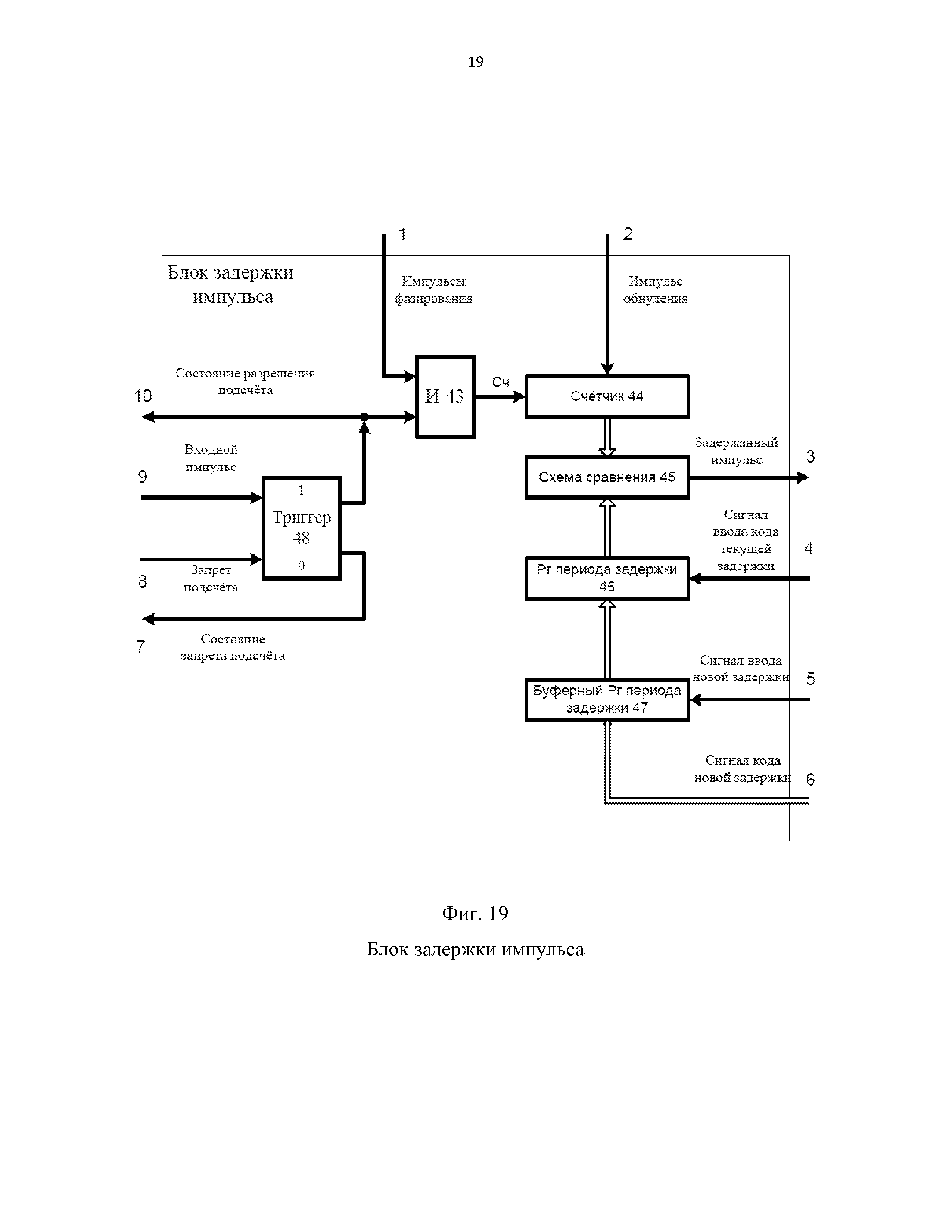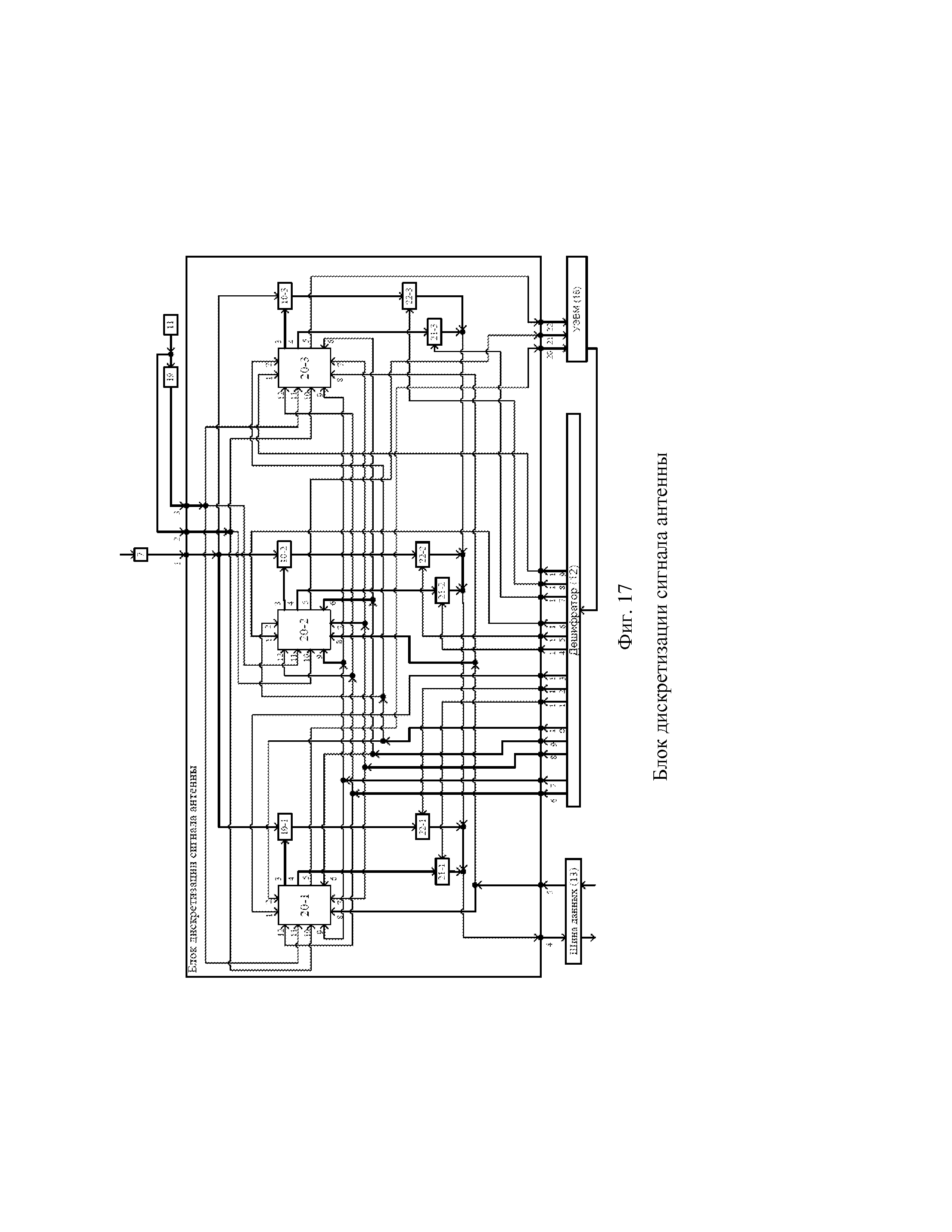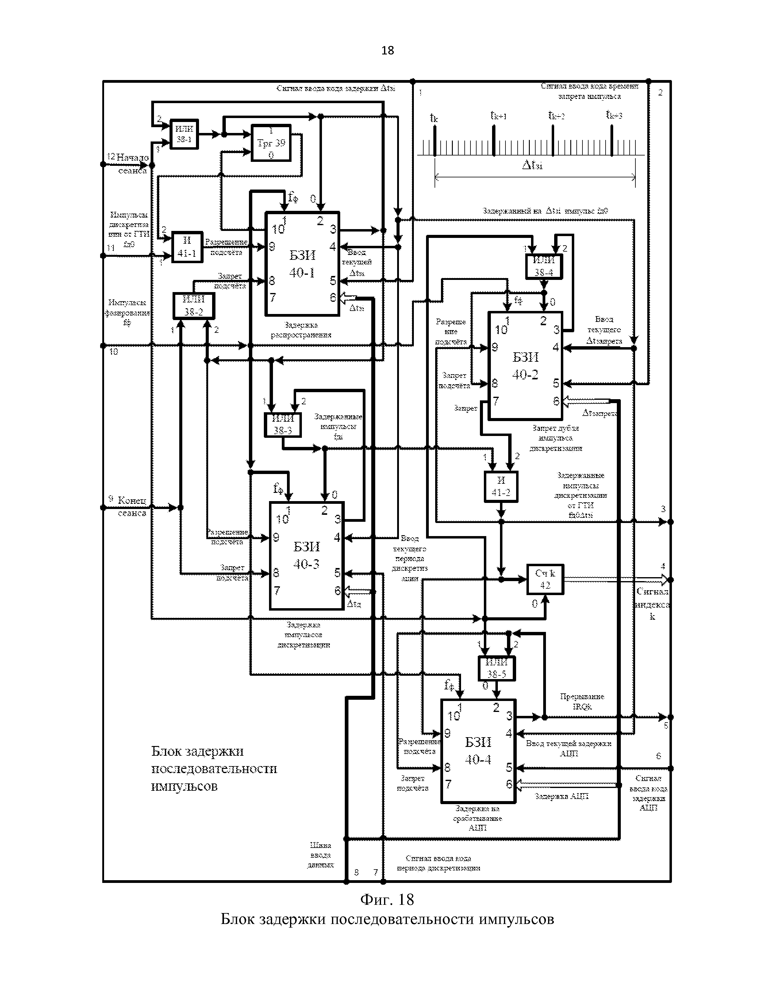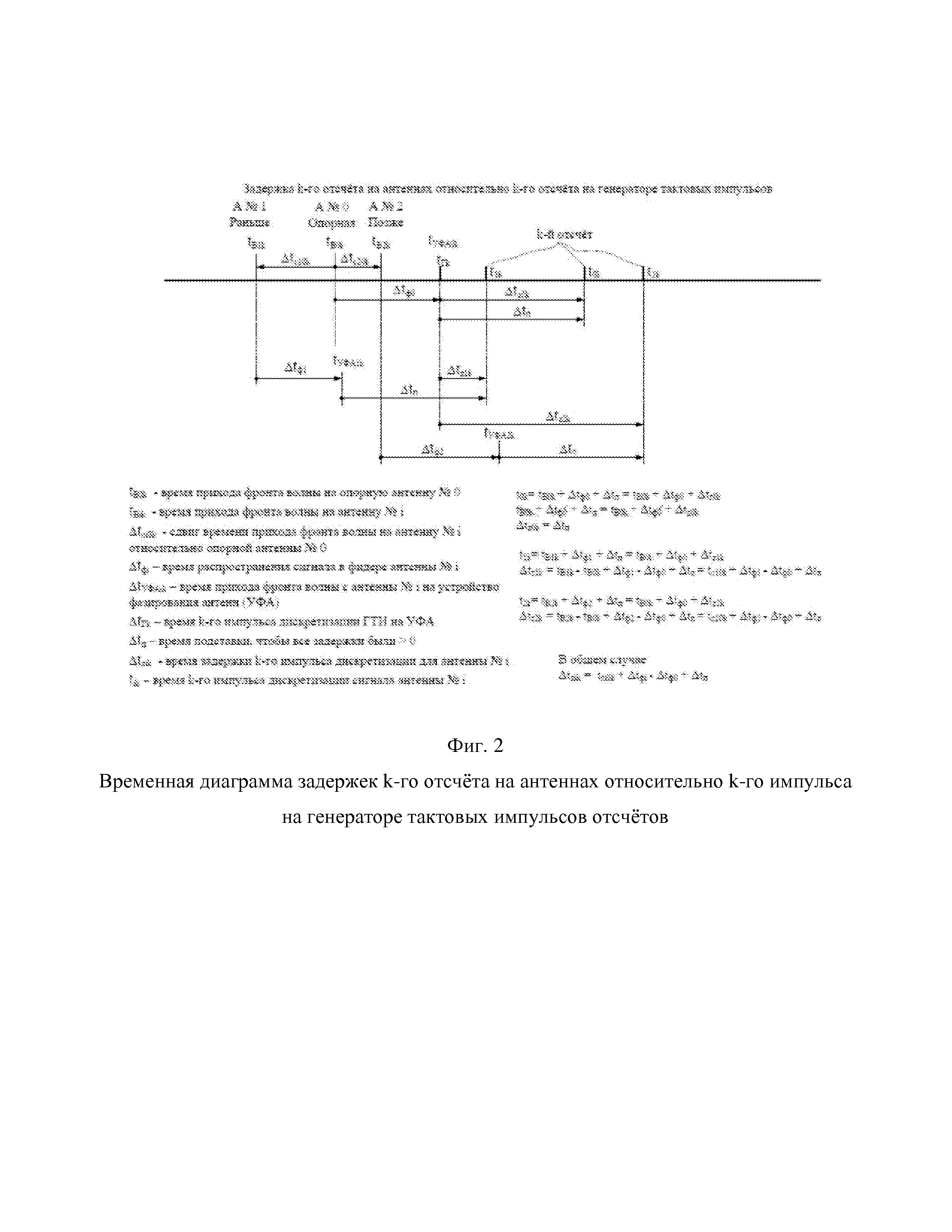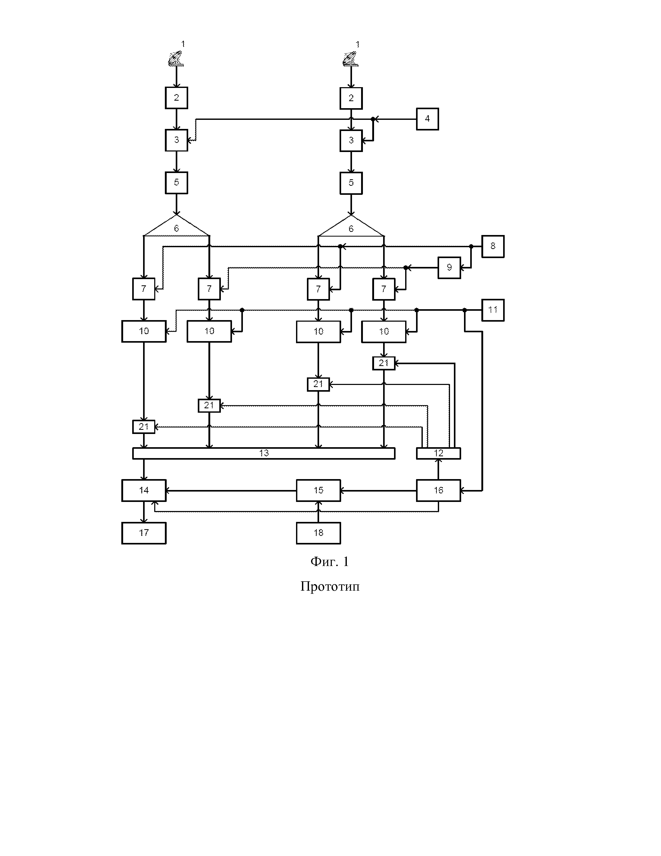 Изобретение относится к радиотехнике и может использоваться для приёма широкополосных сигналов в системе сбора телеметрической информации от бортовой аппаратуры космических аппаратов. Известен способ формирования диаграммы направленности антенной решётки введением фазового сдвига в числовые последовательности отсчётов сигналов с антенн решётки [см. Проблемы антенной техники/Под ред. Л.Д. Бахраха, Д.И. Воскресенского. – М.: Радио и связь, 1989. – 368 с.: ил. – ISBN5-256-00335-6]. Для сравнительно небольшого количества антенн этот способ реализуется последовательной схемой, представленной на фиг. 1, где: 1 – приёмная антенна; 2 – входной малошумящий усилитель (МШУ) и фидер до смесителя; 3 – смеситель; 4 – первый гетеродин; 5 – усилитель промежуточной частоты с полосовым фильтром (УПЧ-ПФ); 6 – делитель; 7 – синхронные фазовые детекторы (СФД); 8 – второй гетеродин; 9 – постоянный фазовращатель на 90°; 10 – аналого-цифровые преобразователи (АЦП); 11 – генератор тактовых импульсов (ГТИ); 12 – дешифратор адресного сигнала; 13 – шина данных; 14 – процессор формирования диаграммы направленности (ПФДН); 15 – запоминающее устройство (ЗУ); 16 – устройство управления (УУ); 17 – приёмник; 18 – управляющая ЭВМ, 21 – ключ. Выход каждой приёмной антенны 1 соединён с входом соответствующего МШУ 2, выход каждого МШУ 2 соединён с сигнальным входом соответствующего смесителя 3, гетеродинный вход которого соединён с выходом первого гетеродина 4, выход каждого смесителя 3 соединён с входом соответствующего УПЧ-ПФ 5, выход которого соединён с входом соответствующего делителя 6, первый выход каждого делителя 6 соединён с сигнальным входом первого, а второй выход делителя соединён с сигнальным входом второго из соответствующей пары синхронных фазовых детекторов 7, причём гетеродинный вход каждого первого в соответствующей паре СФД 7 соединён с выходом второго гетеродина 8, а гетеродинный вход каждого второго в соответствующей паре СФД 7 соединён с выходом постоянного фазовращателя на 90° 9, вход которого соединён с выходом второго гетеродина 8, выход каждого СФД 7 соединён с сигнальным входом соответствующего АЦП 10, вход импульсов запуска которого соединён с выходом ГТИ 11, выход данных каждого АЦП 10 соединён с входом соответствующего ключа 21, управляющий вход которого соединён с соответствующим выходом дешифратора адресного сигнала 12, вход которого соединён с первой адресной шиной УУ 16, вход синхронизации УУ 16 соединён с выходом ГТИ 11, выход ключа 21 соединён с соответствующим входом шины данных 13, выход которой соединён с первым входом данных ПФДН 14, причём второй вход данных ПФДН 14 соединён с выходом данных ЗУ 15, а вход управления ПФДН 14 соединён с выходом управления УУ 16, адресная шина ЗУ 15 соединена со второй адресной шиной УУ 16, выход данных ПФДН 14 соединён с входом данных приёмника 17, шина данных и адреса ЗУ 15 соединена с шиной данных и адреса управляющей ЭВМ 18. На антенны 1 решётки падает фронт волны радиосигнала со сдвигом для антенны №i на время разности хода лучей Дtioотносительно опорной антенны №0. Принятый антенной сигнал усиливают в соответствующем малошумящем усилителе 2, понижают по частоте с использованием первого гетеродина 4 и смесителя 3, усиливают и ограничивают по полосе частот с использованием усилителя промежуточной частоты и полосового фильтра 5, разветвляют