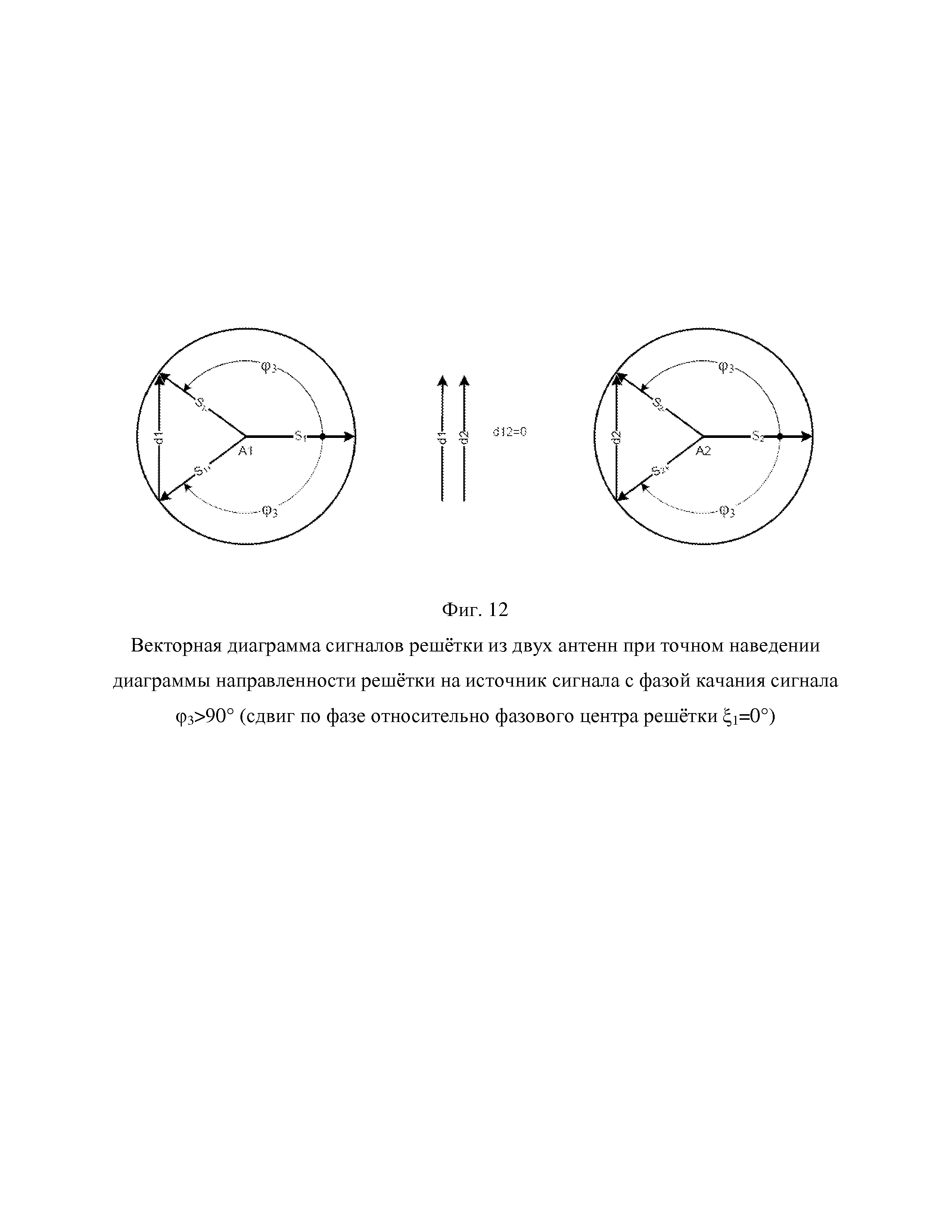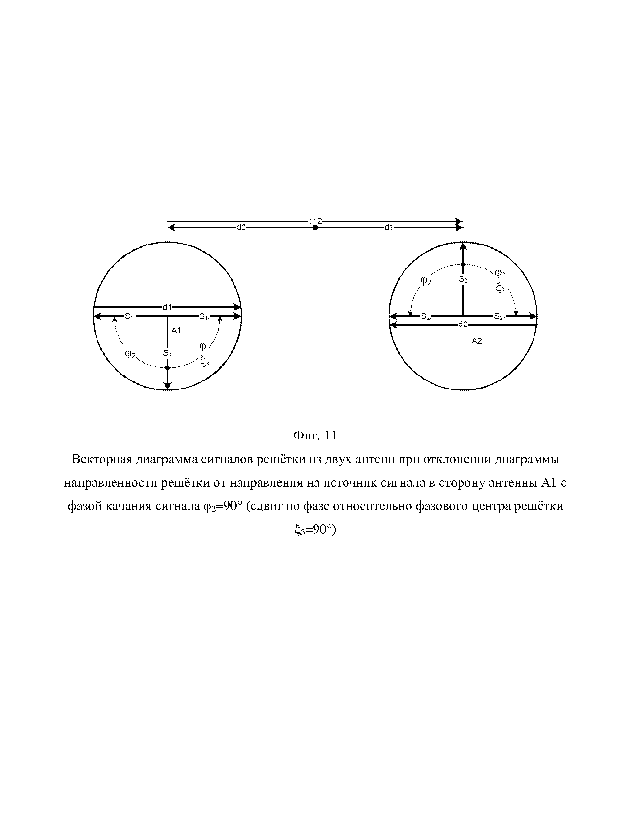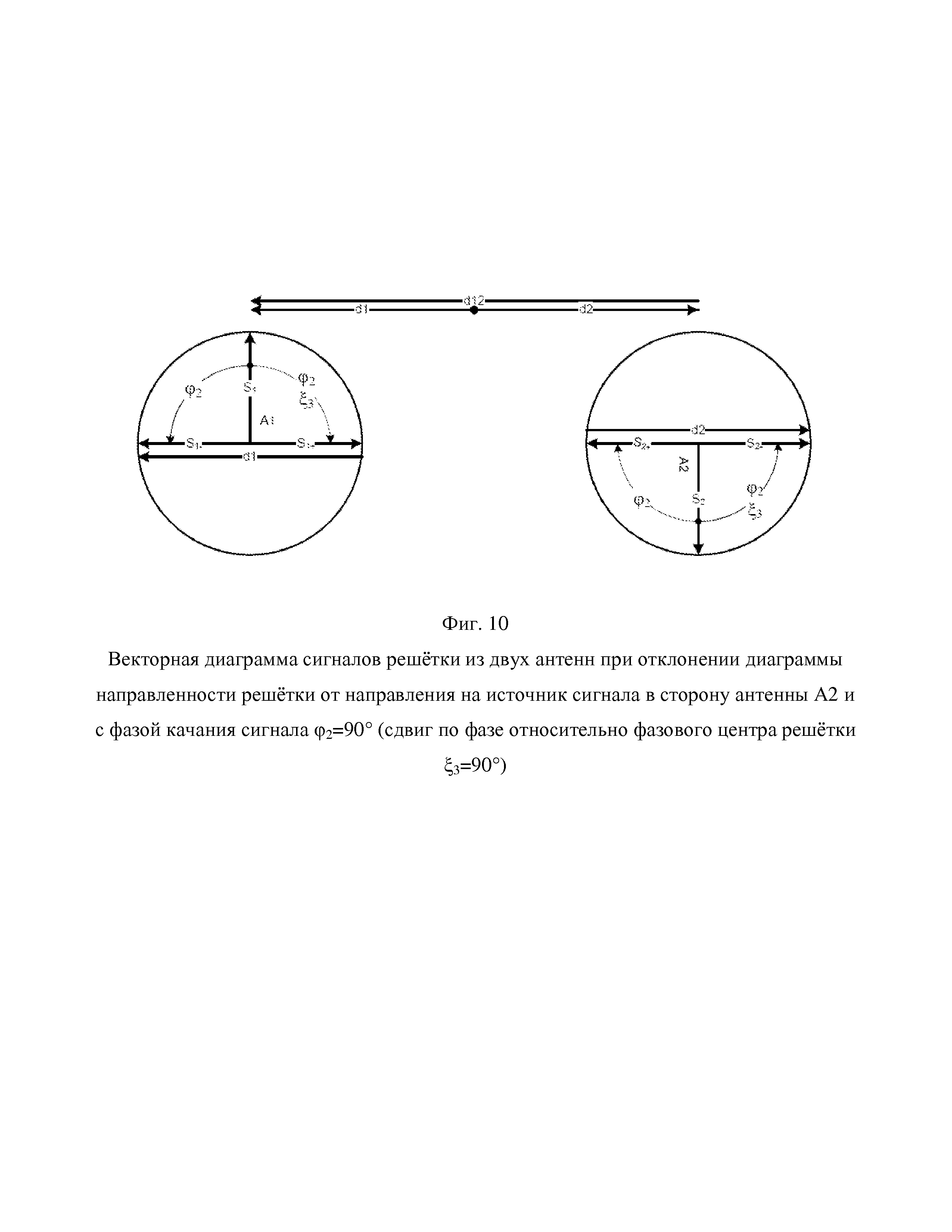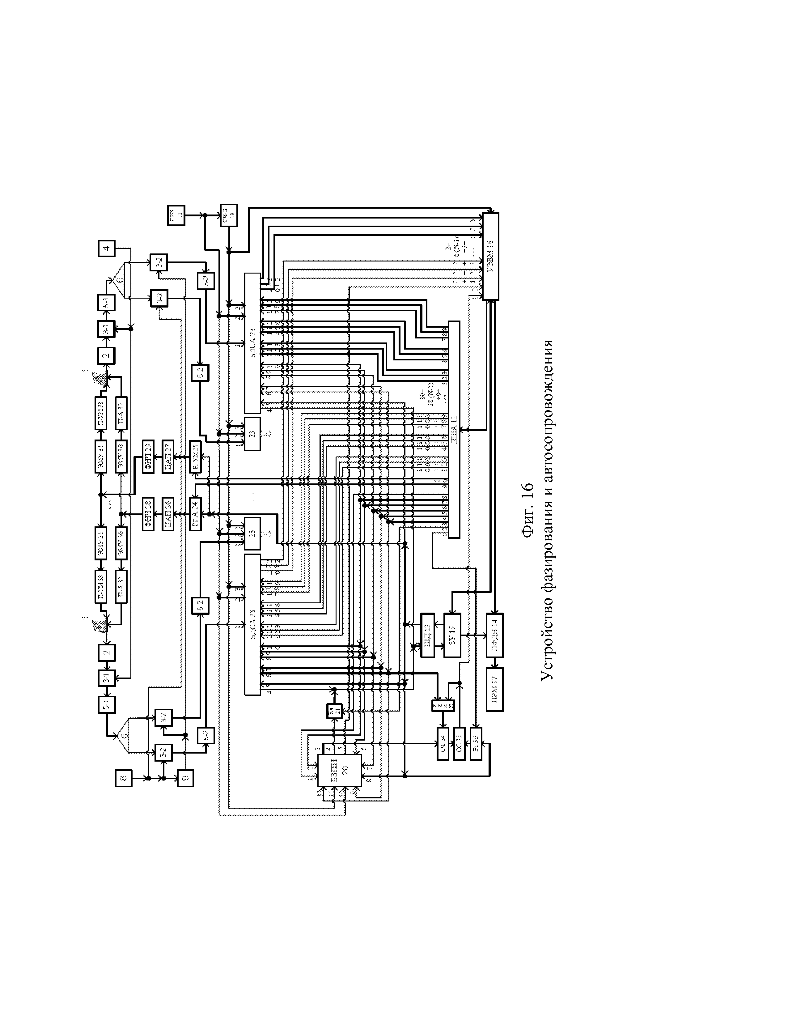 1. Способ фазирования и равносигнально-разностного автосопровождения неэквидистантной цифровой антенной решётки приёма широкополосных сигналов, причём приём сигнала осуществляют антеннами, являющимися частью антенной решётки, характеризующийся тем, что для каждого из двух квадратурных сигналов в информационном канале и в двух каналах автосопровождения каждой антенны формируют цифровые (дискретные) отсчёты принимаемого сигнала в моменты времени, относящиеся к одному и тому же фронту соответствующего сигнала, с последующим суммированием цифровых (дискретных) отсчётов соответствующего канала и соответствующего фронта соответствующего квадратурного сигнала от антенн решётки, причём в каждом канале автосопровождения для каждой антенны отсчёты, сформированные с опережением, предшествуют взятию отсчёта, а отсчёты, сформированные с отставанием, соответственно, отстают от взятия отсчёта сигнала от соответствующей антенны в информационном канале на интервал времени отклонения, для чего импульсы дискретизации сигнала опорной антенны и каждой ведомой антенны задерживают (сдвигают) на заданный интервал времени подставки относительно момента времени прихода фронта соответствующего сигнала соответствующей антенны на устройство фазирования и автосопровождения, сформированные цифровые (дискретные) отсчёты принятых сигналов от антенн записывают в соответствующие индексированные массивы памяти с индексами, которые относятся к текущему фронту волны принимаемого сигнала, спустя интервал времени подставки после записи цифровых (дискретных) отсчётов каждой из двух квадратур опорной антенны выбирают из соответствующих массивов и суммируют информационные цифровые (дискретные) отсчёты для каждой квадратуры по одному от каждой антенны с индексом, относящимся к текущему фронту волны сигнала, и записывают полученный суммарный информационный отсчёт каждой квадратуры в соответствующий массив с соответствующим индексом, в каждом цикле автосопровождения для текущего индекса отсчётов по суммарным значениям информационных отсчётов соответствующих квадратур рассчитывают фазу вектора информационного сигнала, для каждой антенны и каждой из двух квадратур формируют разностный цифровой сигнал автосопровождения со значением разности значений отсчётов в каналах автосопровождения каждой из двух квадратур, взятых с опережением и с отставанием от соответствующего отсчёта информационного канала, для каждой квадратуры формируют суммарный цифровой сигнал автосопровождения ближней либо дальней части решётки со значением, равным сумме значений разностных сигналов антенн соответствующей квадратуры, соответственно, ближней либо дальней к подвижному объекту части антенного поля относительно фазового центра решётки, для каждой квадратуры формируют разностный цифровой сигнал автосопровождения решётки по углу места со значением разности суммарных значений разностных сигналов антенн ближней и дальней к подвижному объекту частей антенного поля относительно фазового центра решётки, по квадратурам разностного цифрового сигнала автосопровождения решётки по углу места определяют модуль и фазу вектора разностного цифрового сигнала автосопровождения решётки по углу места, определяют знак цифрового сигнала автосопро