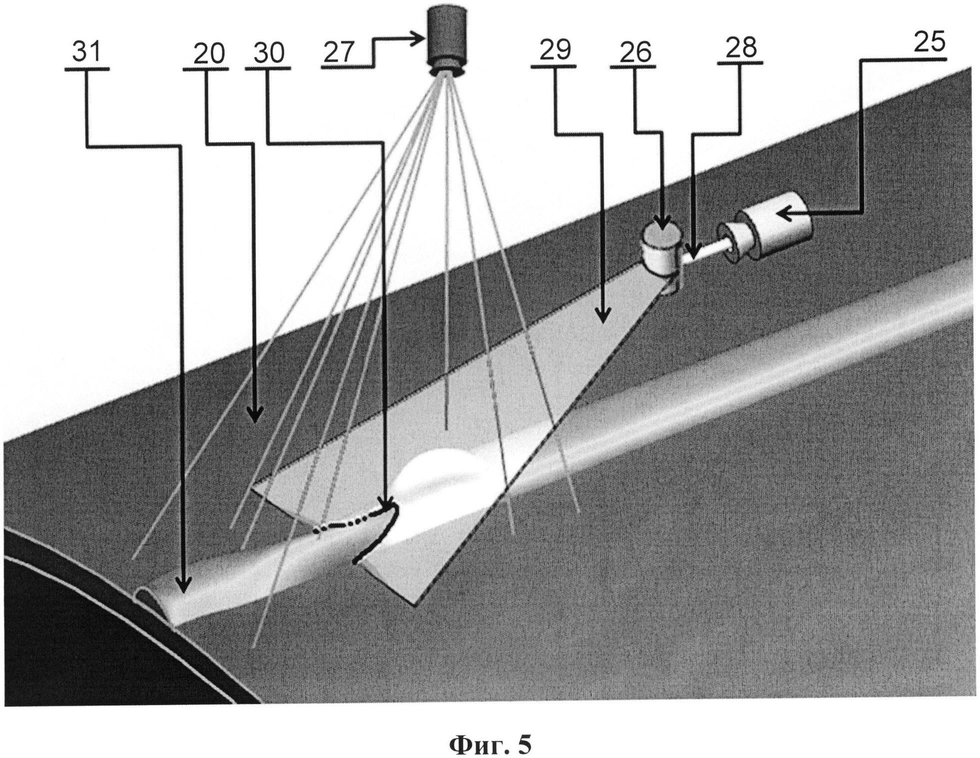 1. Комплекс для ультразвукового контроля изделий, содержащий сканирующую X-образную систему электромагнитно-акустических антенных решеток, состоящую из четырех линейных приемно-излучающих антенных решеток, расположенных в плане таким образом, что центры элементов антенных решеток лежат на двух пересекающихся прямых линиях, причем каждая антенная решетка расположена по одну сторону от точки их пересечения и снабжена соответствующим блоком импульсного подмагничивания, соединенным своим входом с одним из четырех выходов синхронизатора, пятый выход которого подключен ко входу генератора импульсов возбуждения, каждый из четырех выходов которого подключен ко входу соответствующей антенной решетки, выходы антенных решеток подключены к соответствующим входам многоканального приемного тракта, оптическое измерительное устройство, выходом подключенное к первому входу вычислительного блока, который также имеет связь через соответствующие шины обмена данных с синхронизатором, многоканальным приемным трактом и блоком отображения результатов контроля, по меньшей мере, все антенные решетки, блоки импульсного подмагничивания и оптическое измерительное устройство установлены на подвижной платформе, оснащенной датчиком пути и блоком управления движением платформы, при этом выход датчика пути подключен ко второму входу вычислительного блока, выход которого соединен со входом блока управления движением платформы, а каждый из элементов антенных решеток представляет собой пару изолированных катушек - излучающую и приемную, расположенных одна на другой и выполненных прямоугольными или овальными, при этом большая сторона прямоугольника или большая ось овала перпендикулярна соответствующей прямой линии Х-образной системы. 2. Комплекс по п.1, в котором подключение каждого из четырех выходов генератора импульсов возбуждения ко входу соответствующей антенной решетки, а также подключение выходов антенных решеток к соответствующим входам многоканального приемного тракта осуществляется с помощью соответствующей многоканальной шины передачи сигналов. 3. Комплекс по п.1, в котором каждый блок импульсного подмагничивания содержит генератор импульсов и магнитную систему в виде магнитопровода с обмоткой, при этом блоки расположены в плане так, что ближайшие друг к другу полюса магнитопроводов одноименны. 4. Комплекс по п.1, в котором каждый канал многоканального приемного тракта содержит последовательно соединенные усилитель и аналого-цифровой преобразователь. 5. Комплекс по п.1, в котором блок отображения результатов контроля выполнен в виде дисплея со вспомогательными устройствами. 6. Оптическое измерительное устройство, содержащее лазерный модуль с цилиндрической линзой на выходе для формирования световой линии на заданном участке объекта контроля, видеокамеру для оптического приема отраженной световой линии и систему обработки для получения координат и изображения профиля сварного шва, включающую в себя последовательно соединенные фильтр амплитудной селекции, фильтр частотной селекции, блок выделения фрагментов изображения и блок вычисления координат изображения, при этом вход фильтра амплитудной селекции соединен с выходом видеокамеры, а выход блока вычисления координат изображения является выходом устр