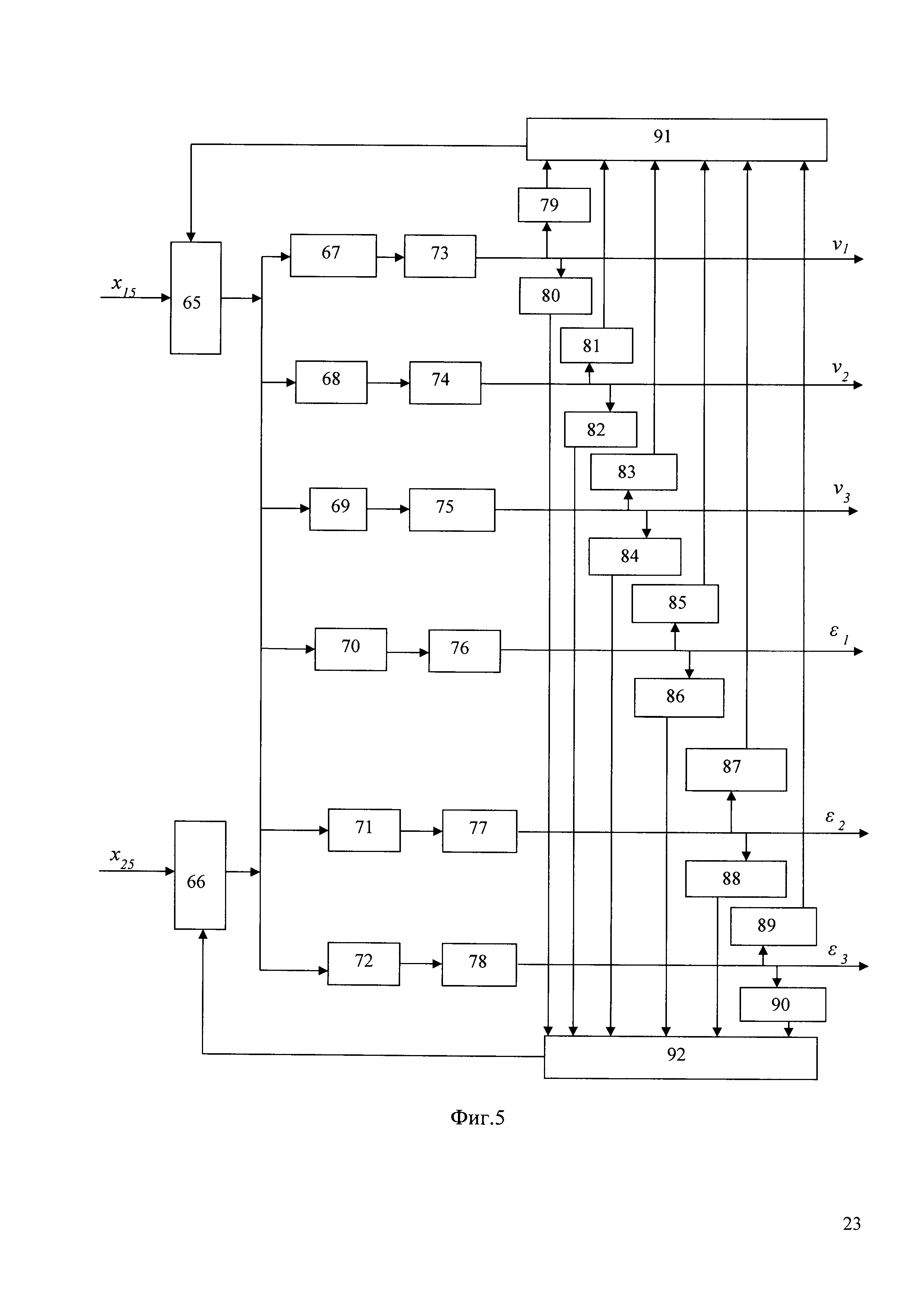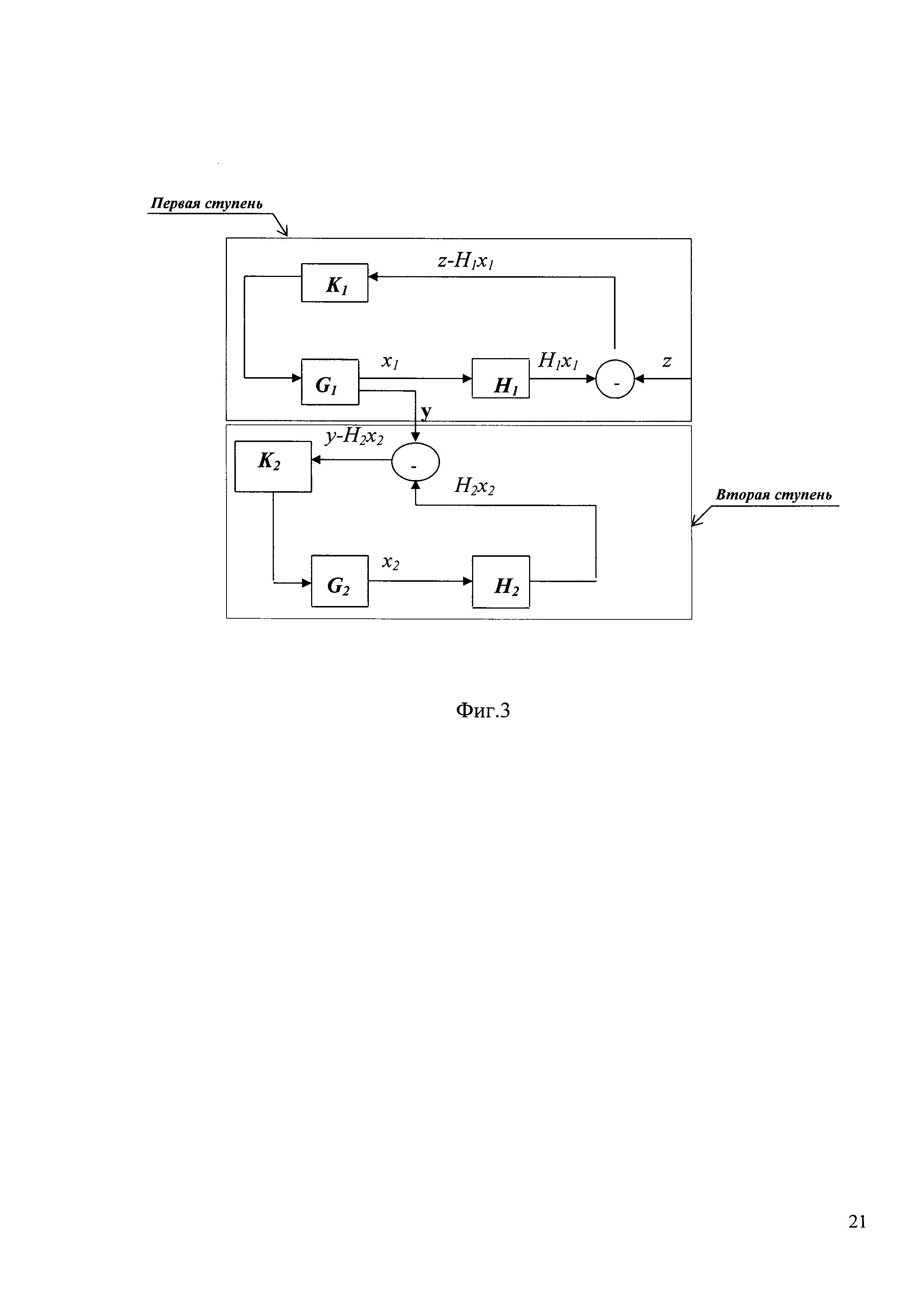 Изобретение относится к области корректируемых инерциальных навигационных систем и может быть использовано при разработке комплексированных навигационных систем, в которых основная навигационная информация, поставляемая бесплатформенными инерциальными навигационными системами, корректируется по позиционной и скоростной информации, поставляемой источниками внешней информации. При описании системы используются следующие ортогональные системы координат: - трехгранник Oh1h2h3, лежащий в плоскости Гринвичского меридиана, ось Oh3 направлена на северный полюс; - идеальный (сопровождающий) трехгранник Мх1x2x3 с началом в точке М, связанной с объектом, ось х3 совпадает с местной вертикалью; - модельный трехгранник Му1у2у3, реализуемый бортовой ЦВМ; - приборный трехгранник Mz1z2z3, связанный со строительными осями системы (блока чувствительных элементов). Взаимная ориентация трехгранников Мх1x2x3 и Му1у2у3 определяется вектором α малых углов поворота. Взаимная ориентация трехгранников Mz1z2z3 и Му1у2у3 задается матрицей ориентации А, имеющей следующий вид: где: ϑ, γ, ψ - углы крена, тангажа и гироскопического курса соответственно. Ориентация трехгранника Му1у2у3 относительно трехгранника Oh1h2h3 задается матрицей направляющих косинусов В, имеющей следующий вид: где: ϕ, λ, ε - географические координаты и курсовой угол. Стандартная блок-схема, по которой строится коррекция навигационной системы по внешней информации, представлена на Фиг. 1, где: G - импульсная переходная функция объекта регулирования; Н - матрица связи вектора корректируемых параметров системы х и вектора измерения z. На вход разностной схемы подается сигнал Нх, а на другой вход разностной схемы подается измерение z. Полученная разность z-Hx подается на вход блока обратной связи с коэффициентом усиления К, выход которого подключен к входу блока G. Математическая запись блок-схемы, представленной на Фиг. 1, имеет следующий вид: где надстрочный индекс " Примером такого способа коррекции инерциальной системы по внешней скоростной информации, поставляемой доплеровским датчиком скорости, (ДИСС) является инерциально-допплеровская система, реализованная в таких серийных астроинерциальных системах как Л-14МА и Л41. В обеих системах при построении фильтра ставилась задача оценки ошибок построения вертикали, скоростных ошибок и линейной комбинации кинематических ошибок системы, инструментальных ошибок (нескомпенсированные дрейфы и ошибки акселерометров) и ошибок измерения, вызванных ошибками взаимной привязки осей корректируемой системы и антенн ДИСС. Базовой при построении фильтра (импульсная переходная функция G) была принята динамическая группа уравнений ошибок системы (8)-(13), приведенная ниже. Асимптотически устойчивый фильтр шестого порядка, реализованный в системе Л-14МА, обеспечивал готовность оценок ошибок построения вертикали и скоростной ошибки за 30 минут, а фильтр того же порядка, реализованный в системе Л41 с использованием метода калмановской фильтрации, обеспечивал готовность оценок ошибок построения вертикали и скоростной ошибки за 12 минут времени. Наиболее близкой по своей сущности к предложенному решению является бесплатформенная инерциальная навигационная система БИНС-СП, корректируемая по внешней позиционной и скоростной информации, которая состоит из блока чув