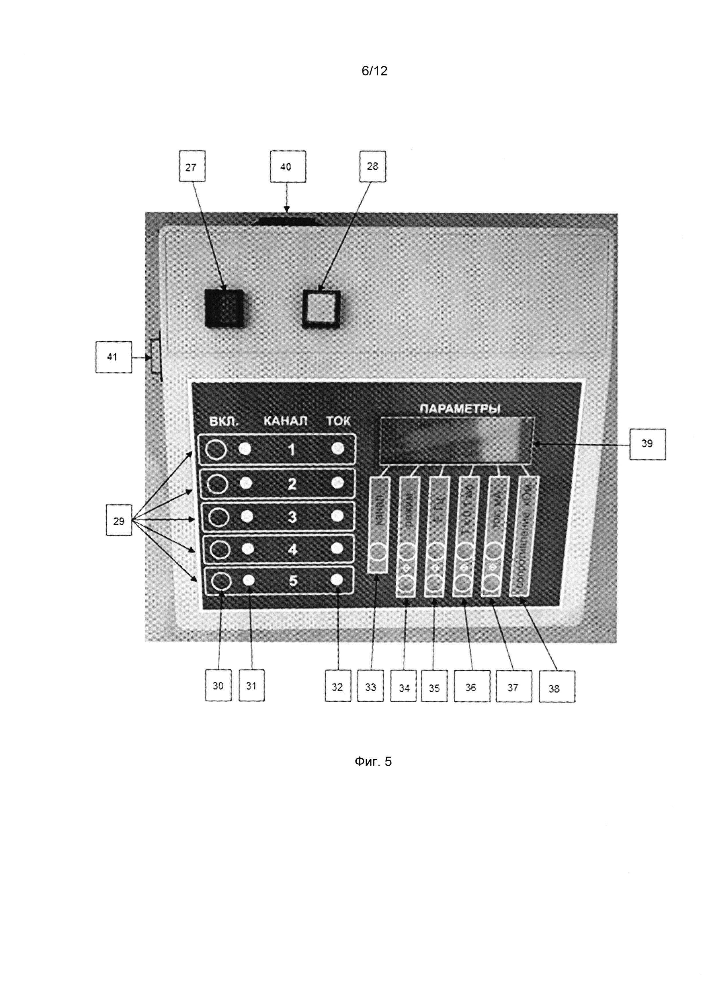 1. Электростимулятор спинного мозга, содержащий пять каналов стимуляции с электродной системой, каждый из которых включает последовательно соединенные преобразователь напряжения, генератор тока и формирователь выходного сигнала и выполнен с возможностью генерации ритмических модулированных биполярных, ритмических монополярных импульсов прямоугольной формы, ритмических или одиночных немодулированных монополярных импульсов прямоугольной формы, с частотой стимуляции в диапазоне 1-99 Гц, с амплитудой тока от 1 до 300 мА и частотой модуляции от 4 до 10 кГц, входы каждого из которых подключены к микроконтроллеру, который связан с блоком индикации, органами управления и радиомодулем, при этом микроконтроллер выполнен с возможностью запуска по меньшей мере одного канала стимуляции, выбора режима запуска независимо по каждому из каналов стимуляции, управления по каждому из каналов стимуляции параметрами импульсов, выбранными из по меньшей мере формы импульсов, частоты стимуляции с шагом изменения частоты в 1 Гц, частоты модуляции с шагом изменения частоты в 1 кГц, силы тока с шагом изменения 1 мА, длительности импульса с шагом изменения 0,1 мс. 2. Электростимулятор по п. 1, отличающийся тем, что микроконтроллер выполнен с возможностью выбора режима запуска между однократным режимом с пассивной фазой деполяризации или непрерывным режимом с активным типом фазы деполяризации. 3. Электростимулятор по п. 1, отличающийся тем, что синхронизирован с внешними устройствами с синхровходом, например, с устройствами для регистрации вызванного двигательного ответа. 4. Электростимулятор по п. 1, отличающийся тем, что дополнительно соединен с компьютером. 5. Электростимулятор по п. 4, отличающийся тем, что запуск по меньшей мере одного канала стимуляции, выбора режима запуска независимо по каждому из каналов стимуляции, управление по каждому из каналов стимуляции параметрами импульсов осуществляется с помощью компьютера. 6. Электростимулятор по п. 4, отличающийся тем, что запуск по меньшей мере одного канала стимуляции, выбора режима запуска независимо по каждому из каналов стимуляции, управление по каждому из каналов стимуляции параметрами импульсов осуществляется с помощью компьютера и органов управления и блока индикации. 7. Электростимулятор по п. 1, отличающийся тем, что запуск по меньшей мере одного канала стимуляции, выбора режима запуска независимо по каждому из каналов стимуляции, управление по каждому из каналов стимуляции параметрами импульсов осуществляется с помощью органов управления и блока индикации.