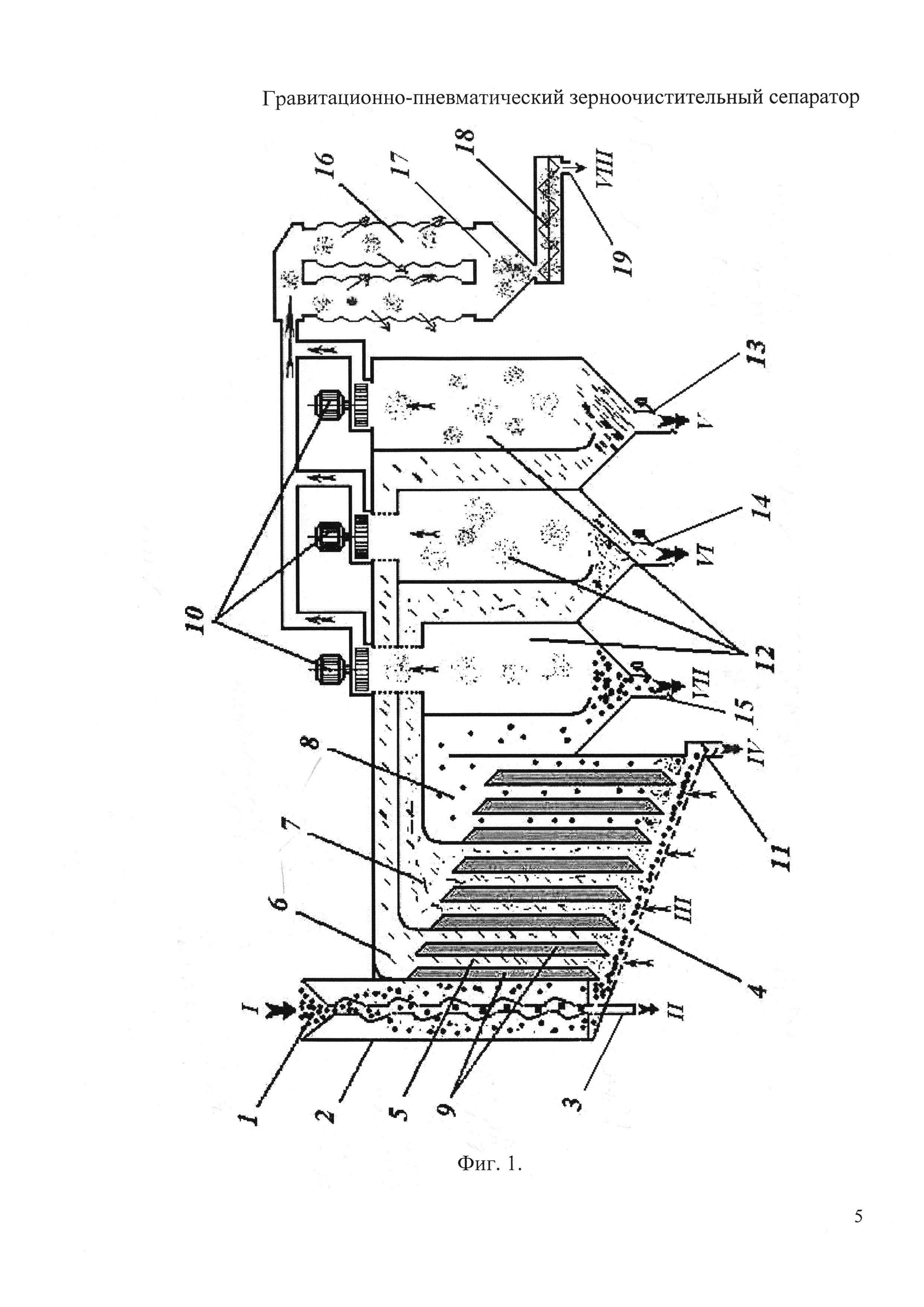 Изобретение относится к устройствам, сепарирующим зерновые и другие сыпучие материалы по крупности и аэродинамическим свойствам и может быть применено при очистке зерна и семян в сельском хозяйстве. Известен сепаратор сыпучих материалов по крупности, содержащий гравитационную колонку, в которой размещены зигзагообразно одна ниже другой просеивающие поверхности в виде консольно закрепленных пальцев [Патент России №2071389, МПК В07В 1/04, 1994]. Известный сепаратор за один пропуск обрабатываемого материала под действием гравитационных сил производит очистку только по одному параметру определенному зазором между консольно закрепленных пальцев, поэтому недостаточно эффективен. Наиболее близким по технической сущности и достигаемому результату к заявленному изобретению является выбранный в качестве прототипа сепаратор сыпучих материалов, включающий гравитационную колонку, внутри которой установлены зигзагообразные ряды вогнутых просеивающих поверхностей для сепарирования обрабатываемого материала по крупности, а также загрузочное приспособление, пневмосепарирующий канал и патрубки вывода разделенных фракций [Патент России №2121878, МПК В02С 23/08, 1997]. Известное устройство работоспособно при очистке от крупных примесей, но недостаточно эффективно при выделении мелких и легких примесей. Технической задачей изобретения является повышение эффективности разделения зернового материала. Указанная техническая задача достигается тем, что в гравитационно-пневматическом зерноочистительном сепараторе, включающем гравитационную колонку, внутри которой установлены зигзагообразные ряды вогнутых просеивающих поверхностей для сепарирования обрабатываемого материала по крупности, а также загрузочное приспособление, пневмосепарирующий канал и патрубки вывода разделенных фракций, согласно изобретению пневмосепарирующий канал разделен как минимум на три секции, в каждой из которых установлены как минимум по два выравнивающих скорость воздушного потока устройства, каждая секция пневмосепарирующего канала подсоединена посредством воздуховодов к отдельной осадочной камере с вентилятором, а каждый вентилятор соединен с фильтром и пылесборником, имеющим транспортер для вывода пыли. Изобретение поясняется фиг.1, где представлена конструктивно-компоновочная схема гравитационно-пневматического зерноочистительного сепаратора. Сепаратор содержит загрузочное приспособление 1, гравитационную колонку 2, патрубок 3 вывода крупной примеси, поддерживающую сетку 4, пневмосепарирующий канал 5, секции пневмосепарирующего канала 6, 7 и 8, устройства 9, выравнивающие скорость воздушного потока, вентиляторы 10, патрубок 11 вывода очищенного зерна, осадочные камеры 12, патрубок 13 вывода легких примесей, патрубок 14 вывода щуплых и битых зерновок, патрубок 15 вывода трудноотделимых примесей, фильтры 16, сборник пыли 17, транспортер 18 и патрубок 19 вывода пыли. Кроме этого на схеме сепаратора представлены исходный материал I, крупная примесь II, воздушный поток III, очищенный материал IV, легкая примесь V, битые и щуплые зерновки VI, трудноотделимая примесь VII и пыль VIII. Гравитационно-пневматический зерноочистительный сепаратор работает следующим образом. Исходный зерновой материал I, состоящий из зерна и подлежащих выделению примесей, через загрузо