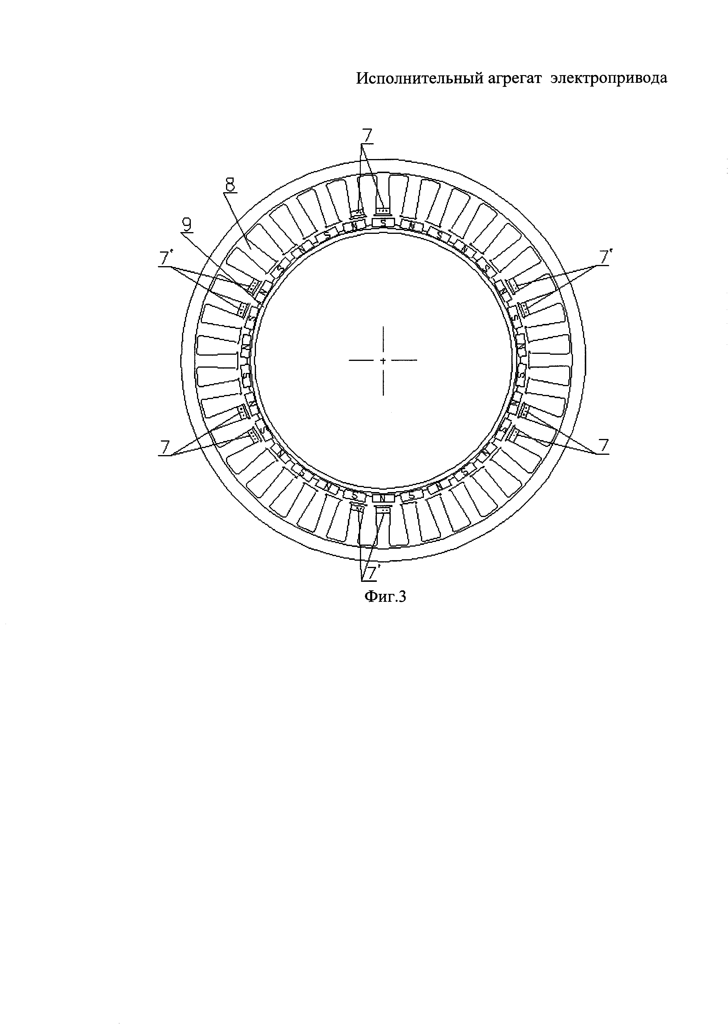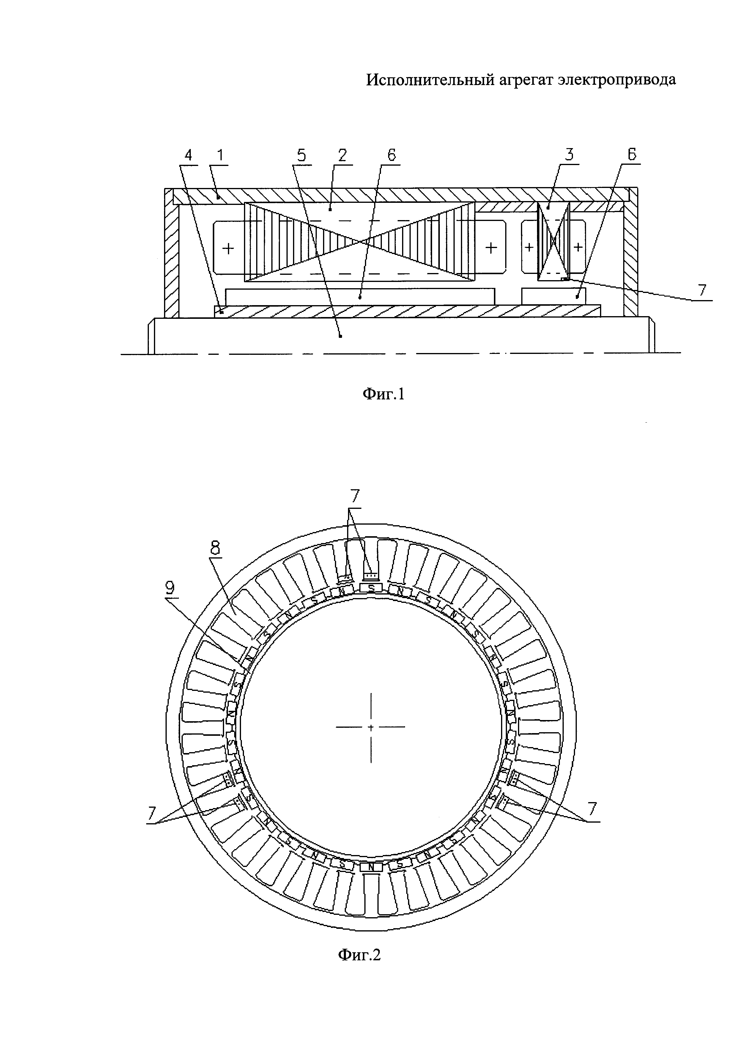 1. Исполнительный агрегат электропривода, содержащий многополюсный ротор и зубчатый статор, на котором размещены обмотки синхронного двигателя и синхронного генератора, выполненные с зубцовым шагом, а также элементы датчика положения, отличающийся тем, что статор исполнительного агрегата выполнен в виде двух магнитопроводов, на одном из которых размещена обмотка синхронного двигателя, а на другом - обмотка синхронного генератора и элементы датчика положения, причем указанные обмотки занимают все пазы своего магнитопровода, а элементы датчика положения размещены на зубцах одной из фазовых групп соответствующей фазы синхронного генератора и расположены относительно друг друга под углом в ϕ радиан, где 2. Исполнительный агрегат электропривода по п. 1, отличающийся тем, что датчик положения снабжен вторым комплектом элементов, размещенных на зубцах диаметрально расположенных фазовых групп обмоток синхронного генератора.