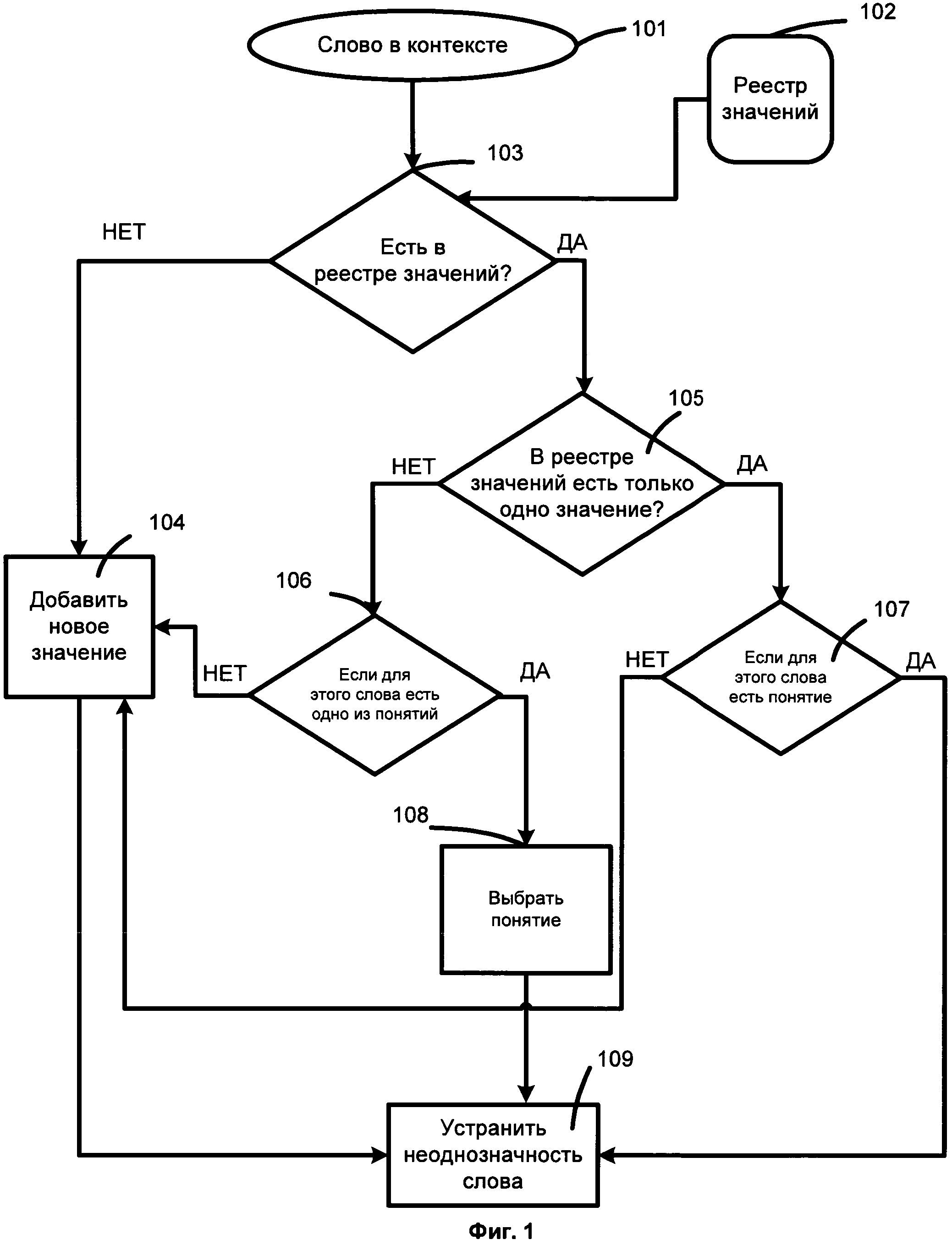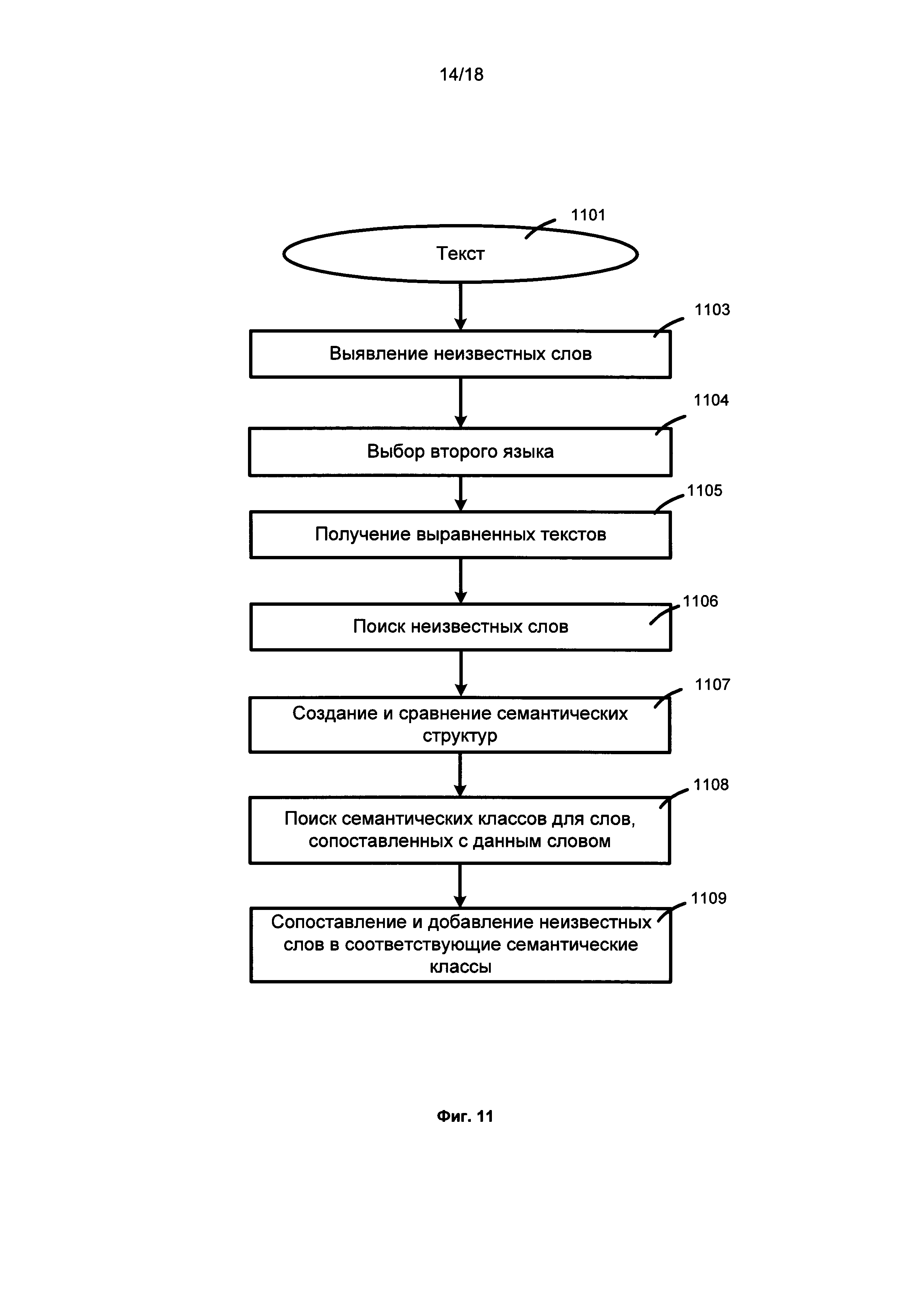 УРОВЕНЬ ТЕХНИКИ [001] Во многих естественных языках есть омонимы, т.е. слова, имеющие несколько значений. Когда человек находит такое слово в тексте, он может безошибочно выбрать правильное значение в зависимости от контекста и интуиции. Совсем другая ситуация - когда текст анализируется с помощью компьютерной системы. Существующие системы для разрешения неоднозначности в тексте в основном базируются на лексических ресурсах, таких как словари. Для конкретного слова такие способы извлекают из лексического ресурса все возможные значения этого слова. После этого могут применяться различные способы определения того, какое из этих значений слова является релевантным. Большинство таких способов являются статистическими, т.е. основанными на анализе больших корпусов текста, в то время как некоторые другие основаны на использовании информации из словаря (например, учитывающих степень ″пересечения″ между толкованием в словаре и локальным контекстом, в котором используется слово). Для конкретного слова, для которого должна быть разрешена неоднозначность, такие способы, как правило, основаны на решении задачи классификации (т.е. возможные значения слова рассматриваются в качестве категорий, и слово должно быть отнесено к одной из них). [002] Существующие способы решают проблему разрешения неоднозначности многозначных слов и омонимов, считая многозначными словами и омонимами те слова, которые появляются несколько раз в используемом реестре значений. Ни один из способов не работает со словами, которые вообще не появляются в используемом лексическом ресурсе. Реестры значений, используемые существующими способами, не позволяют вносить изменения и не отражают изменения, происходящие в языке. Есть только несколько способов, которые основаны на использовании значений из Википедии, но эти способы не вносят никаких изменений в реестр значений. [003] В настоящее время мир быстро меняется, появляется много новых технологий и продуктов, при этом соответственно изменяется и язык. Появляются новые слова для обозначения новых понятий, а также появляются новые значения для некоторых существующих слов. Поэтому способы устранения неоднозначности текста - обеспечивать возможность эффективно обрабатывать новые слова, которые отсутствуют в используемом реестре значений, добавлять эти понятия в реестр значений и использовать их во время дальнейшего анализа. РАСКРЫТИЕ ИЗОБРЕТЕНИЯ [004] Один пример реализации изобретения относится к способу. Способ включает в себя получение с помощью вычислительного устройства первого текста на первом языке. Способ дополнительно включает в себя обнаружение по меньшей мере одного неизвестного слова в первом тексте на первом языке. Далее, способ включает выбор по меньшей мере одного второго языка, причем первый язык отличается от любого из выбранных вторых языков. Способ дополнительно включает в себя получение вычислительным устройством первого набора текстов на первом языке и второго набора текстов на втором языке для каждого второго языка, причем первый набор текстов на первом языке выровнен со вторым набором текстов на втором языке. Способ дополнительно включает сопоставление неизвестного слова с по меньшей мере одним словом во втором наборе текстов, выровненным с по меньшей мере одним неизвестным с