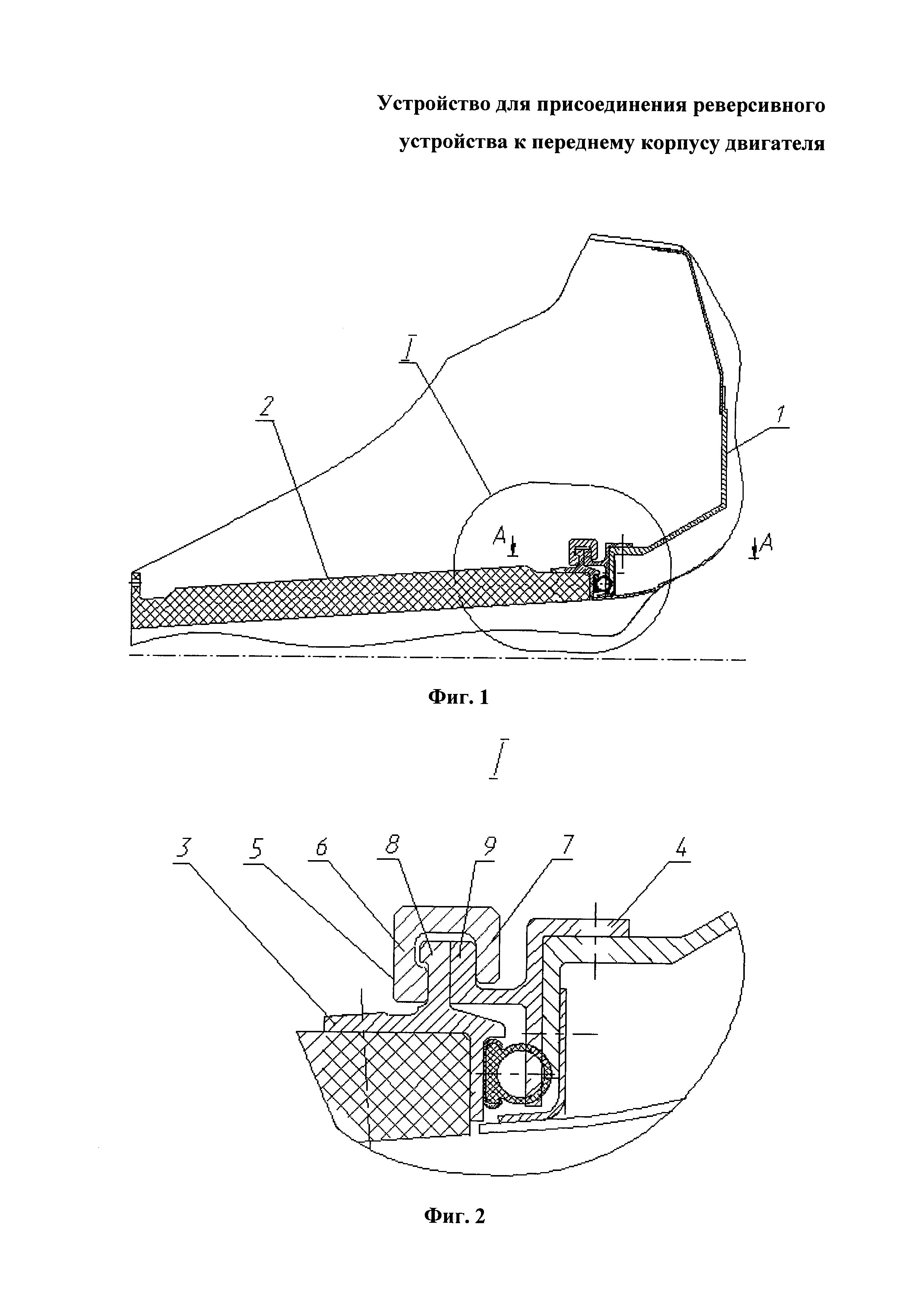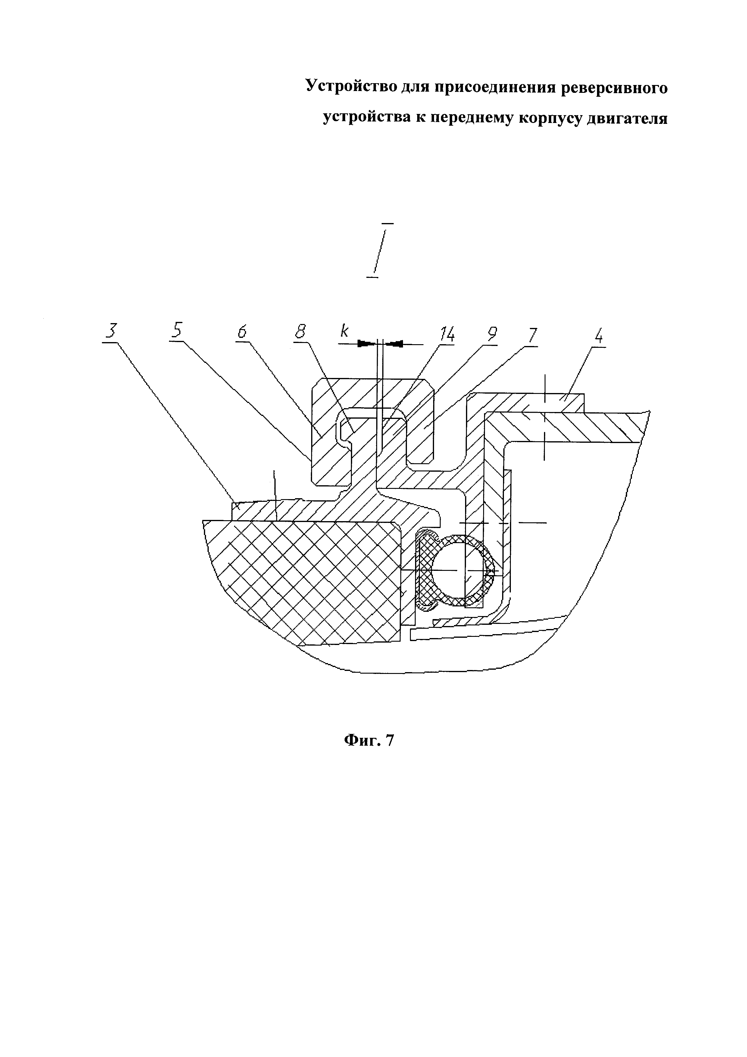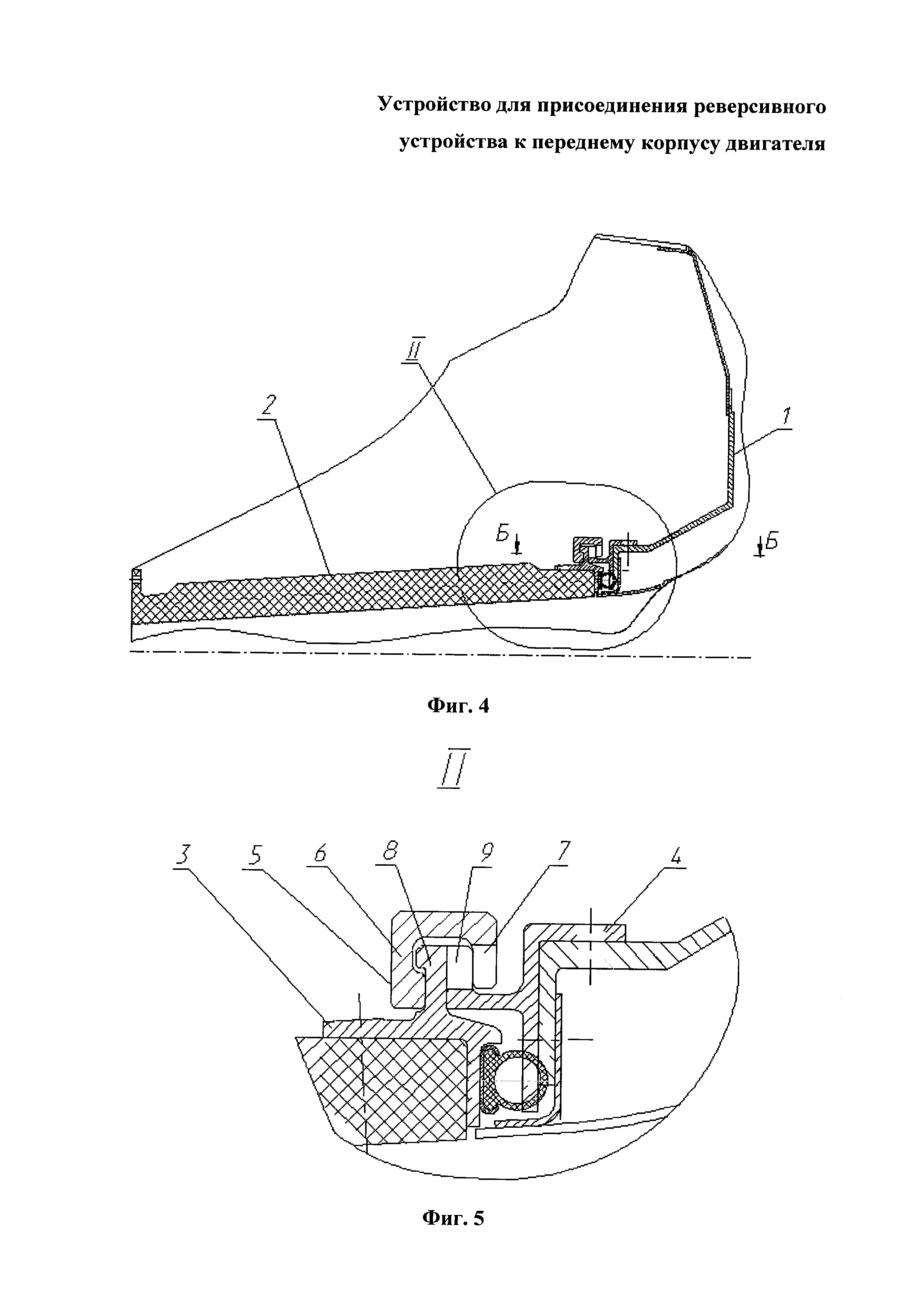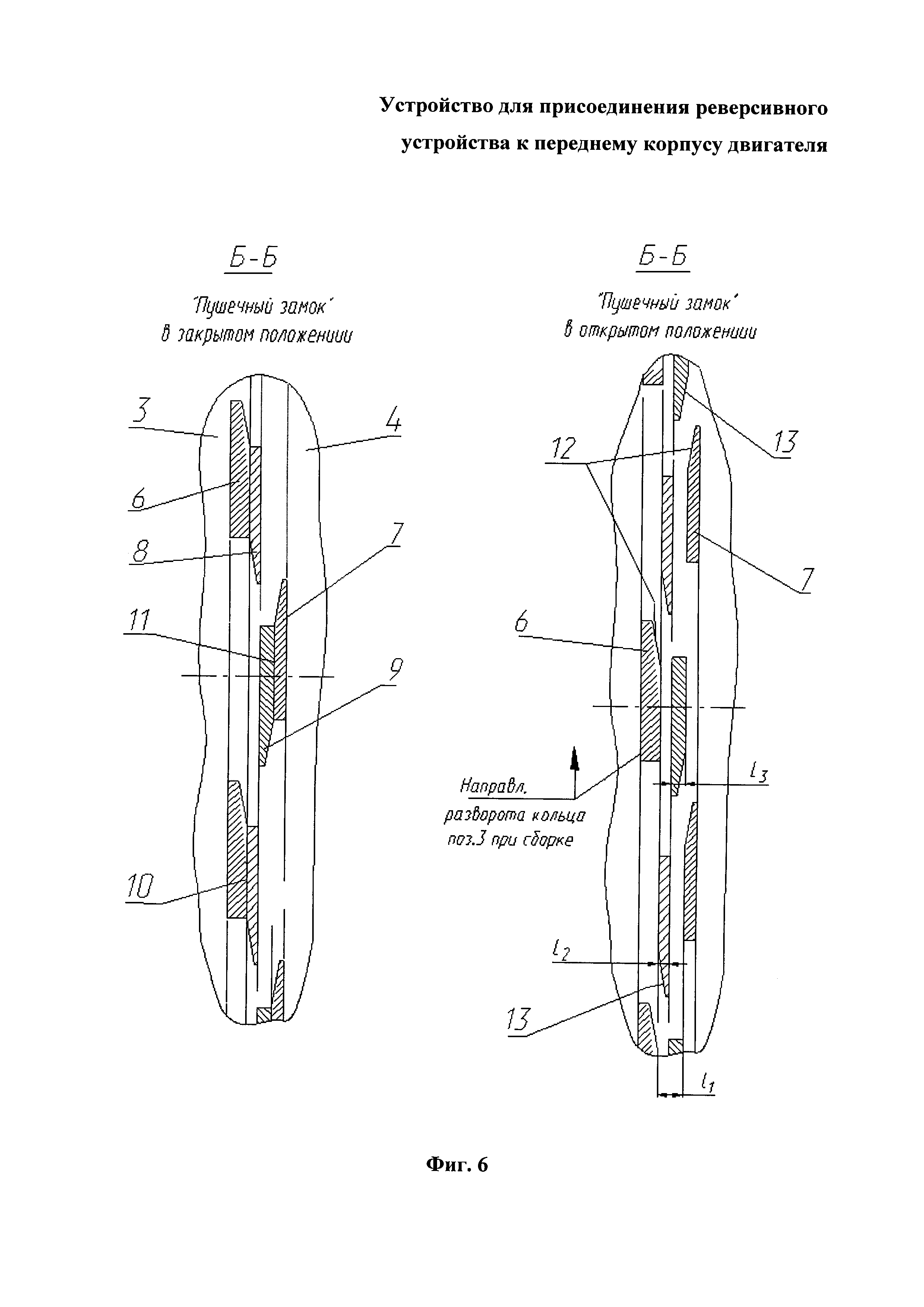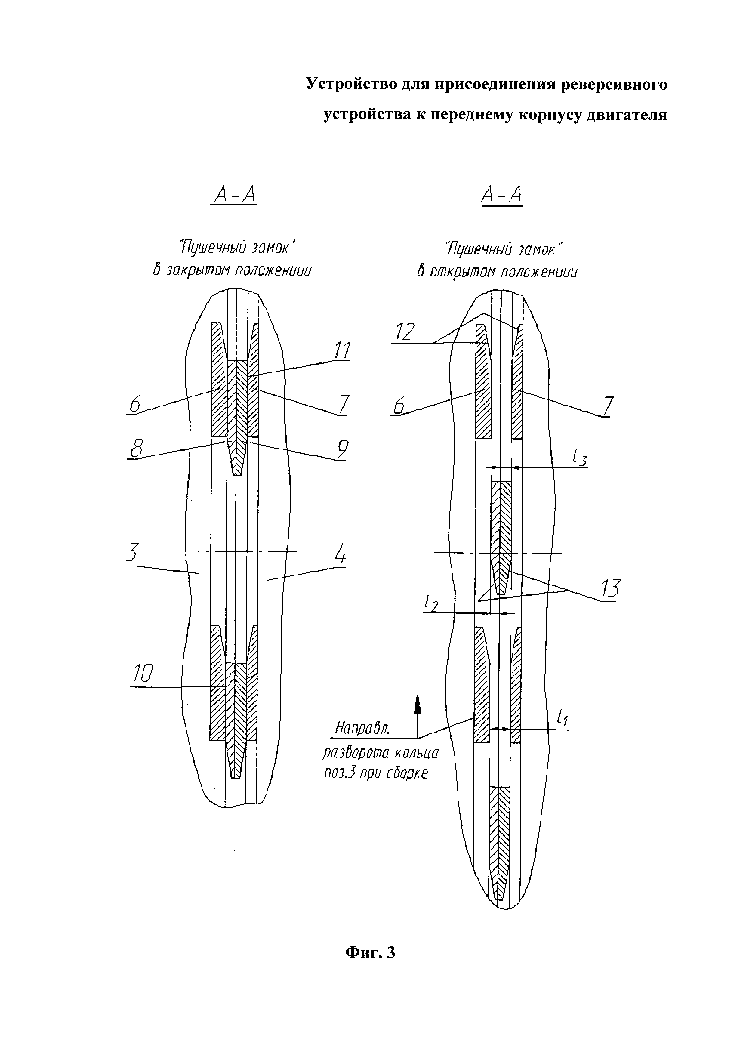 1. Устройство для присоединения реверсивного устройства к переднему корпусу двигателя, включающее «пушечный» замок с подвижным кольцом, отличающееся тем, что подвижное кольцо выполнено цельным по окружности, имеет П-образную форму в поперечном сечении и выступы, выполненные с возможностью образования контактных пар «пушечного» замка с выступами фланцев переднего корпуса и реверсивного устройства, соответственно, при этом выступы подвижного кольца выполнены с возможностью контакта с выступами фланцев переднего корпуса и реверсивного устройства с упругим натягом Δl=0-0,4 мм, определяемым по формуле: Δl=l1-(l2+l3), где 2. Устройство по п. 1, отличающееся тем, что выступы подвижного кольца выполнены с возможностью образования контактных пар «пушечного» замка симметрично по окружности. 3. Устройство по п. 1, отличающееся тем, что выступы подвижного кольца выполнены с возможностью образования контактных пар «пушечного» замка в шахматном порядке по окружности. 4. Устройство по п. 1, отличающееся тем, что выступы фланца реверсивного устройства «пушечного» замка выполнены каждый с торцевой выточкой, образующей зазор k=0,1-0,8 мм при контакте выступа фланца реверсивного устройства с выступом фланца переднего корпуса.