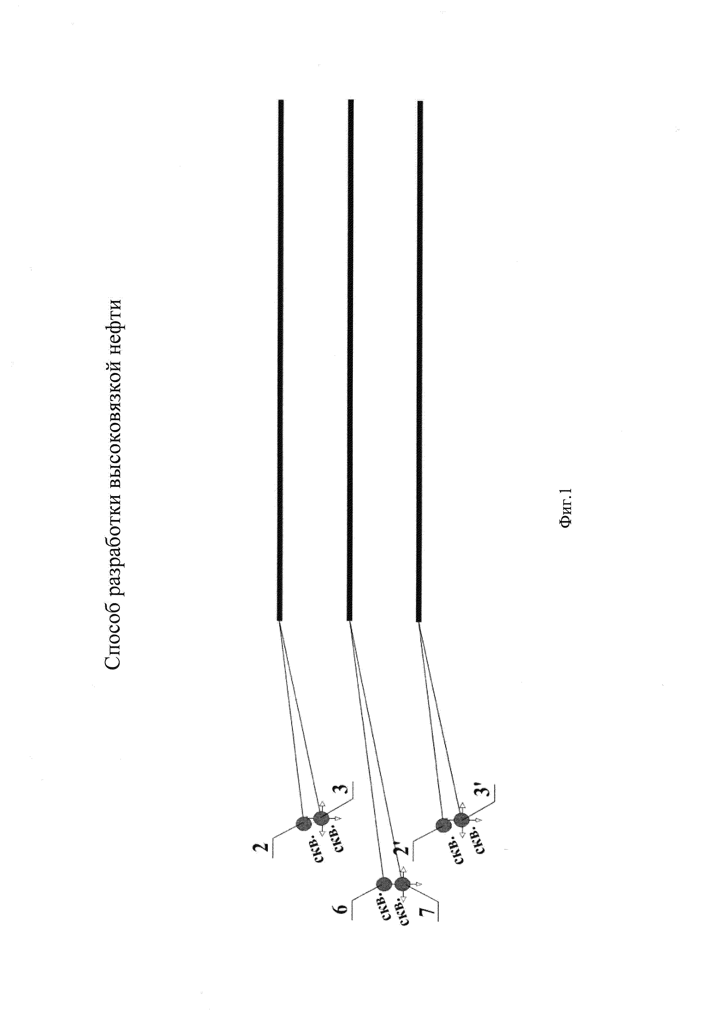 Изобретение относится к нефтедобывающей промышленности, в частности к разработке залежей высоковязкой нефти или битумов при тепловом воздействии горизонтальными скважинами. Известен способ разработки месторождений высоковязкой нефти или битума (патент RU №2582256, МПК Е21В 43/24, Е21В 43/22, опубл. Бюл. №11 от 24.04.2016), включающий строительство парных, расположенных друг над другом горизонтальных добывающих и нагнетательных скважин, а также дополнительных горизонтальных скважин, закачку теплоносителя через нагнетательные скважины с прогревом продуктивного пласта и созданием паровой камеры, отбор продукции за счет парогравитационного дренажа через добывающие скважины и контроль за состоянием паровой камеры. Разработку месторождения нефти или битума ведут с регулированием текущего размера паровой камеры путем изменения объемов закачки теплоносителя в нагнетательные скважины и отбора жидкости из добывающих скважин с контролем объема паровой камеры. В качестве теплоносителя используется перегретый пар или пар с инертным газом. Дополнительную скважину строят между добывающей и нагнетательной скважинами в паре в диапазоне от 1/3 до 2/3 расстояния между ними. Растворитель закачивают только через дополнительную скважину с интервалами по времени в зоны наименьшего прогрева. Контроль за состоянием паровой камеры ведут снятием термограммы в добывающей горизонтальной скважине с дополнительным определением зон наименьшего прогрева. Недостатком способа является технологическая сложность его реализации, в частности бурение между существующими горизонтальными стволами по вертикали дополнительной скважины с горизонтальным участком ствола, а также не охват добычей нижних краевых зон горизонтальных стволов парных скважин ряда. Известен, также способ разработки залежи высоковязкой нефти и битумов (патент RU №2439305, МПК Е21В 43/24, опубл. Бюл. №1 от 10.01.2012), включающий строительство добывающей скважины с вскрытым горизонтальным участком в продуктивном пласте и нагнетательной скважины с профилем, параллельным и аналогичным профилю добывающей скважины, но расположенным над ней в том же продуктивном пласте, закачку теплоносителя в нагнетательную скважину и отбор продукции пласта из добывающей скважины, при этом на расстоянии 180-200 м в продуктивном пласте бурят аналогичную и параллельную пару горизонтальных скважин, причем между добывающими горизонтальными скважинами равномерно располагают две нижние добывающие скважины с горизонтальными участками, параллельным горизонтальным участкам добывающих скважин, а между нагнетательными - одну верхнюю добывающую скважину с горизонтальным участком, параллельным горизонтальным участкам нагнетательных скважин, после чего все скважины используют под закачку теплоносителя в виде перегретого пара до создания парогазовой камеры над нагнетательными скважинами, после чего добывающие нижние и верхнюю скважины переводят под отбор нагретой продукции. Недостатками данного способа являются высокие материальные затраты на бурение дополнительных горизонтальных скважин без учета свойств пласта, распространения существующей паровой камеры и условий добычи, так же невозможно поддерживать оптимальную температуру для отбора из дополнительных добывающих скважин, так как при снижении температу