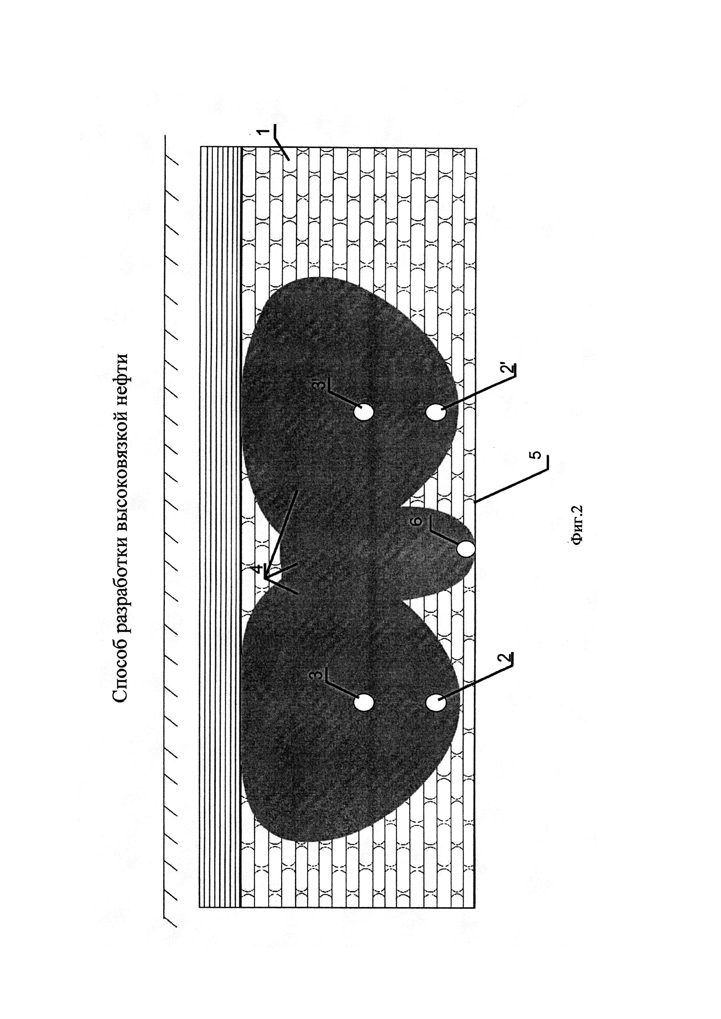 Способ разработки высоковязкой нефти, включающий строительство пар расположенных друг над другом горизонтальных добывающих и нагнетательных скважин, а также вертикальных наблюдательных скважин, закачку теплоносителя через нагнетательные скважины с прогревом продуктивного пласта и созданием паровой камеры, отбор продукции за счет парогравитационного дренажа через добывающие скважины и контроль за состоянием паровой камеры, при этом разработку ведут с регулированием текущего размера паровой камеры путем изменения объемов закачки теплоносителя в нагнетательные скважины и отбора жидкости из добывающих скважин с контролем объема паровой камеры, строительство в зонах наименьшего прогрева между добывающими скважинами на уровне подошвы пласта или уровне водонефтяного контакта - ВНК дополнительной скважины, через которую производят закачку теплоносителя до создания термодинамической связи с ближайшими парами горизонтальных скважин с последующим переводом на отбор продукции, отличающийся тем, что дополнительную скважину оборудуют средствами контроля температуры добываемой продукции, определяют граничную температуру продукции этой скважины, при которой ухудшается гидродинамическая связь с близлежащими добывающими скважинами, при снижении температуры добываемой продукции из дополнительной скважины до граничной температуры в нее повторно закачивают теплоноситель для восстановления гидродинамической связи с близлежащими добывающими скважинами, после чего возобновляют отбор, далее циклы закачки и отбора в дополнительной скважине повторяют исходя из граничной температуры отбираемой из нее продукции.