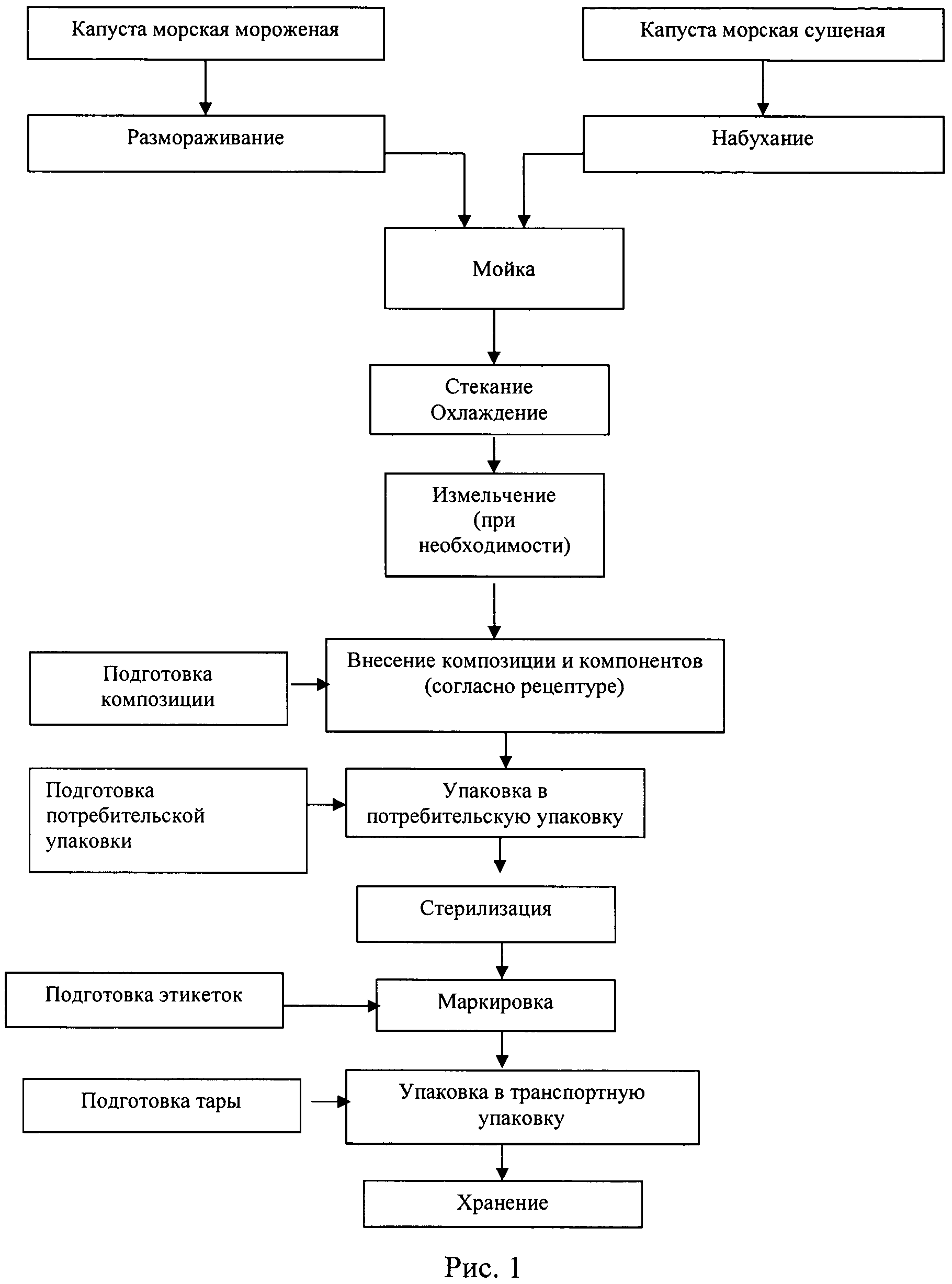 Изобретение относится к рыбной промышленности, а именно к созданию пищевой консервированной продукции из морских водорослей, например ламинарии. Способ приготовления стерилизованных консервов из ламинарии включает мойку, измельчение, смешивание с растительным маслом и пряностями, фасование в потребительскую тару и стерилизацию, при этом предварительно готовят композицию на основе растительного масла, в которое вносят жир тюленя при соотношении 2:1-1,5:1 соответственно, и СО2 экстракт укропа в количестве 0,1% к массе композиции, при этом композицию вносят в количестве от 3-7% к массе ламинарии, в качестве потребительской тары используют банки из материала типа ″Ламистер″ или пакет дой-пак с донышком, стерилизацию ведут путем нагревания продукта при температуре 100°C в течение 10 мин с последующей выдержкой при температуре 110-120°C в течение 10-60 мин, после чего продукт охлаждают в течение 40 мин до достижения температуры внутри продукта 30°C. Способ позволяет получить пищевой продукт на основе морской капусты с повышенной биологической ценностью, в удобной потребительской таре. 1 ил., 2 табл.