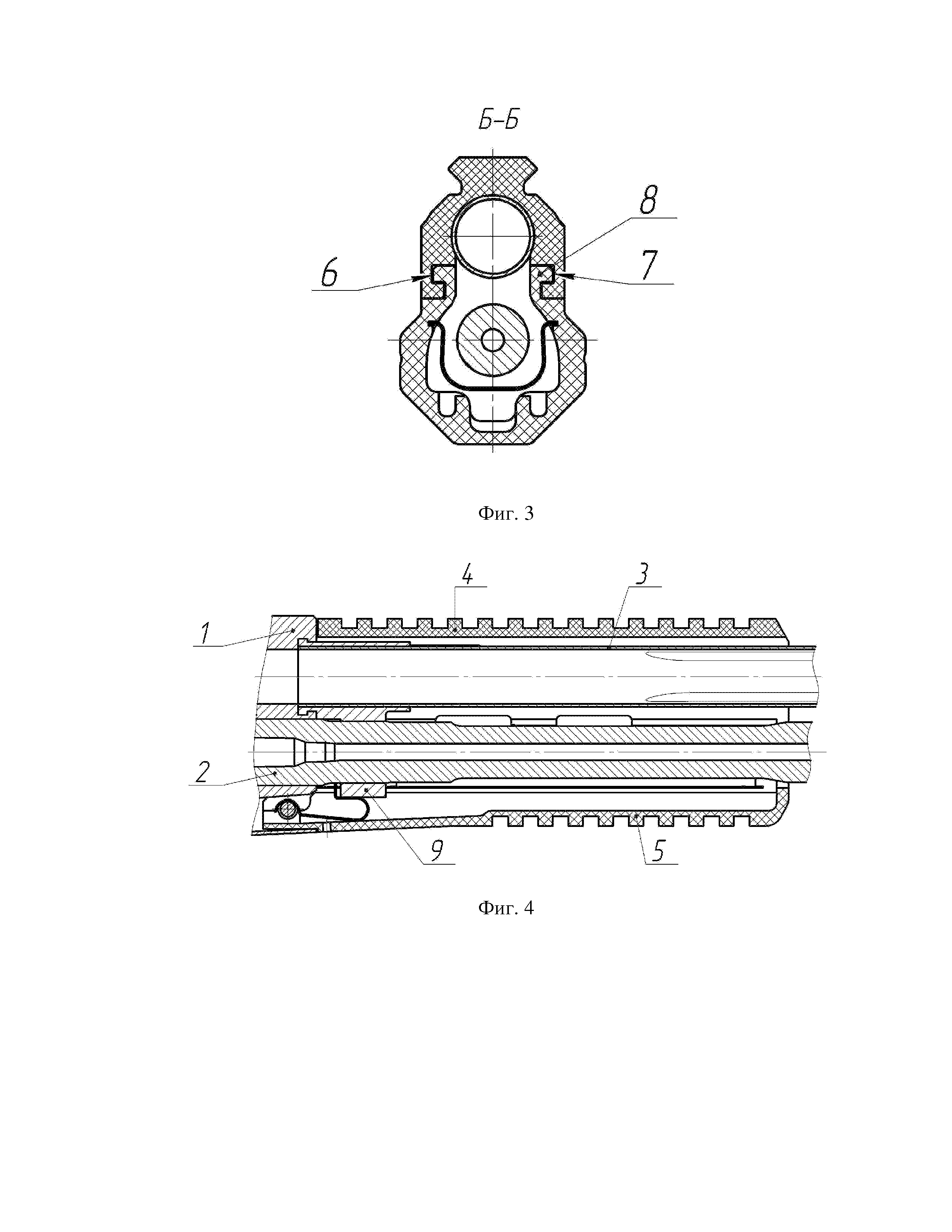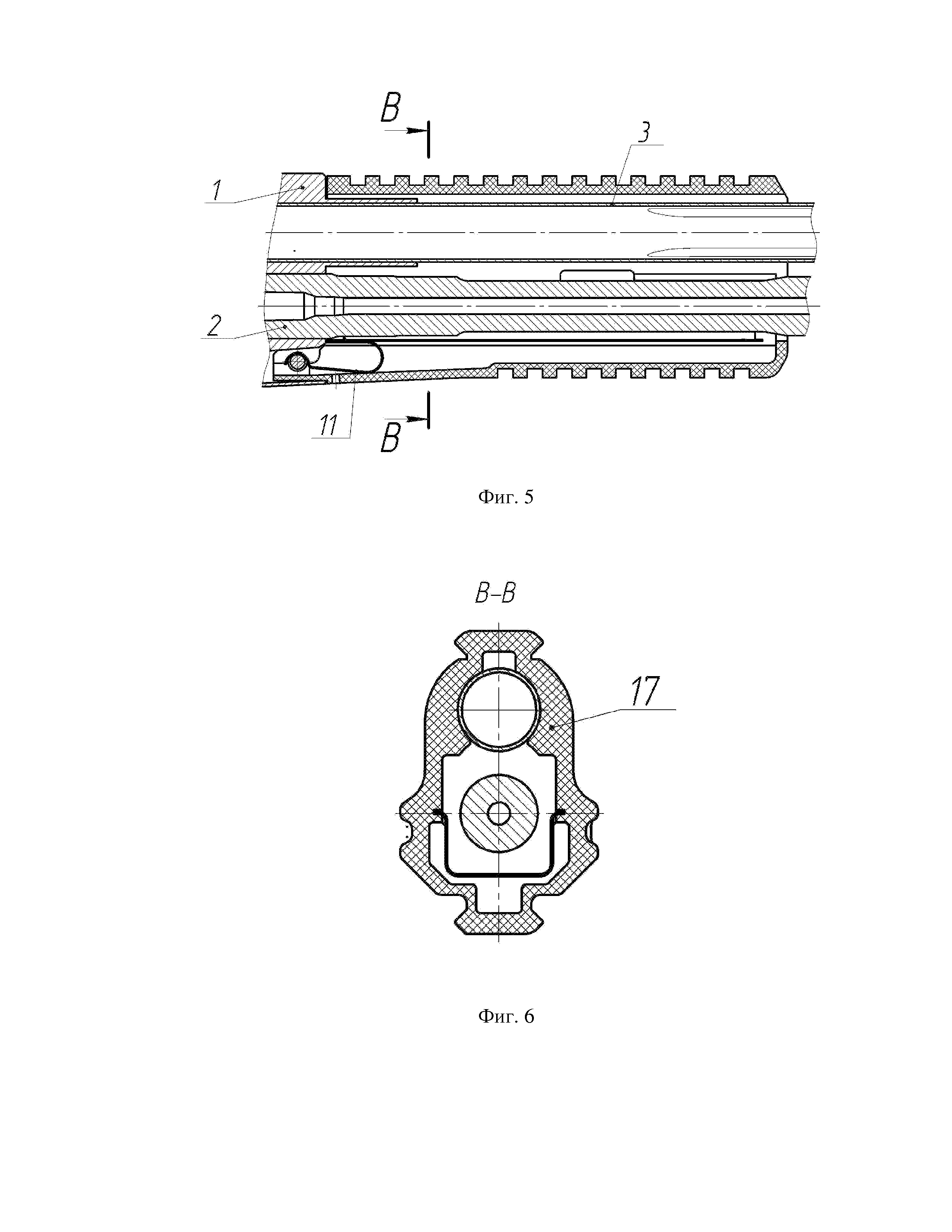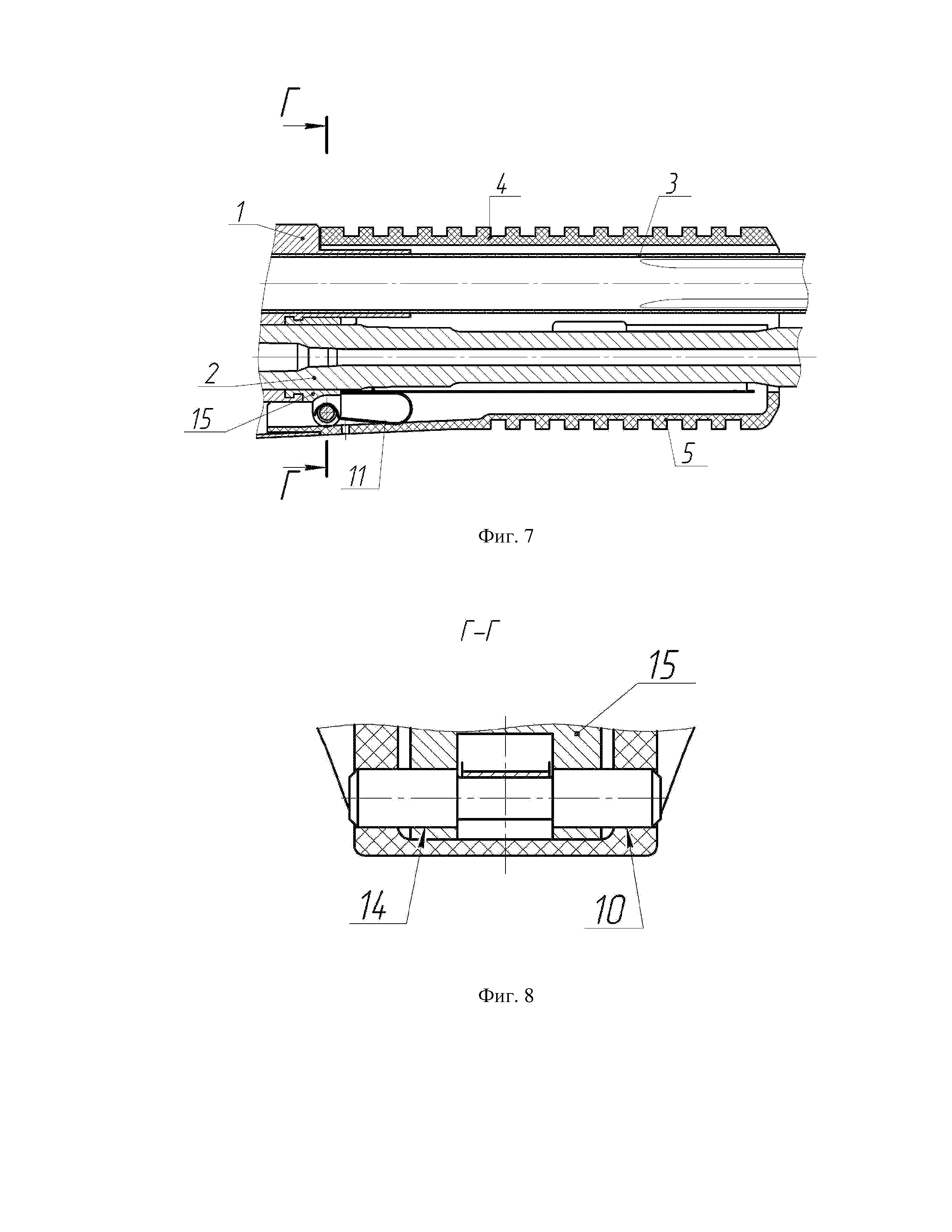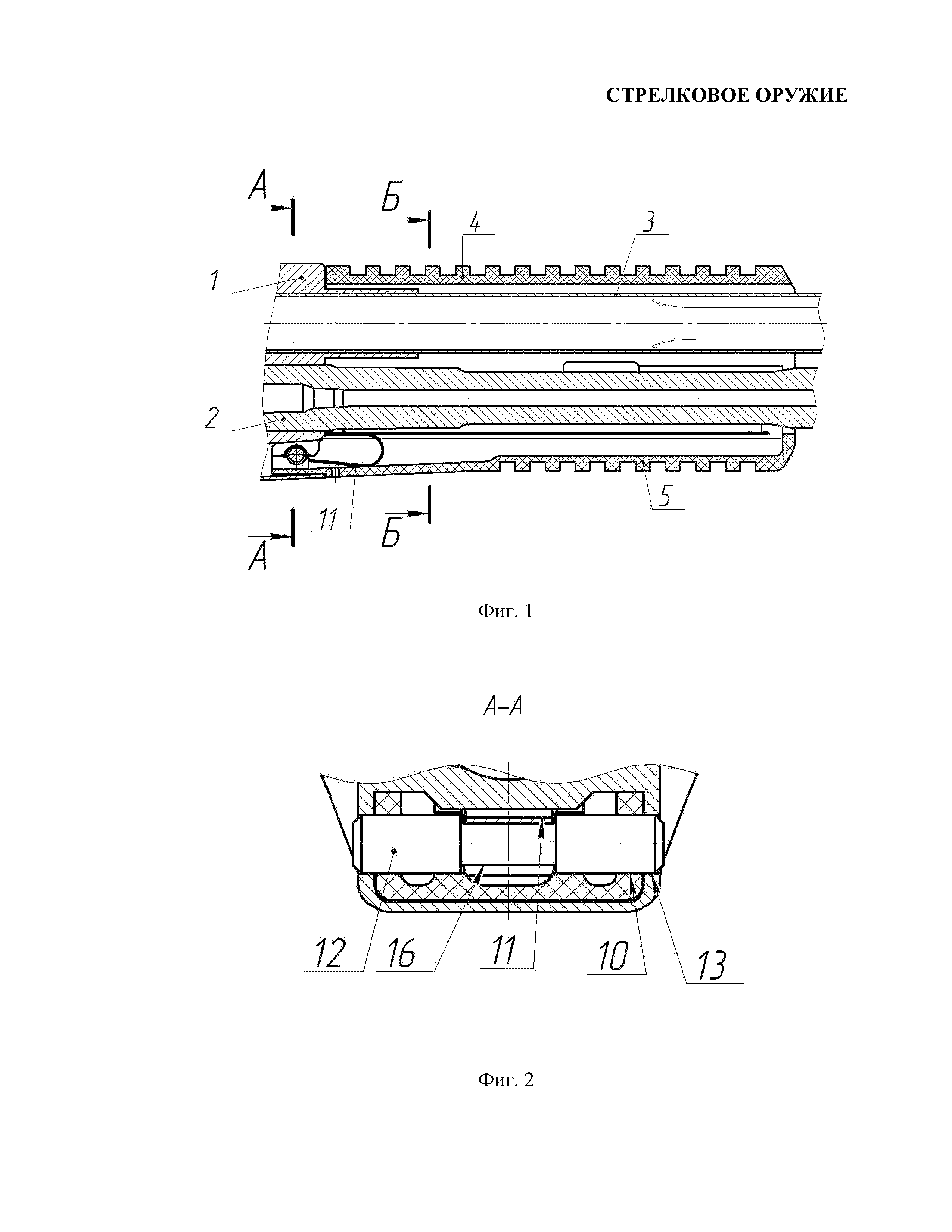 Изобретение относится к стрелковому оружию и может быть использовано в автоматическом стрелковом оружии, устройствах, конструктивно сходных со стрелковым оружием. Известен автомат Калашникова (см. Наставления по стрелковому делу. Военное издательство, М., 1973, с. 148, рис. 25, рис. 36), выбранный в качестве ближайшего аналога, содержащий ствольную коробку, ствол, газовую трубку, накладку, установленную на газовую трубку, цевье. Задний конец цевья устанавливается в отверстие в ствольной коробке, а передний конец закрепляется на стволе при помощи соединительной муфты. Недостатком данной конструкции является то, что цевье в момент выстрела под действием инерционных сил воздействует через соединительную муфту на ствол, изменяет характер его колебаний, тем самым ухудшая кучность стрельбы из оружия. Задачей заявляемого изобретения является улучшение кучности стрельбы, повышение эксплуатационных характеристик стрелкового оружия, в том числе упрощение конструкции и повышение удобства обслуживания оружия. Технический результат заключается в исключении контакта цевья со стволом и, как следствие, в отсутствии влияния на колебания ствола в момент выстрела силы реакции со стороны опоры или рук стрелка, а также в упрощении обслуживания оружия в процессе эксплуатации за счет введения в конструкцию консольного закрепления в ствольной коробке газовой трубки и крепления цевья с накладкой непосредственно к ствольной коробке с обеспечением кольцевого зазора между цевьем и стволом. Поставленная задача достигается тем, что стрелковое оружие содержит ствольную коробку, ствол, газовую трубку, накладку, установленную на газовую трубку, цевье. Газовая трубка закреплена в ствольной коробке консольно, а накладка с цевьем соединены и зафиксированы относительно ствольной коробки посредством оси, взаимодействующей с отверстиями в цевье и ствольной коробке. Цевье установлено с обеспечением кольцевого зазора между внутренней поверхностью цевья и наружной поверхностью ствола. Накладка с цевьем могут быть выполнены в виде единой детали. Стрелковое оружие может дополнительно содержать втулку, неподвижно закрепленную относительно ствольной коробки, а накладка с цевьем зафиксированы относительно ствольной коробки посредством оси, взаимодействующей с отверстиями в цевье и втулке. Сущность изобретения поясняется чертежами, на которых изображено: на фиг. 1 - общий вид оружия (накладка и цевье соединены разъемным соединением, газовая трубка закреплена в ствольной коробке); на фиг. 2 - А-А на фиг. 1 (ось установлена в отверстие цевья и отверстие ствольной коробки); на фиг. 3 - Б-Б на фиг. 1; на фиг. 4 - общий вид оружия (накладка и цевье соединены разъемным соединением, газовая трубка закреплена через муфту в ствольной коробке); на фиг. 5 - общий вид оружия (накладка и цевье выполнены в виде единой детали); на фиг. 6 - В-В на фиг. 5; на фиг. 7 - общий вид оружия (накладка и цевье соединены разъемным соединением, газовая трубка закреплена в ствольной коробке, в ствольной коробке неподвижно закреплена втулка); на фиг. 8 - Г-Г на фиг. 7 (ось установлена в отверстие цевья и отверстие втулки). Стрелковое оружие содержит ствольную коробку 1, ствол 2, газовую трубку 3, накладку 4 и цевье 5. Накладка 4 плотно надевается на газовую трубку 3 и соединена с цевьем 5 разъемным соединением 6, д