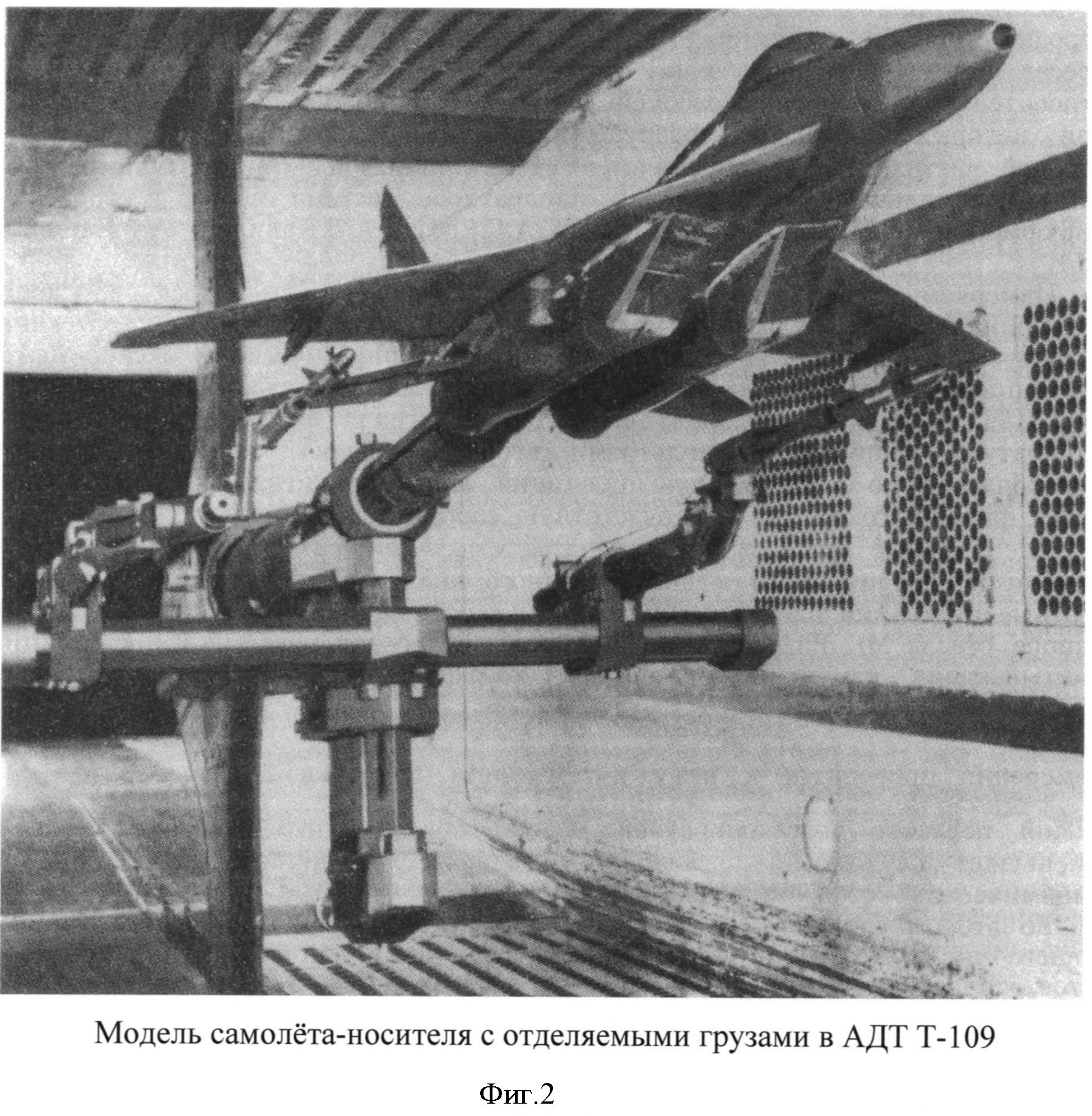 Предлагаемое изобретение относится к измерительной технике, а именно к устройствам для замера в аэродинамической трубе аэродинамических нагрузок, действующих на модель ракеты, прикрепленную к модели самолета-носителя. Это устройство может быть использовано для расчетов по обеспечению безударного, т.е. безопасного, отделения ракеты от самолета-носителя. Известно устройство для определения сил и моментов, действующих на модель в аэродинамической трубе. Это устройство крепится на кормовой державке и содержит модель со съемной головной частью, закрепленную на внутримодельных тензовесах путем посадки ее на коническую часть тензовесов с фиксацией гайкой, соединенных с державкой, установленной в аэродинамической трубе, оснащенной тензостанцией и пультом управления, расположенным в препараторской (Н.Ф. Краснов и др. "Прикладная аэродинамика". Москва, Высшая школа, 1974 г., с. 273-282). Но в этом устройстве, во-первых, не учитывается влияние самолета-носителя на аэродинамические характеристики модели, а, во-вторых, крепление модели на хвостовой державке порождает упругие колебания системы "модель-державка", внося неопределенность в измеряемые величины. Наиболее близким к предлагаемому изобретению по технической сущности является устройство для определения сил и моментов, действующих на модель ракеты при испытаниях в аэродинамической трубе, в которой закреплены на державках с закрепленными на них тензовесами модели ракеты и носителя ракет, причем модели ракет могут изменять положение относительно носителя (ЦАГИ. Основные этапы научной деятельности 1968-1993 г., Москва. Наука. Физматлит., 1996. Рис. 188, стр. 300. Модель самолета-носителя с отделяемыми грузами в АДТ Т-109), см. фигуру 2. Недостатком этого устройства, во первых, является наличие в нем хвостовой державки, на которой закреплена модель ракеты вместе с тензовесами, что оказывает заметное влияние на обтекание воздушным потоком кормовой части модели ракеты и, следовательно, на измеряемые аэродинамические характеристики модели ракеты в целом. Вторым существенным недостатком известного устройства является то, что во время испытаний модели ракеты, механически связанной с помощью хвостовой державки с корпусом модели носителя, возникают упругие колебания системы "модель+тензовесы+державка" с изменением зазора между моделями ракеты и носителя, что также влияет на характер обтекания модели ракеты, снижая точность и достоверность определения ее аэродинамических характеристик. С целью устранения вышеобозначенных недостатков известного устройства предлагается новое техническое решение устройства для определения аэродинамических характеристик модели ракеты авиационного базирования. Суть предлагаемого изобретения состоит в размещении державки, на которой крепится модель ракеты, внутри корпуса модели в отличие от хвостовой державки, используемой в известном устройстве. Размещение державки внутри корпуса модели с ее жестким креплением к модели носителя с помощью двух стержней, расположенных по краям державки, исключает как влияние державки на обтекание модели потоком воздуха, так и возможность упругих колебаний державки, поскольку эта державка является балкой на двух опорах и не подвержена консольным колебаниям. Сущность предлагаемого изобретения поясняется чертежом, где 