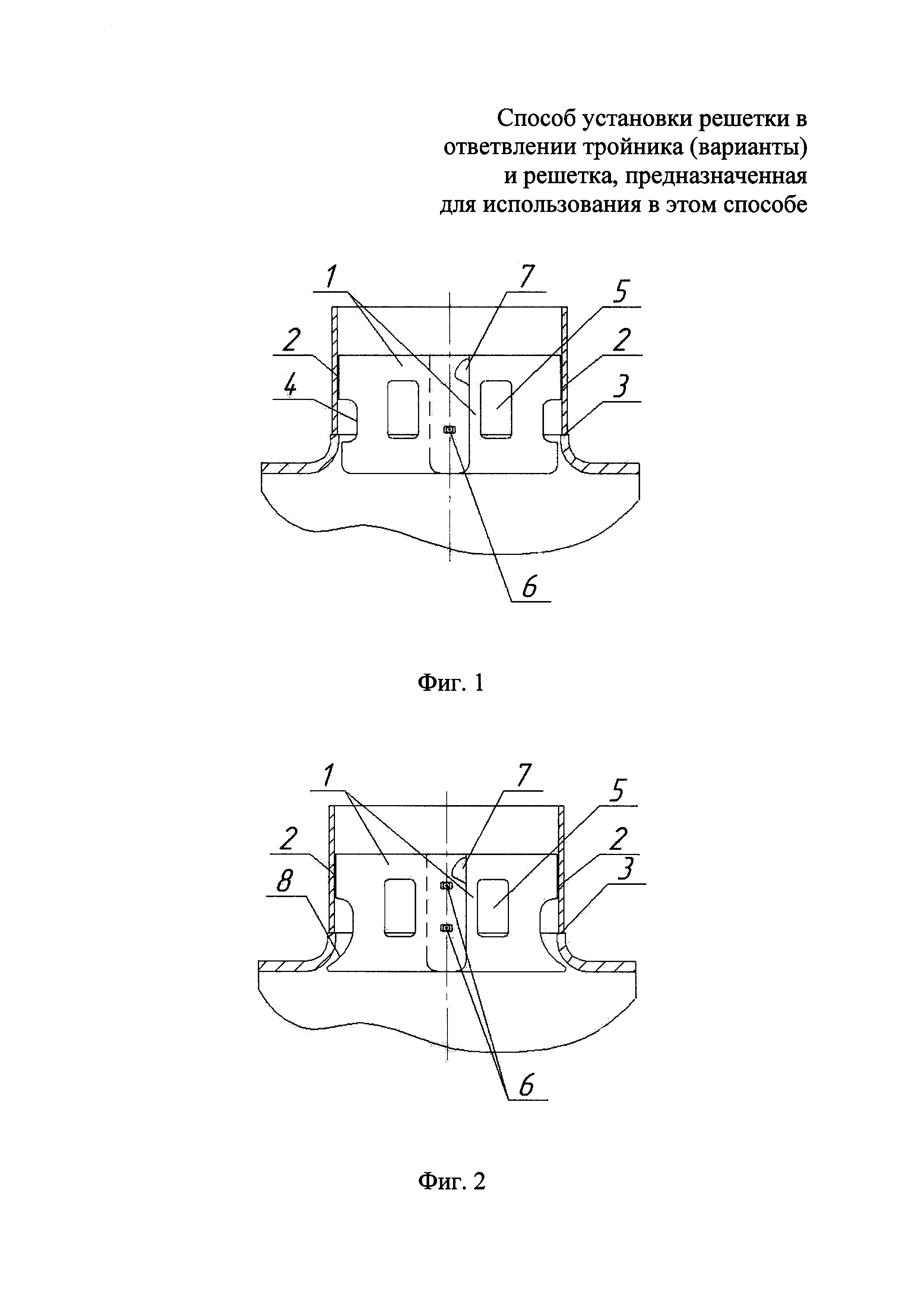 1. Способ установки решетки в ответвлении тройника, состоящей из составных ребер, для защиты магистрального трубопровода, включающий последовательное размещение ребер решетки в ответвлении параллельно оси магистрали тройника с огибанием контура внутренней поверхности магистрали и жесткое закрепление каждого ребра на внутренней поверхности ответвления, отличающийся тем, что после размещения одной части ребра в ответвлении ее закрепляют на внутренней поверхности ответвления, затем устанавливают другую часть ребра путем перемещения относительно предыдущей и после ее закрепления на ответвлении соединяют составные части ребра между собой. 2. Способ по п. 1, отличающийся тем, что составные части ребра соединяют между собой с помощью механических приспособлений. 3. Способ по п. 1, отличающийся тем, что составные части ребра соединяют между собой с помощью сварки. 4. Способ установки решетки в ответвлении тройника, состоящей из составных ребер, для защиты магистрального трубопровода, включающий последовательное размещение ребер решетки в ответвлении параллельно оси магистрали тройника с огибанием контура внутренней поверхности магистрали и жесткое закрепление каждого ребра на внутренней поверхности ответвления, отличающийся тем, что перед размещением в ответвлении тройника осуществляют сборку каждого ребра из составных частей, размещают ребро в ответвлении, последовательно закрепляют на нем части ребра и затем соединяют составные части ребра между собой. 5. Способ по п. 4, отличающийся тем, что составные части ребра соединяют между собой с помощью механических приспособлений. 6. Способ по п. 4, отличающийся тем, что составные части ребра соединяют между собой с помощью сварки. 7. Решетка ответвления тройника, предназначенная для использования в способе по п. 1 или 4, состоящая из ребер с боковыми и рабочими торцами, закрепленных на внутренней поверхности ответвления и установленных параллельно оси магистрали тройника таким образом, что боковые торцы ребер огибают контур ответвления в месте его соединения с магистралью, рабочие торцы ребер огибают контур внутренней поверхности магистрали и выполнены с непрямыми углами, отличающаяся тем, что каждое ребро выполнено составным по меньшей мере из двух частей, соединенных между собой с частичным перекрытием, ребро жестко закреплено с обеих сторон боковыми торцами на внутренней поверхности ответвления, при этом рабочий и боковые торцы ребра в местах пересечения выполнены со скруглением. 8. Решетка по п. 7, отличающаяся тем, что боковые торцы ребра огибают контур внутренней поверхности ответвления и радиусной части магистрали по кривой до ее пересечения с рабочим торцем, при этом длина рабочего торца ребра больше длины торца с противоположной стороны. 9. Решетка по п. 7, отличающаяся тем, что по контуру боковые торцы ребра выполнены с пазами в местах, расположенных напротив соединения ответвления с магистралью. 10. Решетка по п. 7 или 8, отличающаяся тем, что составные части ребра установлены по меньшей мере на одной направляющей с возможностью перемещения относительно друг друга. 11. Решетка по п. 7 или 8, отличающаяся тем, что между составными частями ребра в местах частичного перекрытия размещена демпфирующая прокладка. 12. Решетка по п. 7 или 8, отличающаяся тем, что составная час