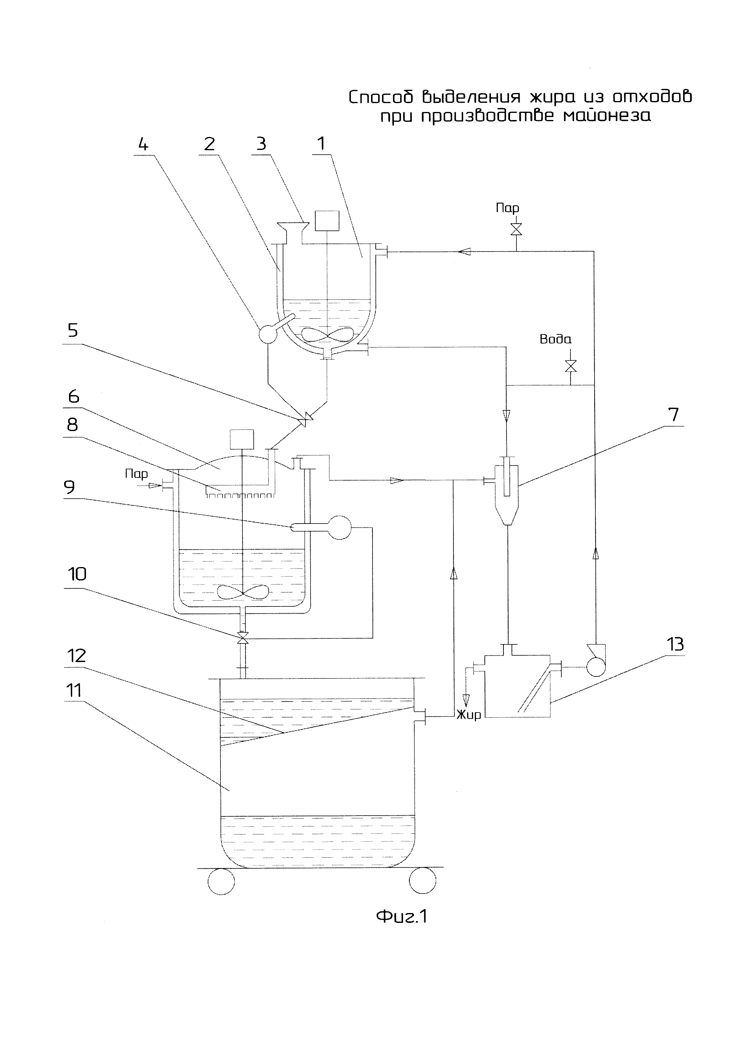 Изобретение относится к масложировой промышленности. Способ выделения жира из отходов при производстве майонеза включает предварительный нагрев отходов до температуры 135°С. Затем под вакуумом отходы диспергируют и подвергают при перемешивании дополнительному нагреву до 99°С. После дополнительного нагрева под вакуумом ведут отделение жира на фильтрующей сетке, расположенной под наклоном 20-30° к горизонтальной оси. Изобретение позволяет увеличить выход жира из отходов при производстве майонеза с 94 до 99%. 1 ил., 1 табл.